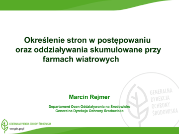 Określenie stron w postępowaniu oraz oddziaływania skumulowane przy farmach wiatrowych Marcin Rejmer Departament Ocen Oddziaływania na Środowisko Generalna Dyrekcja Ochrony Środowiska Wytyczne Generalnej Dyrekcji Ochrony Środowiska Wytyczne w zakresie prognozowania oddziaływań na środowisko farm wiatrowych (Stryjecki, Mielniczuk, Generalna Dyrekcja Ochrony Środowiska 2011 r.) Strona w postępowaniu administracyjnym Ustawa z dnia 14 czerwca 1960 r. Kodeks postępowania administracyjnego (Dz. U. 2013, poz. 267): - art. 28: „Stroną jest każdy, czyjego interesu prawnego lub obowiązku dotyczy postępowanie albo kto żąda czynności organu ze względu na swój interes prawny lub obowiązek” Procedura oceny oddziaływania na środowisko Ustawa z dnia 3 października 2008 r. o udostępnianiu informacji o środowisku i jego ochronie, udziale społeczeństwa w ochronie środowiska oraz o ocenach oddziaływania na środowisko (Dz. U. 2008 Nr 199, poz. 1227, ze zm.): art. 74. 1. Do wniosku o wydanie decyzji o środowiskowych uwarunkowaniach należy dołączyć: (…) 3) poświadczoną przez właściwy organ kopię mapy ewidencyjnej obejmującej przewidywany teren, na którym będzie realizowane przedsięwzięcie, oraz obejmującej obszar, na który będzie oddziaływać przedsięwzięcie; (…) 6) wypis z rejestru gruntów obejmujący przewidywany teren, na którym będzie realizowane przedsięwzięcie, oraz obejmujący obszar, na który będzie oddziaływać przedsięwzięcie (…) Zasięg oddziaływania farm wiatrowych: hałas; ptaki i nietoperze; krajobraz; obszary chronione np. Natura 2000. Wytyczne Generalnej Dyrekcji Ochrony Środowiska: Zaleca się, aby do wniosku dołączać mapy ewidencyjne i wypisy z rejestru gruntów dla terenu objętego bezpośrednim, najbardziej uciążliwym oddziaływaniem farmy, tj. oddziaływaniem akustycznym. Należy pamiętać, że mapy i wypisy z rejestru gruntów powinny obejmować także infrastrukturę towarzyszącą farmy, tj. drogi, kable itd. oraz teren, na który mogą te elementy farmy oddziaływać (tj. przynajmniej działki sąsiednie); Jednakże każda sytuacja musi być rozpatrywana indywidualnie, w oparciu o konkretną sytuację. Na organie prowadzącym postępowanie zawsze ciąży obowiązek ustalenia, w oparciu o materiał dowodowy, kto jest stroną danego postępowania. Oddziaływania skumulowana przy farmach wiatrowych Oddziaływania farm wiatrowych, które mogą się kumulować: hałas; oddziaływanie na krajobraz; oddziaływanie na awifaunę i chiropterofaunę. Wytyczne Generalnej Dyrekcji Ochrony Środowiska: analizie kumulacji wpływu na środowisko należy poddać w szczególności oddziaływania akustyczne, krajobrazowe, awifaunistyczne i chiropterologiczne; przy oddziaływaniach skumulowanych należy brać pod uwagę nie tylko przedsięwzięcia już istniejące, ale również wszystkie te projektowane inwestycje (w tym szczególnie farmy wiatrowe), dla których złożono już przynajmniej wniosek o wydanie decyzji o środowiskowych uwarunkowaniach; należy również w oddziaływaniach skumulowanych rozpatrzeć zapisy miejscowych planów zagospodarowania przestrzennego, które przewidują budowę elektrowni wiatrowych. Ponowna ocena oddziaływania na środowisko Przesłanką wskazującą na konieczność nałożenia w decyzji o środowiskowych uwarunkowaniach obowiązku przeprowadzenia ponownej oceny może być np.: brak możliwości dokonania wystarczającej oceny oddziaływania przedsięwzięcia na środowisko na etapie wydawania decyzji o środowiskowych uwarunkowaniach; możliwość kumulowania się oddziaływań przedsięwzięć znajdujących się na danym obszarze; możliwość oddziaływania przedsięwzięcia na obszary wymagające specjalnej ochrony (w tym obszary Natura 2000 i podlegające innym formom ochrony przyrody). W przypadku, gdy przewidywane znaczące negatywne oddziaływanie skumulowane dotyczy dwóch planowanych przedsięwzięć, dla których toczą się postępowania w sprawie oceny oddziaływania na środowisko i oddziaływanie to nie będzie zminimalizowane za pomocą warunków określonych bezpośrednio w decyzjach, organ powinien nałożyć na inwestorów obowiązek przeprowadzenia ponownej oceny w zakresie badania oddziaływań skumulowanych, ze szczególnym uwzględnieniem tych właśnie przedsięwzięć, co do których przewidywana jest możliwość ponadnormatywnego skumulowanego oddziaływania. W uzasadnieniu decyzji powinna być zawarta informacja o wynikach analizy oddziaływań skumulowanych dla planowanych przedsięwzięć oraz wyjaśnienia dotyczące przyczyny nałożenia obowiązku i zakresu wymaganej ponownej oceny oddziaływania. Ponowna ocena oddziaływania na środowisko – cd. Należy jednak podkreślić, że zgodnie z art. 93 ust. 2 i 3 ustawy z dnia 3 października 2008 r. zakres określania nowych wymagań lub zmiany warunków realizacji planowanego przedsięwzięcia jest znacznie węższy na etapie ponownej oceny oddziaływania niż w czasie wydawania decyzji o środowiskowych uwarunkowaniach. Jeżeli zminimalizowanie znaczącego negatywnego oddziaływania przedsięwzięcia wiązałoby się ze zmianami w projekcie, które wykraczałyby poza ramy wyznaczone w przepisach prawa dla ponownej oceny, mogłoby się okazać, że realizacja przedsięwzięcia jest zależna od uprzedniej zmiany decyzji o środowiskowych uwarunkowaniach. W przypadku braku stwierdzonego postępowanie po ponownej powinno przedsięwzięcia. możliwości zminimalizowania ocenie zakończyć się oddziaływania odmową zgody oddziaływania, na na środowisko realizację Dziękuję za uwagę