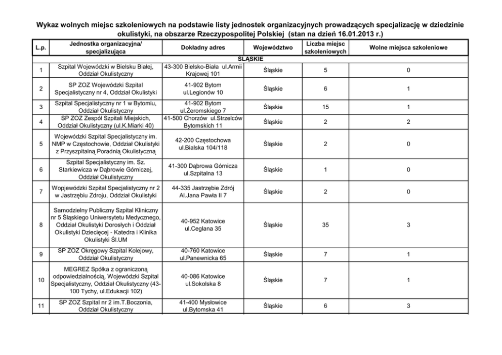 Wykaz wolnych miejsc szkoleniowych na podstawie listy jednostek organizacyjnych prowadzących specjalizację w dziedzinie okulistyki, na obszarze Rzeczypospolitej Polskiej (stan na dzień 16.01.2013 r.) L.p. Jednostka organizacyjna/ specjalizująca Liczba miejsc szkoleniowych Wolne miejsca szkoleniowe 1 Szpital Wojewódzki w Bielsku Białej, Oddział Okulistyczny 5 0 2 SP ZOZ Wojewódzki Szpital Specjalistyczny nr 4, Oddział Okulistyki 41-902 Bytom ul.Legionów 10 Śląskie 6 1 Szpital Specjalistyczny nr 1 w Bytomiu, Oddział Okulistyczny SP ZOZ Zespół Szpitali Miejskich, Oddział Okulistyczny (ul.K.Miarki 40) 41-902 Bytom ul.Żeromskiego 7 41-500 Chorzów ul.Strzelców Bytomskich 11 Śląskie 15 1 Śląskie 2 2 5 Wojewódzki Szpital Specjalistyczny im. NMP w Częstochowie, Oddział Okulistyki z Przyszpitalną Poradnią Okulistyczną 42-200 Częstochowa ul.Bialska 104/118 Śląskie 2 0 6 Szpital Specjalistyczny im. Sz. Starkiewicza w Dąbrowie Górniczej, Oddział Okulistyczny 41-300 Dąbrowa Górnicza ul.Szpitalna 13 Śląskie 1 0 7 Wopjewódzki Szpital Specjalistyczny nr 2 w Jastrzębiu Zdroju, Oddział Okulistyki 44-335 Jastrzębie Zdrój Al.Jana Pawła II 7 Śląskie 2 0 8 Samodzielny Publiczny Szpital Kliniczny nr 5 Śląskiego Uniwersytetu Medycznego, Oddział Okulistyki Dorosłych i Oddział Okulistyki Dziecięcej - Katedra i Klinika Okulistyki Śl.UM 40-952 Katowice ul.Ceglana 35 Śląskie 35 3 9 SP ZOZ Okręgowy Szpital Kolejowy, Oddział Okulistyczny 40-760 Katowice ul.Panewnicka 65 Śląskie 7 1 10 MEGREZ Spółka z ograniczoną odpowiedzialnością, Wojewódzki Szpital Specjalistyczny, Oddział Okulistyczny (43100 Tychy, ul.Edukacji 102) 40-086 Katowice ul.Sokolska 8 Śląskie 7 1 11 SP ZOZ Szpital nr 2 im.T.Boczonia, Oddział Okulistyczny 41-400 Mysłowice ul.Bytomska 41 Śląskie 6 3 3 4 Dokładny adres Województwo ŚLĄSKIE 43-300 Bielsko-Biała ul.Armii Śląskie Krajowej 101 Wykaz wolnych miejsc szkoleniowych na podstawie listy jednostek organizacyjnych prowadzących specjalizację w dziedzinie okulistyki, na obszarze Rzeczypospolitej Polskiej (stan na dzień 16.01.2013 r.) L.p. Jednostka organizacyjna/ specjalizująca Szpital Miejski w Rudzie Ślaskiej Sp. z o.o. NZOZ Szpital Miejski w Rudzie Śląskiej, Oddział Okulistyczny, Przyszpitalna Poradnia Okulistyczna, Przyszpitalna Poradnia Okulistyczna dla Dzieci SPZOZ Wojewódzki Szpital Specjalistyczny nr 3 w Rybniku, Oddział Okulistyczny Dokładny adres Województwo Liczba miejsc szkoleniowych Wolne miejsca szkoleniowe ŚLĄSKIE 41-703 Ruda Śląska ul.W.Lipa 2 Śląskie 1 0 44-200 Rybnik ul.Energetyków 46 Śląskie 5 2 14 Wojewódzki Szpital Specjalistyczny nr 5 im. Św. Barbary w Sosnowcu, Oddział Okulistyczny z Pododdziałem Okulistyki Dziecięcej i Zespołem Zabiegowym 41-200 Sosnowiec Plac Medyków 1 Śląskie 12 0 15 Wielospecjalistyczny Szpital Powiatowy S.A. w Tarnowskich Górach NZOZ Szpital im. dr. B.Hagera , Oddział Okulistyczny 42-612 Tarnowskie Góry ul.Pyskowicka 47-51 Śląskie 2 1 Razem: 108 15 12 13