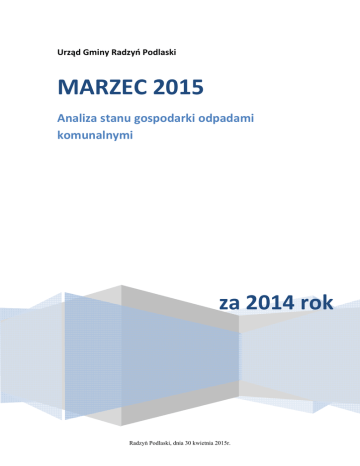 Urząd Gminy Radzyń Podlaski MARZEC 2015 Analiza stanu gospodarki odpadami komunalnymi za 2014 rok Radzyń Podlaski, dnia 30 kwietnia 2015r. I. Podstawa prawna Analizy. Obowiązek sporządzenia analizy stanu gospodarki odpadami komunalnymi wynika z art. 3 ust. 2 pkt. 10 ustawy z dnia 13 września 1996r. o utrzymaniu czystości i porządku w gminach (Dz. U. z 2013r., poz. 1399 z późn. zm.- dalej u.c.p.g.). II. Informacje podstawowe. Gmina Radzyń Podlaski znajduje się na skrzyżowaniu szlaków komunikacyjnych, przy drogach krajowych: Białystok – Lublin – Rzeszów (nr 19) i od przejścia granicznego z Białorusią poprzez Radzyń, Siedlce – Łomżę, Giżycko – do Rosji (nr 63). Gmina rozciąga się pomiędzy 51° 45' a 51° 52' długości geograficznej północnej i 22° 32' a 22° 43' szerokości geograficznej wschodniej. Powierzchnia tego obszaru wynosi 15,517 ha, w tym grunty orne – 7388 ha, sady – 219 ha, łąki trwałe – 1632 ha, pastwiska trwałe – 560 ha, lasy i grunty leśne – 4500 ha i pozostałe grunty pod zabudowaniami, podwórzami, drogi, wody i inne grunty oraz nieużytki – 1218 ha. Gospodarstwa indywidualne – 11072 ha, w tym grunty orne – 7358 ha, sady – 217 ha , łąki trwałe – 1491 ha , pastwiska trwałe – 290 ha, lasy i grunty leśne – 1225 ha i pozostałe grunty pod zabudowaniami, drogi, wody i nieużytki – 491 ha. Jest to druga co do wielkości gmina powiatu Radzyńskiego promieniście otaczająca jego stolicę. Gmina sąsiaduje z 6 gminami: Czemierniki, Wohyń, Drelów, Kąkolewnica, Ulan Majorat i Borki. Zamieszkuje ją ponad 8300 osób. W skład gminy wchodzi 20 sołectw: Biała, Białka, Bedlno, Bedlno Radzyńskie, Branica Radzyńska, Branica Radzyńska-Kolonia, Brzostówiec, Główne, Jaski, Marynin, Paszki Duże, Paszki Małe, Płudy, Radowiec, Siedlanów, Stasinów, Ustrzesz, Zabiele, Zbulitów Duży, Żabików. III. System gospodarki odpadami komunalnymi. Ustawa o utrzymaniu czystości i porządku w gminach wzorując się na doświadczeniach innych krajów europejskich całkowicie zmieniła dotychczasowy system gospodarowania odpadami komunalnymi. Nowy system zakłada, że samorząd, który jest odpowiedzialny za wszystko to, co służy lokalnej społeczności, powinien być również odpowiedzialny Strona | - 1 - za odebranie i właściwe zagospodarowanie odpadów. W nowym systemie gospodarki odpadami komunalnymi gmina ma wpływ na każdy z jego elementów i dzięki temu może kształtować sposób gospodarowania odpadami komunalnymi na swoim terenie. System gospodarowania odpadami komunalnymi w 2014 r. funkcjonował na terenie Gminy Radzyń Podlaski w oparciu o następujące akty prawa miejscowego: - UCHWAŁA NR XXXII/198/2013 RADY GMINY RADZYŃ PODLASKI z dnia 18 listopada 2013 r. w sprawie Regulaminu utrzymania czystości i porządku na terenie Gminy Radzyń Podlaski, - UCHWAŁA NR XXIII/151/2012 RADY GMINY RADZYŃ PODLASKI z dnia 27 grudnia 2012 r. w sprawie odbierania odpadów komunalnych od właścicieli nieruchomości niezamieszkanych, na których powstają odpady komunalne, - UCHWAŁA NR XXXIII/206/2013 RADY GMINY RADZYŃ PODLASKI z dnia 30 grudnia 2013 r. w sprawie szczegółowego sposobu i zakresu świadczenia usług w zakresie odbierania i zagospodarowania odpadów komunalnych od właścicieli nieruchomości, - UCHWAŁA NR XXIII/156/2012 RADY GMINY RADZYŃ PODLASKI z dnia 27 grudnia 2012 r. w sprawie określenia wymagań, jakie powinien spełnić przedsiębiorca ubiegający się o uzyskanie zezwolenia na opróżnianie zbiorników bezodpływowych i transport nieczystości ciekłych, - UCHWAŁA NR XXVII/177/2013 RADY GMINY RADZYŃ PODLASKI z dnia 30 kwietnia 2013 r. w sprawie metody ustalania opłaty za gospodarowanie odpadami komunalnymi oraz stawki opłaty, - UCHWAŁA Nr XXIX/187/2013 RADY GMINY RADZYŃ PODLASKI z dnia 6 sierpnia 2013 r.w sprawie ustalenia terminu, częstotliwości i trybu uiszczania opłaty za gospodarowanie odpadami komunalnymi, - UCHWAŁA NR XXVII/179/2013 RADY GMINY RADZYŃ PODLASKI z dnia 30 kwietnia 2013r.w sprawie wzoru deklaracji o wysokości opłaty za gospodarowanie odpadami komunalnymi. Strona | - 2 - Zgodnie z art. 3 ust. 2 pkt 10 u. c. p. g. jednym z zadań Gminy jest dokonanie corocznej analizy stanu gospodarki odpadami komunalnymi, w celu weryfikacji możliwości technicznych i organizacyjnych Gminy w zakresie gospodarowania odpadami komunalnymi. III. 1. Stan gospodarki odpadami komunalnymi w 2014 r. W okresie od 1 stycznia 2014 r. do 31 grudnia 2014 r. odbiór odpadów komunalnych na terenie Gminy Radzyń Podlaski z nieruchomości zamieszkałych i niezamieszkałych realizowany był przez Przedsiębiorstwo Usług Komunalnych Sp. z o.o., ul. Lubelska 5, 21-300 Radzyń Podlaski. Zagospodarowanie odpadów komunalnych następowało w Zakładzie Zagospodarowania Odpadów Komunalnych (ZZOK) w Adamkach, 21-300 Radzyń Podlaski oraz przez „WOD-KAN” Sp. z o.o. Bialskie Wodociągi i Kanalizacja, ul. Narutowicza 35a, 21-500 Biała Podlaska. W Punktu Selektywnej Zbiórki Odpadów Komunalnych (dalej PSZOK) odpady odbierane i zagospodarowywane przez Lubelską Agencję Ochrony Środowiska S.A. w Świdniku, 21-045 Świdnik, ul. Kuźnicza 15 oraz Polską Grupę Recyklingu PROEKO Sp. z o.o., ul. Sikorskiego 5, 05-119 Legionowo Łajski. III. 2. Stawki opłat. Nowy przyjęty przez Gminę system gospodarki odpadami komunalnymi wiązał się z wprowadzeniem kwartalnej, (z dopuszczeniem wpłat miesięcznych), opłaty uiszczanej na rzecz Gminy Radzyń Podlaski przez właścicieli nieruchomości zamieszkałych i niezamieszkałych. W ramach uchwalonej przez Radę Gminy Uchwały Nr XXVII/177/2013 z dnia 30 kwietnia 2013 r., w sprawie metody ustalania opłaty za gospodarowanie odpadami komunalnymi oraz stawek opłat, należności naliczane były wg gospodarstwa domowego, w zależności od ilości osób wchodzących w jego skład. Stawki opłat uchwalono w następujących wysokościach: • miesięczna s