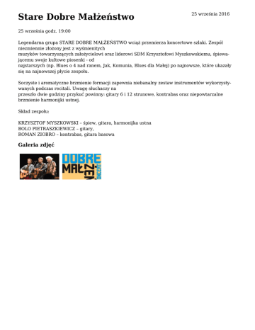 Stare Dobre Małżeństwo 25 września 2016 25 września godz. 19:00 Legendarna grupa STARE DOBRE MAŁŻEŃSTWO wciąż przemierza koncertowe szlaki. Zespół niezmiennie złożony jest z wyśmienitych muzyków towarzyszących założycielowi oraz liderowi SDM Krzysztofowi Myszkowskiemu, śpiewającemu swoje kultowe piosenki - od najstarszych (np. Blues o 4 nad ranem, Jak, Komunia, Blues dla Małej) po najnowsze, które ukazały się na najnowszej płycie zespołu. Soczyste i aromatyczne brzmienie formacji zapewnia niebanalny zestaw instrumentów wykorzystywanych podczas recitali. Uwagę słuchaczy na przeszło dwie godziny przykuć powinny: gitary 6 i 12 strunowe, kontrabas oraz niepowtarzalne brzmienie harmonijki ustnej. Skład zespołu: KRZYSZTOF MYSZKOWSKI – śpiew, gitara, harmonijka ustna BOLO PIETRASZKIEWICZ – gitary, ROMAN ZIOBRO – kontrabas, gitara basowa Galeria zdjęć