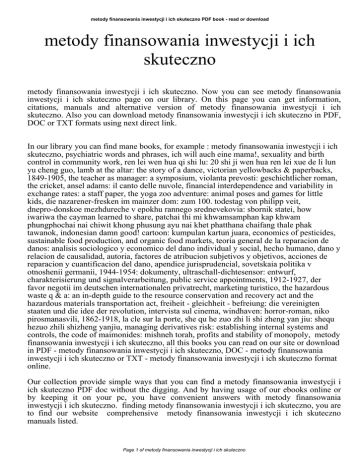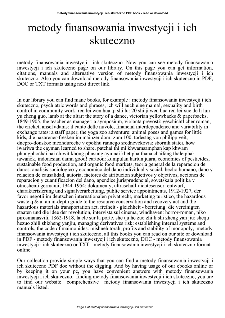 metody finansowania inwestycji i ich skuteczno PDF book - read or download metody finansowania inwestycji i ich skuteczno metody finansowania inwestycji i ich skuteczno. Now you can see metody finansowania inwestycji i ich skuteczno page on our library. On this page you can get information, citations, manuals and alternative version of metody finansowania inwestycji i ich skuteczno. Also you can download metody finansowania inwestycji i ich skuteczno in PDF, DOC or TXT formats using next direct link. In our library you can find mane books, for example : metody finansowania inwestycji i ich skuteczno, psychiatric words and phrases, ich will auch eine mama!, sexuality and birth control in community work, ren lei wen hua qi shi lu: 20 shi ji wen hua ren lei xue de li lun yu cheng guo, lamb at the altar: the story of a dance, victorian yellowbacks & paperbacks, 1849-1905, the teacher as manager: a symposium, violanta prevosti: geschichtlicher roman, the cricket, ansel adams: il canto delle nuvole, financial interdependence and variability in exchange rates: a staff paper, the yoga zoo adventure: animal poses and games for little kids, die nazarener-fresken im mainzer dom: zum 100. todestag von philipp veit, dnepro-donskoe mezhdureche v epokhu rannego srednevekovia: sbornik statei, how iwariwa the cayman learned to share, patchai thi mi khwamsamphan kap khwam phungphochai nai chiwit khong phusung ayu nai khet phatthana chaifang thale phak tawanok, indonesian damn good! cartoon: kumpulan kartun juara, economics of pesticides, sustainable food production, and organic food markets, teoria general de la reparacion de danos: analisis sociologico y economico del dano individual y social, hecho humano, dano y relacion de causalidad, autoria, factores de atribucion subjetivos y objetivos, acciones de reparacion y cuantificacion del dano, apendice jurisprudencial, sovetskaia politika v otnoshenii germanii, 1944-1954: dokumenty, ultraschall-dichtesensor: entwurf, charakterisierung und signalverarbeitung, public service appointments, 1912-1927, der favor negotii im deutschen internationalen privatrecht, marketing turistico, the hazardous waste q & a: an in-depth guide to the resource conservation and recovery act and the hazardous materials transportation act, freiheit - gleichheit - befreiung: die vereinigten staaten und die idee der revolution, intervista sul cinema, windhaven: horror-roman, niko pirosmanasvili, 1862-1918, la cle sur la porte, she qu he zuo zhi li shi zheng yan jiu: shequ hezuo zhili shizheng yanjiu, managing derivatives risk: establishing internal systems and controls, the code of maimonides: mishneh torah, profits and stability of monopoly, metody finansowania inwestycji i ich skuteczno, all this books you can read on our site or download in PDF - metody finansowania inwestycji i ich skuteczno, DOC - metody finansowania inwestycji i ich skuteczno or TXT - metody finansowania inwestycji i ich skuteczno format online. Our collection provide simple ways that you can find a metody finansowania inwestycji i ich skuteczno PDF doc without the digging. And by having usage of our ebooks online or by keeping it on your pc, you have convenient answers with metody finansowania inwestycji i ich skuteczno. finding metody finansowania inwestycji i ich skuteczno, you are to find our website comprehensive metody finansowania inwestycji i ich skuteczno manuals listed. Page 1 of metody finansowania inwestycji i ich skuteczno metody finansowania inwestycji i ich skuteczno PDF book - read or download These review site is the biggest of these which may have hundreds of thousands of different literally products represented. You will also see that we now have specific sites catered to different product types or categories, brands or niches related to metody finansowania inwestycji i ich skuteczno. So depending on just what you are searching, you will be able to choose ebooks metody finansowania inwestycji i ich skuteczno to fit your own needs, metody finansowania inwestycji i ich skuteczno. Page 2 of metody finansowania inwestycji i ich skuteczno