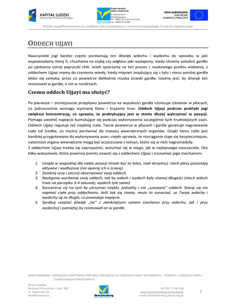 ŚLĄSKI ZWIĄZEK GMIN I POWIATÓW Ul. Stalmacha 17 40-058 Katowice Tel. +4832/ 25 11 021, 25 11 241 Fax. +4832/ 25 10 985 Projekt współfinansowany ze środków Unii Europejskiej w ramach Europejskiego Funduszu Społecznego ODDECH UJJAYI Nauczyciele jogi bardzo często porównują ten dźwięk wdechu i wydechu do sposobu w jaki wypowiadamy literę h, chuchania na szybę czy odgłosu jaki wydajemy, kiedy chcemy ostudzić gardło po zjedzeniu ostrej papryczki chili. Jeżeli spojrzymy na ten proces z naukowego punktu widzenia, z oddechem Ujjayi mamy do czynienia wtedy, kiedy mięsień znajdujący się z tyłu i nieco poniżej gardła lekko się zamyka, przez co powietrze delikatnie muska ścianki gardła. Istotne jest, by dźwięk ten rezonował w gardle, a nie w nozdrzach. Czemu oddech Ujjayi ma służyć? Po pierwsze – zmniejszenie przepływu powietrza na wysokości gardła różnicuje ciśnienie w płucach, co jednocześnie wzmaga wymianę tlenu i krążenie krwi. Oddech Ujjayi podczas praktyki jogi zwiększa koncentrację, co sprawia, że praktykujący jest w stanie dłużej wytrzymać w pozycji. Pomaga uwolnić napięcie kumulujące się podczas wykonywania szczególnie tych trudniejszych asan. Oddech Ujjayi reguluje też ciepłotę ciała. Tarcie powietrza w płucach i gardle generuje nagrzewanie ciała od środka, co można porównać do masażu wewnętrznych organów. Dzięki temu ciało jest bardziej przygotowane do wykonywania asan; ciepło sprawia, że rozciąganie staje się bezpieczniejsze, natomiast organy wewnętrzne mogą być oczyszczane z toksyn, które się w nich nagromadziły. Z oddechem Ujjayi trzeba się zaprzyjaźnić, wsłuchać się w niego, jak w najlepszego nauczyciela. Oto kilka wskazówek, które powinny pomóc oswoić się z oddechem Ujjayi i zrozumieć jego mechanizm. 1. Usiądź w wygodnej dla siebie pozycji (może być to lotos, siad skrzyżny); niech plecy pozostają aktywne i wydłużone (nie opieraj ich o ścianę). 2. Zamknij oczy i zacznij obserwować swój oddech. 3. Następnie wyrównaj swój oddech, tak by wdech i wydech były równej długości (niech wdech trwa na początku 3-4 sekundy; wydech tyle samo) 4. Koncentruj się na tym by utrzymać miękki, jednolity i nie „szarpany” oddech. Staraj się nie napinać ciała przy oddychaniu. Jeśli tak się stanie, może to oznaczać, ze Twoje wdechy i wydechy są za długie, co powoduje napięcie. 5. Spróbuj szeptać dźwięk „ha” z zamkniętymi ustami (zarówno przy wdechu, jak i przy wydechu) i pamiętaj by rezonował on w gardle. BENCHMARKING – NARZĘDZIE EFEKTYWNEJ KONTROLI ZARZĄDCZEJ W URZĘDACH MIAST NA PRAWACH POWIATU, URZĘDACH GMIN I STAROSTWACH POWIATOWYCH Biuro Projektu Budynek Infosystem – pok. 502 Ul. Kopernika 26 40-064 Katowice tel. 032 77 60 160 www.benchmarking.silesia.org.pl e-mail: benchmarking.silesia.org.pl 1 ŚLĄSKI ZWIĄZEK GMIN I POWIATÓW Ul. Stalmacha 17 40-058 Katowice Tel. +4832/ 25 11 021, 25 11 241 Fax. +4832/ 25 10 985 Projekt współfinansowany ze środków Unii Europejskiej w ramach Europejskiego Funduszu Społecznego TROJSTOPNIOWA PRANAYAMA We wszystkich pozycjach: Siad skrzyżny lub siad japoński (pozycja „diamentowa”). Oczy zamknięte. Oddech Ujjayi. Każdą sekwencję wdech-wydech liczymy 4/4/6/2, a więc: 4 (wdech), 4 (wstrzymaj), 6 (wydech), 2 (wstrzymaj). 1. Pozycja pierwsza. Ręce oparte na kościach biodrowych, łokcie skierowane prostopadle do boków ciała (na boki, równolegle do płaszczyzny ciała — uważać na odgięcie to tyłu lub do przodu.) 8 powtórzeń. 2. Pozycja druga. Kciuki wciśnięte w dołki pachowe. Ramiona i przedramiona zgięte i ustawione równolegle do podłogi — uważać na odgięcie w górę lub w dół. 8 powtórzeń. 3. Pozycja trzecia. Dłonie przeniesione do tyłu i oparte na łopatkach, łokcie celują prosto w sufit. 6 powtórzeń. Po wykonaniu serii oddechów w każdej pozycji, robimy chwilę przerwy; ręce odkładamy na uda, wewnętrzną stroną do góry; przenosimy uwagę do wewnątrz, oddychając swobodnie obserwujemy przez kilkanaście sekund odczucia z ciała. BHASTRIKA Siad skrzyżny lub siad japoński (pozycja „diamentowa”). Oczy zamknięte. Wykonujemy 3 serie po 15 oddechów. 1. Pozycja wyjściowa: Ręce z lekko zaciśniętymi pięściami na boki (jak w geście zwycięstwa lub przy podnoszeniu sztangi). 2. Wdech (przez nos): dynamiczne wyrzucenie rąk w górę (nad głowę) z jednoczesny rozprostowaniem palców. 3. Wydech (przez nos, mocno): dynamiczny powrót do pozycji wyjściowej; ręce opadają pod własnym ciężarem (nie trzeba ich mocno ściągać na dół), łokcie lekko uderzają w boki. Po każdej serii robimy chwilę przerwy; ręce odkładamy na uda, wewnętrzną stroną do góry; przenosimy uwagę do wewnątrz, oddychając swobodnie obserwujemy przez kilkanaście sekund odczucia z ciała. BENCHMARKING – NARZĘDZIE EFEKTYWNEJ KONTROLI ZARZĄDCZEJ W URZĘDACH MIAST NA PRAWACH POWIATU, URZĘDACH GMIN I STAROSTWACH POWIATOWYCH Biuro Projektu Budynek Infosystem – pok. 502 Ul. Kopernika 26 40-064 Katowice tel. 032 77 60 160 www.benchmarking.silesia.org.pl e-mail: benchmarking.silesia.org.pl 2