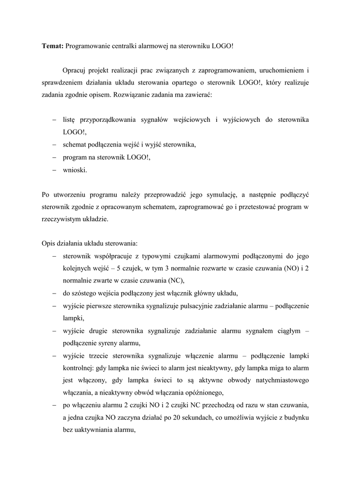 Temat: Programowanie centralki alarmowej na sterowniku LOGO! Opracuj projekt realizacji prac związanych z zaprogramowaniem, uruchomieniem i sprawdzeniem działania układu sterowania opartego o sterownik LOGO!, który realizuje zadania zgodnie opisem. Rozwiązanie zadania ma zawierać: listę przyporządkowania sygnałów wejściowych i wyjściowych do sterownika LOGO!, schemat podłączenia wejść i wyjść sterownika, program na sterownik LOGO!, wnioski. Po utworzeniu programu należy przeprowadzić jego symulację, a następnie podłączyć sterownik zgodnie z opracowanym schematem, zaprogramować go i przetestować program w rzeczywistym układzie. Opis działania układu sterowania: sterownik współpracuje z typowymi czujkami alarmowymi podłączonymi do jego kolejnych wejść – 5 czujek, w tym 3 normalnie rozwarte w czasie czuwania (NO) i 2 normalnie zwarte w czasie czuwania (NC), do szóstego wejścia podłączony jest włącznik główny układu, wyjście pierwsze sterownika sygnalizuje pulsacyjnie zadziałanie alarmu – podłączenie lampki, wyjście drugie sterownika sygnalizuje zadziałanie alarmu sygnałem ciągłym – podłączenie syreny alarmu, wyjście trzecie sterownika sygnalizuje włączenie alarmu – podłączenie lampki kontrolnej: gdy lampka nie świeci to alarm jest nieaktywny, gdy lampka miga to alarm jest włączony, gdy lampka świeci to są aktywne obwody natychmiastowego włączania, a nieaktywny obwód włączania opóźnionego, po włączeniu alarmu 2 czujki NO i 2 czujki NC przechodzą od razu w stan czuwania, a jedna czujka NO zaczyna działać po 20 sekundach, co umożliwia wyjście z budynku bez uaktywniania alarmu, po wejściu do budynku obwód opóźnionego działania pozwala na wyłączenie alarmu przez 20 sekund bez uaktywniania alarmu. Lista przyporządkowania sygnałów wejściowych i wyjściowych do sterownika LOGO!: Schemat podłączenia wejść i wyjść sterownika: Program na sterownik PLC w języku LD: Wnioski: