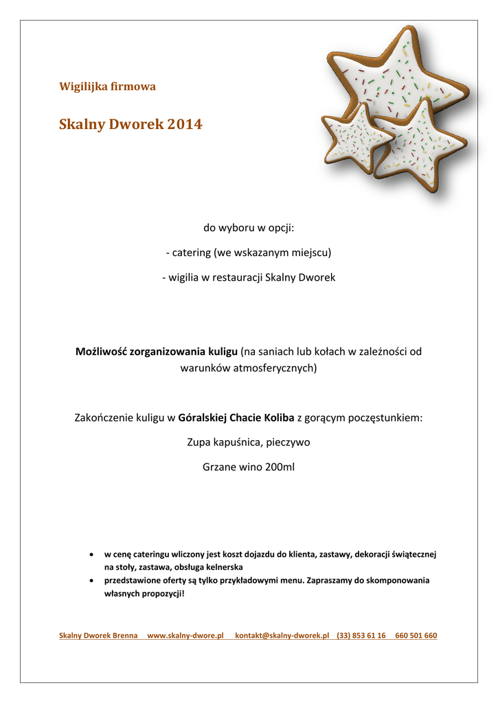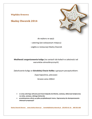 Wigilijka firmowa Skalny Dworek 2014 do wyboru w opcji: - catering (we wskazanym miejscu) - wigilia w restauracji Skalny Dworek Możliwość zorganizowania kuligu (na saniach lub kołach w zależności od warunków atmosferycznych) Zakończenie kuligu w Góralskiej Chacie Koliba z gorącym poczęstunkiem: Zupa kapuśnica, pieczywo Grzane wino 200ml w cenę cateringu wliczony jest koszt dojazdu do klienta, zastawy, dekoracji świątecznej na stoły, zastawa, obsługa kelnerska przedstawione oferty są tylko przykładowymi menu. Zapraszamy do skomponowania własnych propozycji! Skalny Dworek Brenna www.skalny-dwore.pl [email protected] (33) 853 61 16 660 501 660 Propozycja 65zł/os Barszcz czerwony z pasztecikiem Dzwonki karpia w chrupiącej panierce Sałatka jarzynowa Pierogi z kapustą i grzybami Ciasto wigilijne z kawą lub herbatą Makowiec, szarlotka Gwarantujemy: świeże owoce, Woda oraz sok b/o, Coca-Cola 0,2l kompot z suszonych owoców Lampka białego wina do obiadu 200ml Skalny Dworek Brenna www.skalny-dwore.pl [email protected] (33) 853 61 16 660 501 660 Propozycja 90zł/os Przystawka ze śledzia z krążkami cebuli Zupa rybna z pieczarkami Dzwonki karpia panierowane i smażone Sałatka jarzynowa Pierogi z kapustą i grzybami Zimna przekąska: Tymbaliki rybne Deska rozmaitych serów Ryba po grecku Marynaty Pieczywo, masło Ciasto wigilijne z kawą lub herbatą Makowiec, szarlotka, drobne ciasteczka Gwarantujemy: świeże owoce, Woda oraz sok b/o, Coca-Cola 0,2l kompot z suszonych owoców Lampka białego wina do obiadu 200ml Skalny Dworek Brenna www.skalny-dwore.pl [email protected] (33) 853 61 16 660 501 660