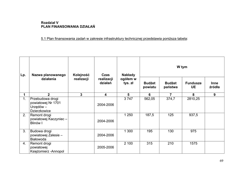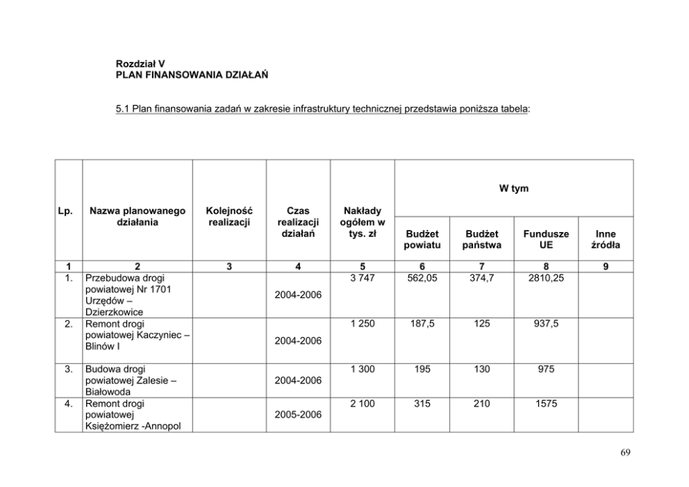 Rozdział V PLAN FINANSOWANIA DZIAŁAŃ 5.1 Plan finansowania zadań w zakresie infrastruktury technicznej przedstawia poniższa tabela: W tym Lp. 1 1. 2. 3. 4. Nazwa planowanego działania 2 Przebudowa drogi powiatowej Nr 1701 Urzędów – Dzierzkowice Remont drogi powiatowej Kaczyniec – Blinów I Budowa drogi powiatowej Zalesie – Białowoda Remont drogi powiatowej Księżomierz -Annopol Kolejność realizacji 3 Czas realizacji działań Nakłady ogółem w tys. zł 4 Budżet powiatu Budżet państwa Fundusze UE Inne źródła 5 3 747 6 562,05 7 374,7 8 2810,25 9 1 250 187,5 125 937,5 1 300 195 130 975 2 100 315 210 1575 2004-2006 2004-2006 2004-2006 2005-2006 69 1 5. 6. 7. 8. 9. 2 Budowa drogi powiatowej Mniszek Kosin Remont ulicy Krasińskiego na odcinku od ulicy Słowackiego do ulicy Kwiatkowskiego na długości 0,851 km Remont ulicy Słowackiego na długości 1,15 km Remont ulicy Kolejowej na długości 2,35 km Budowa ulicy Tysiąclecia na odcinku 3,30 km Razem 3 4 5 670 6 100,5 7 67 8 502,5 510 76,5 51 382,5 980 147 98 735 1410 211,5 141 1057,5 5000 750 500 3750 16 967 2 545,05 1 696,7 12 725,25 9 2004-2006 2006-2007 2006-2007 2006-2007 rozp. 2007 realizacja 2007-2010 70 5.2. Plan finansowania zadań w zakresie infrastruktury społecznej przedstawia poniższa tabela: W tym Lp. 1 1. 2. 3. 4. Nazwa planowanego działania Kolejność realizacji Czas realizacji działań Nakłady ogółem w tys. zł Budżet powiatu Budżet państwa 2 3 4 5 6 7 Samodzielny Publiczny Zakład Opieki Zdrowotnej w Kraśniku Modernizacja kotłowni + termomodernizacja budynków + wymiana 2004-2006 10 000 1 500 instalacji co w budynku przy ulicy Chopina 13 Założenie szpitalnego systemu informatycznego Adaptacja oddziałów i remont instalacji sanitarnej i elektrycznej w budynku gł. Szpitala Powiatowego, ul. Chopina 13 Zakup 2 samochodów sanitarnych 2004-2005 800 200 2004-2006 3 000 750 2004 200 50 Fundusze UE Inne źródła 8 9 7 500 1 000 600 2 250 150 71 1 5. 6. 2 Zakup sprzętu i aparatury medycznej: -aparat rentgenowski – ramię C -kardiomonitory -ssaki operacyjne -ssaki przenośne -holter -myjka do aparatów endoskopowych -pompy infuzyjne -respirator przenośny Modernizacja kuchni Szpitala Powiatowego, ul. Chopina 13 3 4 5 6 7 8 2004-2005 800 200 600 2005-2006 300 75 225 9 Zespół Szkół Nr 3 w Kraśniku 7. Modernizacja wymiennikowni c.o. 8. Remont budynku szkoły i świetlicy przy ulicy Słowackiego 7 9. Remont internatu 10. Modernizacja hali sportowej z łącznikiem + modernizacja instalacji grzewczej w hali 11. Remont łącznika do stołówki 12. Wymiana pokrycia dachowego wraz z dociepleniem stropu w budynku szkoły przy ulicy Kościuszki 23 2005-2006 70 17,5 52,5 2005-2006 403,8 100,95 302,85 2005-2007 371,5 92,87 278,63 2005-2007 617 154,25 462,75 2005 49,7 12,42 Zespół Szkół Nr 4 w Kraśniku 37,28 2004-2005 156,5 39,13 117,37 72 1 2 13. Wymiana stolarki okiennej i drzwiowej w budynku szkoły 14. Docieplenie ścian zewnętrznych budynku wraz z izolacją p/wilgociową piwnic wraz z instalacją windy zewnętrznej w budynku przy ulicy Kościuszki 23 3 4 5 6 7 2004 138 100 38 2006 454 113,5 8 9 340,5 Powiatowe Centrum Pomocy Rodzinie 15. Wyposażenie Centrum Kompleksowej Rehabilitacji w Kraśniku w sprzęt rehabilitacyjny 2005 218,7 40 178,7 Dom Pomocy Społecznej w Gościeradowie 16. Wymiana stolarki okiennej w budynku DPS 17. Instalacja windy w budynku 18. Budowa 6 domków jednorodzinnych – 10 osobowych dla wychowanków przy DPS 19. Budowa 5 garaży przy Domu Pomocy Społecznej w Gościeradowie + budowa wiaty z przeznaczeniem na hipodrom 2004-2005 102,5 20,5 82 2005 200 25 175 2006-2008 10 000 2 500 7 500 2006-2007 1000 250 750 Dom Pomocy Społecznej w Popkowicach 20. Zakup samochodu przystosowanego do przewozu osób niepełnosprawnych 2005 130 40 90 73 1 2 21. Instalacja windy w budynku DPS 3 4 5 6 2005 300 75 7 8 9 225 Rodzinny Dom Dziecka w Kraśniku 22. Budowa budynku mieszkalnego dla Rodzinnego Domu Dziecka w Kraśniku 2005-2006 600 150 450 Dom Pomocy Społecznej w Kraśniku 23. Instalacja windy w budynku DPS 24. Rozbudowa budynku ulicy Oboźnej 36 przy Razem 2005 183 45,75 137,25 2006-2008 1 206 301,5 904,5 31 300,7 6 853,37 1 913,7 21 533,63 1 000 74 Zestawienie programów na pozyskanie pozalimitowych środków finansowych na aktywne formy przeciwdziałania bezrobociu na 2005 r. i I-sze półrocze 2006 r. Tabela nr 8 MGP – Ministerstwo Gospodarki Pracy ARiMR – Agencja Restrukturyzacji i Modernizacji Rolnictwa Nazwa progarmu Rodzaj aktywnych form Kwota ogółem w tys. zł Środki na staże na 2005 r. w tys. zł Środki na staże na I półrocze 2006 r. w tys. zł Środki na szkolenia na 2005 r. w tys. zł Środki na szkolenia na I półrocze 2006 r. w tys. zł Środki na prace interwencyjne na 2005 r. w tys. zł Środki na prace interwencyjne na I półrocze 2006 r. w tys. zł Środki na pożyczki na 2005 r. w tys. zł Środki na pożyczki na I półrocze 2006 r. w tys. zł Środki na roboty publiczne na 2005 r. w tys. zł Program EFS „Absolwenci na start” Program EFS dla Długotrwale Bezrobotnych „Nowa szansa” 1600 910 Program „Krok w stronę pracy” z rezerwy MGP Ogółem Realizacja 1272 - Szacowany limit FP Obsługa porozumienia MGPiPS i ARiMR na 2005-2006 r. 4040 1800 1010 487 7922 3188 2005 - 2006 2005 594 - 800 - 1394 I półrocze 2006 60 101 100 9 270 2005 36 64 40 - 140 I półrocze 2006 - 439 500 223 1162 2005 - 293 200 - 493 I półrocze 2006 - 375 150 - 525 2005 - - 50 - 50 I półrocze 2006 - - 400 291 691 2005 75