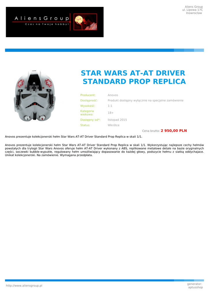 Aliens Group ul. Lipowa 17C Inowrocław STAR WARS AT-AT DRIVER STANDARD PROP REPLICA Producent: Anovos Dostępność: Produkt dostępny wyłącznie na specjalne zamówienie Wysokość: 1:1 Kategoria wiekowa: 18+ Dostępny od*: listopad 2015 Status: Wkrótce Cena brutto: 2 950,00 PLN Anovos prezentuje kolekcjonerski hełm Star Wars AT-AT Driver Standard Prop Replica w skali 1/1. Anovos prezentuje kolekcjonerski hełm Star Wars AT-AT Driver Standard Prop Replica w skali 1/1. Wykorzystując najlepsze cechy hełmów powstałych dla trylogii Star Wars Anovos oferuje hełm AT-AT Driver wykonany z ABS, replikowane metalowe detale na bazie oryginalnych części, soczewki bubble-wypukłe, regulowany hełm umożliwiający dopasowanie do każdej głowy, podszycie hełmu z siatką oddychajace. Unikat kolekcjonerski. Na zamówienie. Wymagana przedpłata. http://www.aliensgroup.pl generator: aptusshop