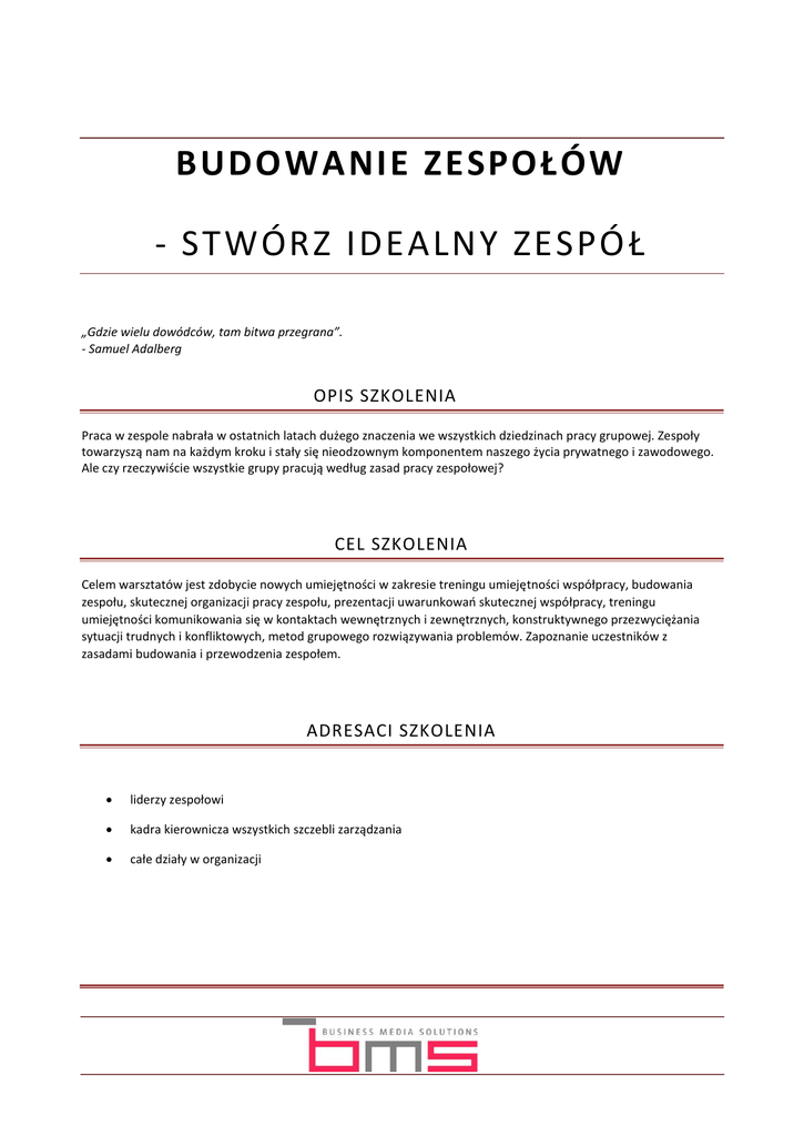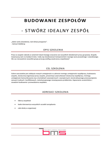 BUDOWANIE ZESPOŁÓW - STWÓRZ IDEALNY ZESPÓ Ł „Gdzie wielu dowódców, tam bitwa przegrana”. - Samuel Adalberg OPIS SZKOLENIA Praca w zespole nabrała w ostatnich latach dużego znaczenia we wszystkich dziedzinach pracy grupowej. Zespoły towarzyszą nam na każdym kroku i stały się nieodzownym komponentem naszego życia prywatnego i zawodowego. Ale czy rzeczywiście wszystkie grupy pracują według zasad pracy zespołowej? CEL SZKOLENIA Celem warsztatów jest zdobycie nowych umiejętności w zakresie treningu umiejętności współpracy, budowania zespołu, skutecznej organizacji pracy zespołu, prezentacji uwarunkowań skutecznej współpracy, treningu umiejętności komunikowania się w kontaktach wewnętrznych i zewnętrznych, konstruktywnego przezwyciężania sytuacji trudnych i konfliktowych, metod grupowego rozwiązywania problemów. Zapoznanie uczestników z zasadami budowania i przewodzenia zespołem. ADRESACI SZKOLENIA liderzy zespołowi kadra kierownicza wszystkich szczebli zarządzania całe działy w organizacji KORZYŚCI: Uczestnicy nauczą się: Umiejętności tworzenia i budowania mocnych zespołów Rozumienia jakości pracy zespołowej Wypracowania skutecznych zasad współpracy w zespole Doskonalenia umiejętności komunikacji interpersonalnej Poznają konstruktywne metody rozwiązywania konfliktów METODOLOGIA W szkoleniu wykorzystujemy różne formy aktywności edukacyjnej jak ćwiczenia w zespołach, w parach, dyskusje, moderacje, prezentacje, gry, symulacje, casy przeplatane mini wykładami. Największą wartością w szkoleniu z są symulacje prowadzone na praktycznych przykładach. PROGRAM 2 DNI DZIEŃ 1 Skuteczny zespół - budowanie zespołu Po czym poznać, że grupa jest zespołem. Fazy rozwoju grupy. Cykle pracy zespołowej (inicjatywa, tworzenie alternatywnych rozwiązań, koordynacja, realizacja). Generowanie skutecznych działań adekwatnych do fazy grupowej. Cechy charakterystyczne dla efektywnych i dysfunkcyjnych zespołów Znaczenie wspólnoty celów, przepływu informacji, elastyczności, jasnych oczekiwań, umiejętności rozwiązywania konfliktów dla efektywności zespołu Znaczenie komunikacji w procesie rozwoju zespołu i udzielanie informacji zwrotnych Czym jest optymalna komunikacja w zespole Czynniki utrudniające komunikację w zespole W jaki sposób udzielać informacji zwrotnej aby okazała się ona czytelna, przejrzysta i nie spowodowała nadinterpretacji, a pełniła funkcję motywującą Style w komunikacji: Rodzaje stylów w komunikowaniu się. Rozpoznawanie stylów komunikacyjnych. Sposoby komunikowania się z osobami przejawiającymi różne style gwarancją porozumienia Tworzenie informacji zwrotnej: Model informacji zwrotnej Ocenianie – wpływ na jasność przekazu. Schemat rozmowy z feedbackiem. DZIEŃ 2 Style zachowania, role grupowe i poczucie współodpowiedzialności Role grupowe (naturalny lider, siewca idei, człowiek akcji, człowiek kontaktów, dusza zespołu, perfekcjonista, sędzia, praktyczny organizator) Role grupowe związane z realizacją zadań (odkrywanie, wiązanie, porządkowanie, ponaglanie, udzielanie informacji, szukanie informacji, wyrażanie opinii, pytanie o opinię, delegowanie zadań) Skuteczne motywowanie i nastawienie na osiąganie celów Radzenie sobie z sytuacjami trudnymi w zespole, kreatywne metody rozwiązywania problemów Wybrane zachowania utrudniające dobre funkcjonowanie zespołu (agresja, zależność, dominacja, blokowanie, szukanie uznania) Rola burzy mózgów i otwartości w przezwyciężaniu problemów, metoda „6 kapeluszy