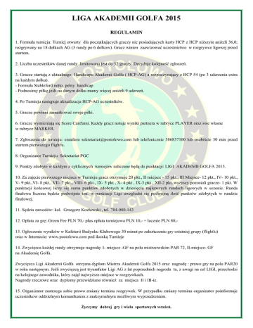 LIGA AKADEMII GOLFA 2015 REGULAMIN 1. Formuła turnieju: Turniej otwarty dla początkujących graczy nie posiadających karty HCP z HCP niższym aniżeli 36,0; rozgrywany na 18 dołkach AG (3 rundy po 6 dołkow). Gracz winien zaawizować uczestnictwo w rozgrywce ligowej przed startem. 2. Liczba uczestników danej rundy limitowana jest do 32 graczy. Decyduje kolejność zgłoszeń. 3. Gracze startują z aktualnego Handicapu Akademii Golfa ( HCP-AG) a rozpoczynający z HCP 54 (po 3 uderzenia extra na każdym dołku). - Formuła Stableford netto, pełny handicap - Podnosimy piłkę jeśli na danym dołku mamy więcej aniżeli 9 uderzeń. 4. Po Turnieju następuje aktualizacja HCP-AG uczestników. 5. Gracze powinni zamarkować swoje piłki. 6. Gracze wymieniają się Score Card'ami. Każdy gracz notuje wyniki partnera w rubryce PLAYER oraz swe własne w rubryce MARKER. 7. Zgłoszenia do turnieju: emailem [email protected] lub telefonicznie 586837100 lub osobiście 30 min przed startem pierwszego flight'u. 8. Organizator Turnieju: Sekretariat PGC 9. Punkty zdobyte w każdym z cyklicznych turniejów zaliczane będą do punktacji: LIGI AKADEMII GOLFA 2015. 10. Za zajęcie pierwszego miejsca w Turnieju gracz otrzymuje 20 pkt., II miejsce - 15 pkt., III Miejsce- 12 pkt., IV- 10 pkt., V- 9 pkt.,VI- 8 pkt., VII- 7 pkt., VIII- 6 pkt., IX- 5 pkt , X- 4 pkt , IX-3 pkt , XII-2 pkt, wszyscy pozostali gracze- 1 pkt. W punktacji końcowej liczy się suma punktów zdobytych w dziesięciu najlepszych rundach ligowych w sezonie. Runda finałowa liczona będzie podwójnie tzn. w punktacji Ligi uwzgledni się podwójną ilość punktów zdobytych w rundzie finałowej. 11. Sędzia zawodów: kol. Grzegorz Kozłowski , tel. 784-080-143 12. Opłata za grę: Green Fee PLN 70,- plus opłata turniejowa PLN 10,- = łacznie PLN 80,13. Ogłoszenie wyników w Kafeterii Budynku Klubowego 30 minut po zakończeniu gry ostatniej grupy (flight'u) oraz w Internecie: www.postolowo.com pod ikonką Turnieje 14. Zwycięzca każdej rundy otrzymuje nagrodę: I- miejsce -GF na polu mistrzowskim PAR 72, II-miejsce- GF na Akademię Golfa. Zwycięzca Ligi Akademii Golfa otrzyma dyplom Mistrza Akademii Golfa 2015 oraz nagrodę : prawo gry na polu PAR20 w roku następnym. Jeśli zwycięzcą jest tryumfator Ligi AG z lat poprzednich nagroda ta, z uwagi na cel LIGI, przechodzi na kolejnego zawodnika, który zajął najwyższe miejsce w rozgrywkach. Nagrody rzeczowe oraz dyplomy przewidziano również za miejsca II i III-ie. 15. Organizator zastrzega sobie prawo zmiany terminu rozgrywek. W przypadku zmiany terminu organizator poinformuje uczestnikow oddzielnym komunikatem z maksymalnym możliwym wyprzedzeniem. Życzymy dobrej gry i wielu sportowych wrażeń.
