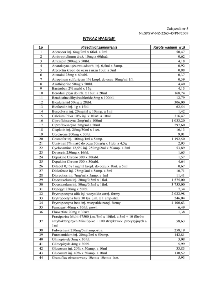 Załącznik nr 5 Nr:SPSW-NZ-2265-45/PN/2009 WYKAZ WADIUM Lp Przedmiot zamówienia 1 2 3 4 5 6 7 8 9 10 11 12 13 14 15 16 17 18 19 20 21 22 23 24 25 26 27 28 29 30 31 32 33 34 35 36 Adenocor inj. 6mg/2ml x 6fiol. a 2ml Amitryptylinum draż. 10mg x 60draż. Amizepin 200mg x 50tbl. Anatoksyna tężcowa adsorb. inj. 0,5ml x 3amp. Atecortin kropl. do oczu i uszu 1but. a 5ml Atenolol 25mg x 60tabl. Atropinum sulfuricum 1% kropl. do oczu 10mg/ml 1fl. Azathioprine 50mg x 50tbl. Bactroban 2% maść x 15g Berodual płyn do inh. x 1but. a 20ml Betahistine dihydrochloride 8mg x 100tbl. Bicalutamid 50mg x 28tbl. Biofazolin inj. 1g x 1fiol. Buscolysin inj. 20mg/ml x 10amp. a 1ml Calcium Pliva 10% inj. x 10szt. a 10ml Ciprofloksacyna 2mg/ml a 100ml Ciprofloksacyna 2mg/ml a 50ml Cisplatin inj. 25mg/50ml x 1szt. Cordarone 200mg x 30tbl. Cosmofer inj. 100mg/1ml a 5amp. Cusiviral 3% maść do oczu 30mg/g x 1tub. a 4,5g Cyclonamine 12,5% inj. 250mg/2ml x 50amp. a 2ml Davercin 250mg x 16tbl. Depakine Chrono 300 x 30tabl. Depakine Chrono 500 x 30tabl. Difadol 0,1% 1mg/ml kropl. do oczu x 1but. a 5ml Diclofenac inj. 75mg/3ml x 5amp. a 3ml Diprophos inj. 7mg/ml x 5amp. a 1ml Docetaxelum inj. 20mg/0,5ml x 1fiol. Docetaxelum inj. 80mg/0,5ml x 1fiol. Dopegyt 250mg x 50tbl. Erytropoetyna alfa inj. wszystkie zarej. formy Erytropoetyna beta 30 tys. j.m. x 1 amp-strz. Erytropoetyna beta inj. wszystkie zarej. formy Famogast 40mg x 30tbl. powl. Fluoxetine 20mg x 30szt. Fraxiparine Multi 47500 j.m./5ml x 10fiol. a 5ml + 10 filtrów antybakteryjnych Mini Spike + 100 strzykawek precyzyjnych a 1ml Fulwestrant 250mg/5ml amp.-strz. Furosemidum inj. 20mg/2ml x 50amp. Glimepiryde 3mg x 30tbl. Glimepiryde 4mg x 30tbl. Glucosum inj. 20% x 50amp. a 10ml Glucosum inj. 40% x 50amp. a 10ml Granuflex obramowany 10cm x 10cm x 1szt. 37 38 39 40 41 42 43 44 Kwota wadium w zł 50,47 0,62 4,18 0,92 0,88 0,37 0,39 4,40 4,13 168,74 12,79 306,00 62,54 1,42 316,47 1 033,20 297,60 16,13 9,91 1 192,50 2,93 53,89 1,65 1,57 4,64 0,67 10,71 11,41 1 575,00 3 753,00 7,34 2 022,98 246,04 4 100,63 6,49 1,38 58,63 258,19 142,81 3,08 5,99 33,83 130,52 5,93 45 46 47 48 49 50 51 52 53 54 55 56 57 58 59 60 61 62 63 64 65 66 67 68 69 70 71 72 73 74 75 76 77 78 79 80 81 82 83 84 85 86 87 88 89 90 91 92 93 94 95 Heviran 800mg x 30tbl. Hparinum sodium inj. 25000j.m./5ml x 10fiol. Humira inj. 0,04g/8ml x 2 amp.-strz. Hydroxyzinum h/chloridum tbl. powl. 25mg opak. Ibuprofenum tabl. 200mg x 60tabl. Intralipid 10% a 100ml Leucovorin Ca inj. 10mg x 10szt. Levonor inj. 4mg/4ml x 5amp. a 4ml Lignocainum h/chloricum 1% inj. 10mg/ml x 10amp. a 2ml Lignocainum h/chloricum 1% inj. 200mg/20ml x 5amp. Lignocainum h/chloricum 2% inj. 20mg/ml x 10amp. a 2ml Lokren 20mg x 28tbl. Luminalum tabl. 100mg x 10tabl. Luminalum tabl. 15mg x 10tabl. Luteina tabl. dopochw. 50mg x 30tabl. Luteina tabl. podjęz. 50mg x 30tabl. Majamil 25mg x 20tbl. powl. Majamil 50mg x 20tbl. powl. Majamil prolong. 100mg x 20tbl. powl. Maxipime 2000mg x 1fiol. Meronem inj. 1000mg x 10fiol. Methotrexate 2,5mg x 50tbl. Methotrexate sodium inj. 10mg/ml x 10amp. a 1ml Methotrexate sodium inj. 50mg x 5szt. Mianserinum h/chloridum tabl. 30mg x 30tbl Mircera x amp.strz. Mononit 10mg x 60tbl. Mononit retard 100 100mg x 30tabl. Nifuroksazyd zaw. (220mg/5ml) x 1but. Norcuron inj. 4mg x 50amp. ( subst. + rozp.) Paracetamol 500mg x 10tbl. Paski testowe ACCU-CHEK ACTIVE GLUCOSE x 50 Piracetamum inj. 3g/15ml x 12amp. Polocard 150mg x 50tbl. Pyralgin 500mg x 10tbl. Relanium inj. 10mg/2ml x 50amp. a 2ml Remikade inj. 100mg x 1fiol. Sevorane płyn wziewny x 1but. a 250ml * Soluvit N inj. x 10fiol. a 10ml Sotalol h/chloride tabl. 80mg x 20tabl. Sulfacetamidum gutt. opht. 100mg/ml x 12pojm. a 0,5ml Sulfasalazin EN x 100tbl. Tardyferon 80mg x 30tbl. Targocid inj. 400mg x 1fiol. Thiocodin tbl. x 10tbl. Tialorid x 50tbl. Topotecanum 4 mg 1 fiol. Tramadolum h/chloridum 100mg x 10tbl. o przed. dział. Tropicamidum 1% kropl. do oczu 10mg/ml 2but. a 5ml Trusopt kropl. do oczu 20mg/ml 1but. x 5ml Ultiva inj. 1mg x 5fiol. 17,97 1 419,84 706,55 23,48 1,29 16,23 130,30 31,86 32,56 81,98 11,02 1,30 1,35 0,66 3,42 8,91 1,76 1,10 0,70 14,58 1 462,50 2,99 6,35 10,31 18,96 1 621,13 0,63 3,87 6,40 135,80 138,60 6,24 699,05 7,21 35,24 51,66 711,18 412,50 47,34 5,04 3,48 11,24 12,99 1 440,69 34,90 1,72 52,93 66,00 4,89 5,72 171,04 96 97 98 99 100 101 102 103 Ultravist 300 x 1fiol. a 100ml Urografin 76% x 1 flak. a 50ml Vancomycin inj. 1000mg x 1fiol. Vitaminum C inj. 500mg/5ml x 10szt. Warfin 3mg x 100tbl. Warfin 5mg x 100tbl. Zentel 200mg x 2tbl. Zometa inj. 4mg x 1fiol. Suma 279,90 11,97 703,50 75,47 4,31 6,92 1,01 937,17 27 638,59