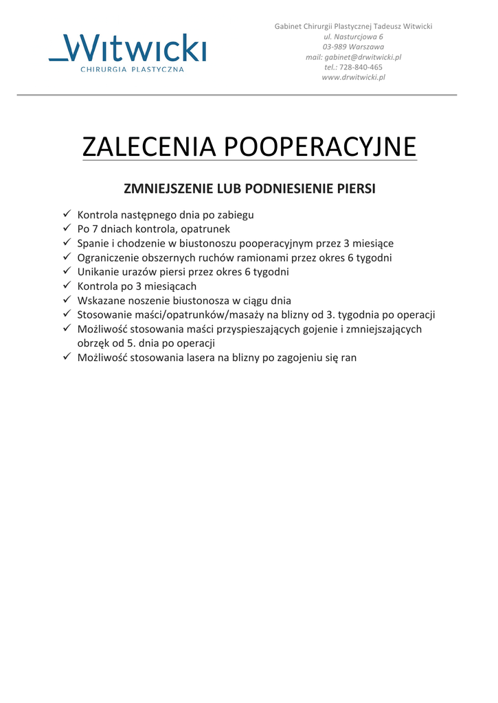 GabinetChirurgiiPlastycznejTadeuszWitwicki ul.Nasturcjowa6 03-989Warszawa mail:[email protected] tel.:728-840-465 www.drwitwicki.pl ZALECENIAPOOPERACYJNE ZMNIEJSZENIELUBPODNIESIENIEPIERSI Kontrolanastępnegodniapozabiegu Po7dniachkontrola,opatrunek Spanieichodzeniewbiustonoszupooperacyjnymprzez3miesiące Ograniczenieobszernychruchówramionamiprzezokres6tygodni Unikanieurazówpiersiprzezokres6tygodni Kontrolapo3miesiącach Wskazanenoszeniebiustonoszawciągudnia Stosowaniemaści/opatrunków/masażynabliznyod3.tygodniapooperacji Możliwośćstosowaniamaściprzyspieszającychgojenieizmniejszających obrzękod5.dniapooperacji ü Możliwośćstosowanialaseranabliznypozagojeniusięran ü ü ü ü ü ü ü ü ü