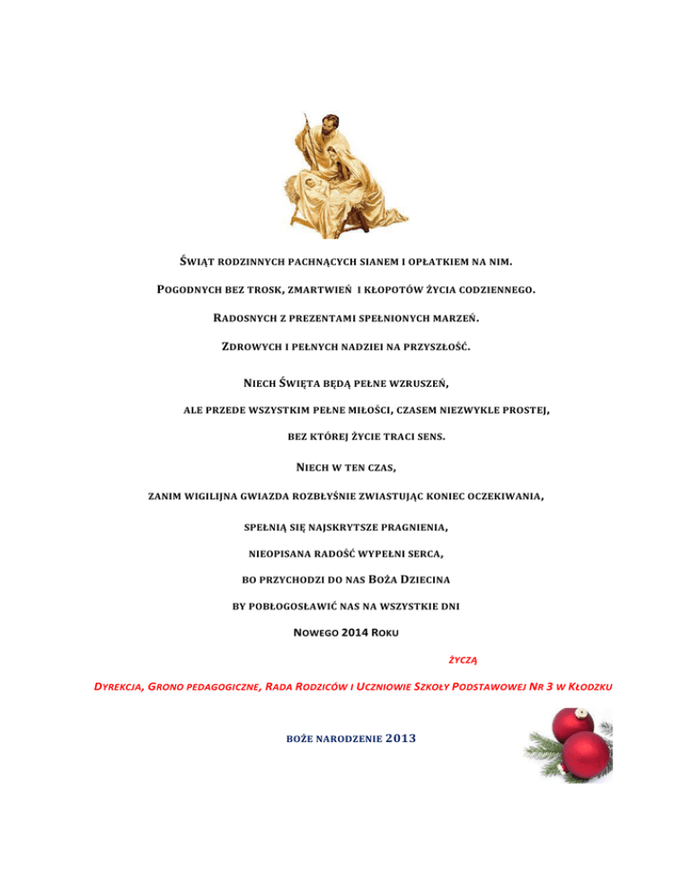 ŚWIĄT RODZINNYCH PACHNĄCYCH SIANEM I OPŁATKIEM NA NIM. POGODNYCH BEZ TROSK , ZMARTWIEŃ I KŁOPOTÓW ŻYCIA CODZIENNEGO . RADOSNYCH Z PREZENTAMI SPEŁNIONYCH MARZEŃ . ZDROWYCH I PEŁNYCH NADZIEI NA PRZYSZŁOŚĆ . NIECH ŚWIĘTA BĘDĄ PEŁNE WZRUSZEŃ, ALE PRZEDE WSZYSTKIM PEŁNE MIŁOŚCI , CZASEM NIEZWYKLE PROSTEJ , BEZ KTÓREJ ŻYCIE TRACI SENS. NIECH W TEN CZAS, ZANIM WIGILIJNA GWIAZDA ROZBŁYŚNIE ZWIASTUJĄC KONIEC OCZEKIWANIA , SPEŁNIĄ SIĘ NAJSKRYTSZE PRAGNIENIA , NIEOPISANA RADOŚĆ WYPEŁNI SERCA , BO PRZYCHODZI DO NAS B OŻA DZIECINA BY POBŁOGOSŁAWIĆ NAS NA WSZYSTKIE DNI NOWEGO 2014 ROKU ŻYCZĄ DYREKCJA, GRONO PEDAGOGICZNE , RADA RODZICÓW I UCZNIOWIE SZKOŁY PODSTAWOWEJ NR 3 W KŁODZKU BOŻE NARODZENIE 2013