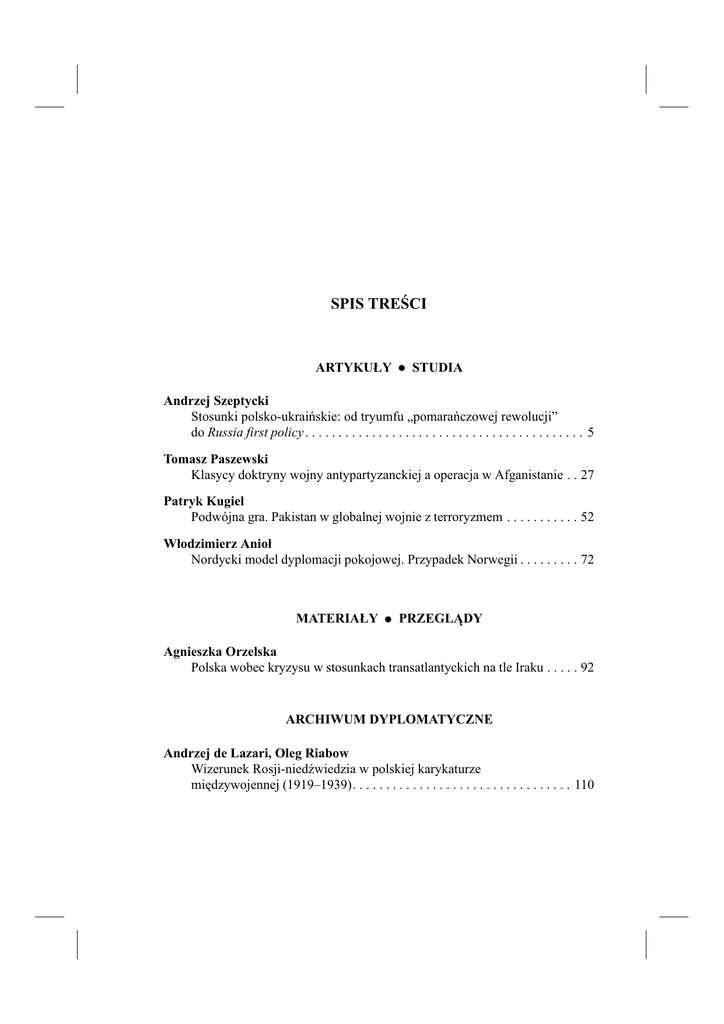 SPIS TREŒCI ARTYKU£Y • STUDIA Andrzej Szeptycki Stosunki polsko-ukraiñskie: od tryumfu „pomarañczowej rewolucji” do Russia first policy . . . . . . . . . . . . . . . . . . . . . . . . . . . . . . . . . . . . . . . . . . 5 Tomasz Paszewski Klasycy doktryny wojny antypartyzanckiej a operacja w Afganistanie . . 27 Patryk Kugiel Podwójna gra. Pakistan w globalnej wojnie z terroryzmem . . . . . . . . . . . 52 W³odzimierz Anio³ Nordycki model dyplomacji pokojowej. Przypadek Norwegii . . . . . . . . . 72 MATERIA£Y • PRZEGL¥DY Agnieszka Orzelska Polska wobec kryzysu w stosunkach transatlantyckich na tle Iraku . . . . . 92 ARCHIWUM DYPLOMATYCZNE Andrzej de Lazari, Oleg Riabow Wizerunek Rosji-niedŸwiedzia w polskiej karykaturze miêdzywojennej (1919–1939). . . . . . . . . . . . . . . . . . . . . . . . . . . . . . . . . 110 DOKUMENT Scenariusze przysz³oœci konfliktu w Afganistanie: perspektywa regionalna (Henryk Szlajfer, Szymon Skalski, Mateusz Ananicz, Gareth Chapel, Marek Menkiszak, Krzysztof Strachota) . . . . . . . . . . . . 129 RECENZJE • OMÓWIENIA Agnieszka Bieñczyk-Missala, S³awomir Dêbski (red.), Rafa³ Lemkin: A Hero of Humankind (Roman Wieruszewski) . . . . . . . . . . . . . . . . . . . . 133 Jacek Sobczak, Potomkowie Lecha i Giedymina. Stosunki polityczne miêdzy Litw¹ a Polsk¹ w pierwszych latach odrodzenia pañstwa litewskiego (Jerzy Menkes) . . . . . . . . . . . . . . . . . . . . . . . . . . . . 137 Rupert Smith, Przydatnoœæ si³y militarnej. Sztuka wojenna we wspó³czesnym œwiecie (Boles³aw Balcerowicz) . . . . . . . . . . . . . . . . 142 Omówienia . . . . . . . . . . . . . . . . . . . . . . . . . . . . . . . . . . . . . . . . . . . . . . . . . . . 149 KRONIKA WYDARZEÑ MIÊDZYNARODOWYCH (Aleksandra Zieleniec) . . . . . . . . . . . . . . . . . . . . . . . . . . . . . . . . . . . . . . 157