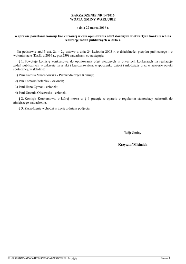 ZARZĄDZENIE NR 14/2016 WÓJTA GMINY WARLUBIE z dnia 22 marca 2016 r. w sprawie powołania komisji konkursowej w celu opiniowania ofert złożonych w otwartych konkursach na realizację zadań publicznych w 2016 r. Na podstawie art.15 ust. 2a – 2g ustawy z dnia 24 kwietnia 2003 r. o działalności pożytku publicznego i o wolontariacie (Dz.U. z 2016 r., poz.239) zarządzam, co następuje: § 1. Powołuję komisję konkursową do opiniowania ofert złożonych w otwartych konkursach na realizację zadań publicznych w zakresie turystyki i krajoznawstwa, wypoczynku dzieci i młodzieży oraz w zakresie opieki społecznej, w składzie: 1) Pani Kamila Marendowska - Przewodnicząca Komisji; 2) Pan Tomasz Stefaniak - członek; 3) Pani Ilona Cymas - członek; 4) Pani Urszula Olszewska - członek. § 2. Komisja Konkursowa, o której mowa w § 1 pracuje w oparciu o regulamin stanowiący załącznik do niniejszego zarządzenia. § 3. Zarządzenie wchodzi w życie z dniem podjęcia. Wójt Gminy Krzysztof Michalak Id: 695E6B2D-AD6D-4E09-95F0-CA02F3BC66F8. Przyjęty Strona 1 Załącznik do Zarządzenia Nr 14/2016 Wójta Gminy Warlubie z dnia 22 marca 2016 r. REGULAMIN PRACY KOMISJI KONKURSOWEJ § 1. 1. Zadaniem Komisji Konkursowej jest opiniowanie ofert złożonych w konkursie na realizację zadań publicznych z zakresu turystyki i krajoznawstwa, wypoczynku dzieci i młodzieży oraz opieki społecznej. 2. W pracach Komisji mogą uczestniczyć także, z głosem doradczym, osoby posiadające specjalistyczną wiedzę w dziedzinie obejmującej zakres zadań publicznych, których konkurs dotyczy. § 2. 1. Do członków Komisji biorących udział w opiniowaniu ofert stosuje się przepisy ustawy z dnia 14 czerwca 1960 r. Kodeks postępowania administracyjnego (Dz.U. z 2016 r., poz. 23) dotyczące wyłączenia pracownika. 2. Każdy członek Komisji podpisuje oświadczenie, o bezstronności przy opiniowaniu ofert w stosunku do oferentów biorących udział w konkursie, zgodnie z załącznikiem nr 1 do regulaminu. § 3. 1. Komisja obraduje na posiedzeniach zamkniętych bez udziału oferentów. 2. Dla ważności obrad Komisji niezbędny jest udział, co najmniej połowy jej składu, w tym obligatoryjnie przewodniczącego lub jego zastępcy. § 4. 1. Komisja dokonuje oceny ofert pod względem formalnym na podstawie karty oceny formalnej, stanowiącej załącznik nr 2 do regulaminu. 2. W przypadku stwierdzenia braków formalnych oferty, Komisja wzywa oferenta do ich uzupełnienia, w terminie 3 dni, pod rygorem odrzucenia oferty. 3. Po zaopiniowaniu ofert spełniających wymogi formalne Komisja dokonuje ich oceny pod względem merytorycznym, zgodnie z kryteriami określonymi w karcie oceny merytorycznej, stanowiącej załącznik nr 3 do regulaminu. 4. Do dofinansowania z budżetu Gminy rekomendowane będą zadania, które w ocenie merytorycznej uzyskają nie mniej niż 30 punktów. 5. Listę ocenionych ofert z propozycją kwot dotacji na realizację poszczególnych ofert, komisja przedstawia Wójtowi Gminy, który podejmuje ostateczną decyzję o przyznaniu dotacji i jej wysokości. § 5. Z przebiegu prac Komisji sporządza się protokół, który podpisuje Przewodniczący i członkowie Komisji obecni na posiedzeniu. § 6. Wyniki konkursu ofert, wraz z informacją o kwocie przyznanej dotacji zamieszcza się w Biuletynie Informacji Publicznej, na stronie internetowej Urzędu Gminy oraz na tablicy ogłoszeń w Urzędzie Gminy w Warlubiu. Wójt Gminy Krzysztof Michalak Id: 695E6B2D-AD6D-4E09-95F0-CA02F3BC66F8. Przyjęty Strona 1
