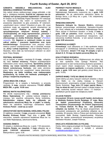Fourth Sunday of Easter, April 29, 2012 CZWARTA NIEDZIELA WIELKANOCNA, ALBO NIEDZIELA DOBREGO PASTERZA Gdy radość okresu wielkanocnego osiąga półmetek, a tak jest w dzisiejszą niedzielę, Kościół św. zaprasza nas do refleksji nad sprawą powołań kapłańskich i zakonnych. W Orędziu na tą Niedzielę Papież Benedykt XVI wskazuje na niezastapioną rolę rodzin w wychowywaniu do pozytywnej odpowiedzi na głos powołania. W rodzinach, „wspólnotach życia i miłości” (Gaudium et spes, 48), nowe pokolenia mogą we wspaniały sposób doświadczyć tej ofiarnej miłości. Rodziny są bowiem nie tylko uprzywilejowanym miejscem formacji ludzkiej i chrześcijańskiej, ale mogą reprezentować „pierwsze i najlepsze seminarium powołaniowe do życia ofiarowanego na służbę Królestwa Bożego” (Familiaris consortio, 53). Najpierw w rodzinach trzeba na nowo odkryć piękno i znaczenie kapłaństwa oraz życia konsekrowanego. Duszpasterze oraz wszyscy wierni świeccy powinni współpracować, aby w Kościele mnożyły się „domy i szkoły wspólnoty” na wzór Świętej Rodziny z Nazaretu, która stała się harmonijnym odbiciem na ziemi życia Trójcy Świętej. PIERWSZY PIĄTEK MIESIĄCA W pierwszy piątek miesiąca, 4 maja, adoracja Najświętszego Sakramentu rozpocznie się o godz. 6.00 wieczorem. Na jej zakończenie odmówimy litanię do Bożego Serca, a po Mszy św. o godz. 7.00, odśpiewamy litanię loretańską. FESTIWAL WIOSENNY Już za tydzień, w sobotę i niedzielę 5 i 6 maja, odbędzie się nasz festiwal wiosenny. Potężne przedsięwzięcie realizowane przez naszą wspólnotę. Sprawdźmy jeszcze dzisiaj, czy nasze nazwiska zostały odnotowane na listach wolontariuszy festiwalu. Jest wiele odcinków pracy, które muszą być „wypełnione” naszą obecnością. Wspierajmy się także modlitwą oraz nadzwyczajną życzliwością, by trudne dni festiwalu przebiegały w pokoju i wzajemnej współpracy. KOŁO ŻYWEGO ROŻAŃCA W okresie Wielkiego Postu i Wielkanocnym nie odbyły się aż dwa spotkania Koła Żywego Różańca. Raz spowodowane to było koniecznością słuchania spowiedzi a innym razem dniem świątecznym. Tym bardziej więc zapraszam na majowe spotkanie, w przyszłą niedzielę, 6 maja, o godz. 9.30 rano (pół godziny przed Mszą św o godz. 10.00). JEDNA MSZA ŚW, 6 MAJA Przypominam, że w związku z festiwalem, w przyszłą niedzielę, 6 maja, zostanie odprawiona TYLKO JEDNA MSZA ŚW., o godz. 10.00 rano. MIESIĄC MATKI NAJŚWIĘTSZEJ We wtorek rozpoczynamy maj - miesiąc poświęcony Matce Najświętszej. W polskiej kulturze religijnej w miesiącu tym wspólnie odmawiamy litanię loretańską. Nabożeństwa majowe będą się odbywały po zakończeniu wieczornej Mszy św. w piątki i w soboty. Niech nie zabraknie rodzinnego odmawiania litanii! Królowo Polski – módl się za nami! UROCZYSTOŚĆ MATKI BOSKIEJ KRÓLOWEJ POLSKI W najbliższy czwartek, 3 maja, przypada uroczystość Matki Boskiej Królowej Polski. Tego dnia, o godz. 7.00 wieczorem, zostanie odprawiona dodatkowa Msza św. ku czci Matki Najświętszej, zakończona litanią. GODZINA ŚWIĘTA W związku z dodatkową Mszą św. o godz. 7.00 wieczorem, Godzina Święta, we czwartek, 3 maja odbędzie się w godz. 5.45-6.45 wieczorem. Lektura pism św. Maksymiliana o godz. 5.30. ŚWIĘCENIA BISKUPIE Święcenia biskupie ks. Georg’a Sheltz’a, siódmego biskupa pomocniczego archidiecezji Galveston-Houston (tyt. Irina), odbędą się w konkatedrze Najświętszego Serca Pana Jezusa w downtown Houston, w środę, 2 maja, o godz. 2.00 po południu. Dzień wcześniej, tj. 1 maja, biskup-nomitat będzie przewodniczył nieszporom, czyli wieczornej modlitwie Kościoła, w tym samym kościele, o godz. 6.00 wieczorem. KONWOKACJA KSIĘŻY Konwokacja, czyli odbywane co 2 lata spotkanie księży pracujących w archidiecezji Galveston-Houston, odbędzie się w Galveston, dniach 7-10 maja. W związku z tym w dniach 8, 9, 10 maja nie będzie porannej Mszy św. ZAPROŚ MAMĘ I TATĘ NA OBIAD DO NAS! Jeżeli robimy już plany naszych rodzinych obiadów z okazji Dnia Matki, co ma wielką tradycję w Stanach Zjednoczonych, proponujemy przyjąć propozycję Polskiej Szkoły Sobotniej. Tego dnia (13 maja) zaproś Mamę i Tatę na obiad do nas! Zamiast czekać w długiej kolejce na stolik, wysłuchaj życzeń naszych dzieci i w rodzinym – parafialnym gronie spędź ten świąteczny dzień! 30-LECIE PARAFII Uroczystość 30-lecia naszej parafii będzie obchodzona w Niedzielę Zesłania Ducha Świętego, 27 maja. Mszy św. będzie przewodniczył Przełożony Generalny Towarzystwa Chrystusowego dla Polonii Zagranicznej ks. Tomasz Sielicki. Po Mszy św. sali parafialnej odbędzie się bankiet. Przy tej okazji przypominam, że uroczystość poświęcenia sali parafialnej odbędzie się w niedzielę, 26 sierpnia, która w Polsce jest obchodzona jako uroczystość Matki Boskiej Częstochowskiej. Wówczas Mszy św. będzie przewodniczył emerytowany arcybiskup Galveston-Houston, Joseph Fiorenza. KRUCJATA RÓŻAŃCOWA ZA POLSKĘ Osoby, które pragną przystąpić do Krucjaty Różańcowej za Polskę, uprzejmie prosimy o kontakt z adresem [email protected]. | PARAFIA MATKI BOSKIEJ CZĘSTOCHOWSKIEJ, HOUSTON, TEXAS TEL. 713-973-1081 Fourth Sunday of Easter, April 29, 2012 FOURTH SUNDAY OF EASTER, OR GOOD SHEPHERD SUNDAY When the joy of Easter reaches its halfway point, as is this Sunday, The Church invites us to reflect on priestly and religious vocations. In the message for this Sunday, Pope Benedict XVI points to an irreplaceable role in educating families to respond positively to this call. Within the family, “a community of life and love” (Gaudium et Spes, 48), young people can have a wonderful experience of this self-giving love. Indeed, families are not only the privileged place for human and Christian formation; they can also be “the primary and most excellent seed-bed of vocations to a life of consecr