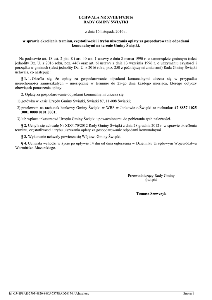 UCHWAŁA NR XVIII/147/2016 RADY GMINY ŚWIĄTKI z dnia 16 listopada 2016 r. w sprawie określenia terminu, częstotliwości i trybu uiszczania opłaty za gospodarowanie odpadami komunalnymi na terenie Gminy Świątki. Na podstawie art. 18 ust. 2 pkt. 8 i art. 40 ust. 1 ustawy z dnia 8 marca 1990 r. o samorządzie gminnym (tekst jednolity Dz. U. z 2016 roku, poz. 446) oraz art. 6l ustawy z dnia 13 września 1996 r. o utrzymaniu czystości i porządku w gminach (tekst jednolity Dz. U. z 2016 roku, poz. 250 z późniejszymi zmianami) Rada Gminy Świątki uchwala, co następuje: § 1. 1. Określa się, że opłaty za gospodarowanie odpadami komunalnymi uiszcza się w przypadku nieruchomości zamieszkałych – miesięcznie w terminie do 25-go dnia każdego miesiąca, którego dotyczy obowiązek ponoszenia opłaty. 2. Opłatę za gospodarowanie odpadami komunalnymi uiszcza się: 1) gotówka w kasie Urzędu Gminy Świątki, Świątki 87, 11-008 Świątki; 2) przelewem na rachunek bankowy Gminy Świątki w WBS w Jonkowie o/Świątki nr rachunku: 47 8857 1025 3001 0000 0101 0001; 3) lub wpłaca inkasentowi Urzędu Gminy Świątki upoważnionemu do pobierania tych należności. § 2. Uchyla się uchwałę Nr XIX/170/2012 Rady Gminy Świątki z dnia 28 grudnia 2012 r. w sprawie określenia terminu, częstotliwości i trybu uiszczania opłaty za gospodarowanie odpadami komunalnymi. § 3. Wykonanie uchwały powierza się Wójtowi Gminy Świątki. § 4. Uchwała wchodzi w życie po upływie 14 dni od dnia ogłoszenia w Dzienniku Urzędowym Województwa Warmińsko-Mazurskiego. Przewodniczący Rady Gminy Świątki Tomasz Szewczyk Id: C541F8AE-2703-4820-86C5-7373EAD26174. Uchwalony Strona 1 UZASADNIENIE Ustawa z dnia 28 listopada 2014 r. o zmianie ustawy o utrzymaniu czystości i porządku w gminach oraz niektórych innych ustaw (Dz.U. z 2015 r. poz. 87) w art. 11 stanowi, iż dotychczasowe akty prawa miejscowego wydane na podstawie art. 4, art. 6l, art. 6n, art. 6r ust. 3 i 4 ustawy o utrzymaniu czystości i porządku w gminach przestały obowiązywać. Zmianie w uchwale uległa podstawa prawna, na podstawie której została uchwalona. W związku z powyższym podjęcie stosownej uchwały jest zasadne. Id: C541F8AE-2703-4820-86C5-7373EAD26174. Uchwalony Strona 1