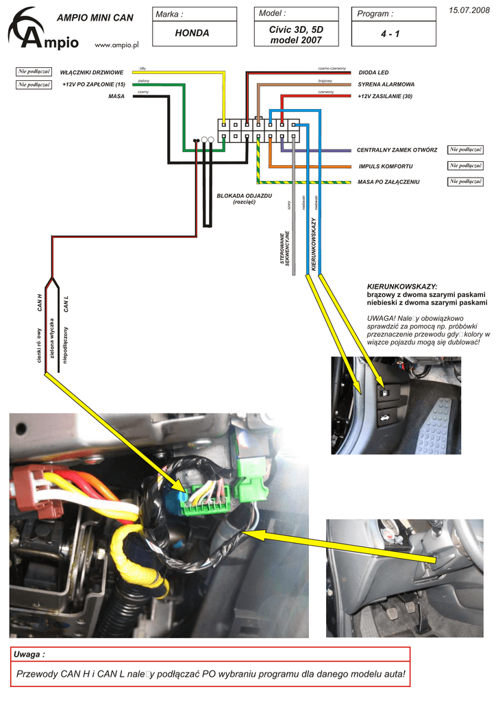 Marka : AMPIO MINI CAN HONDA www.ampio.pl Nie podłączać Nie podłączać Model : Program : Civic 3D, 5D model 2007 żółty czarno-czerwony zielony brązowy czarny czerwony WŁĄCZNIKI DRZWIOWE +12V PO ZAPŁONIE (15) 15.07.2008 4-1 DIODA LED MASA SYRENA ALARMOWA +12V ZASILANIE (30) CENTRALNY ZAMEK OTWÓRZ Nie podłączać IMPULS KOMFORTU Nie podłączać MASA PO ZAŁĄCZENIU Nie podłączać BLOKADA ODJAZDU (rozciąć) niepodłączony zielona wtyczka cienki różowy KIERUNKOWSKAZY: brązowy z dwoma szarymi paskami niebieski z dwoma szarymi paskami UWAGA! Należy obowiązkowo sprawdzić za pomocą np. próbówki przeznaczenie przewodu gdyż kolory w wiązce pojazdu mogą się dublować! Uwaga : Przewody CAN H i CAN L należy podłączać PO wybraniu programu dla danego modelu auta!