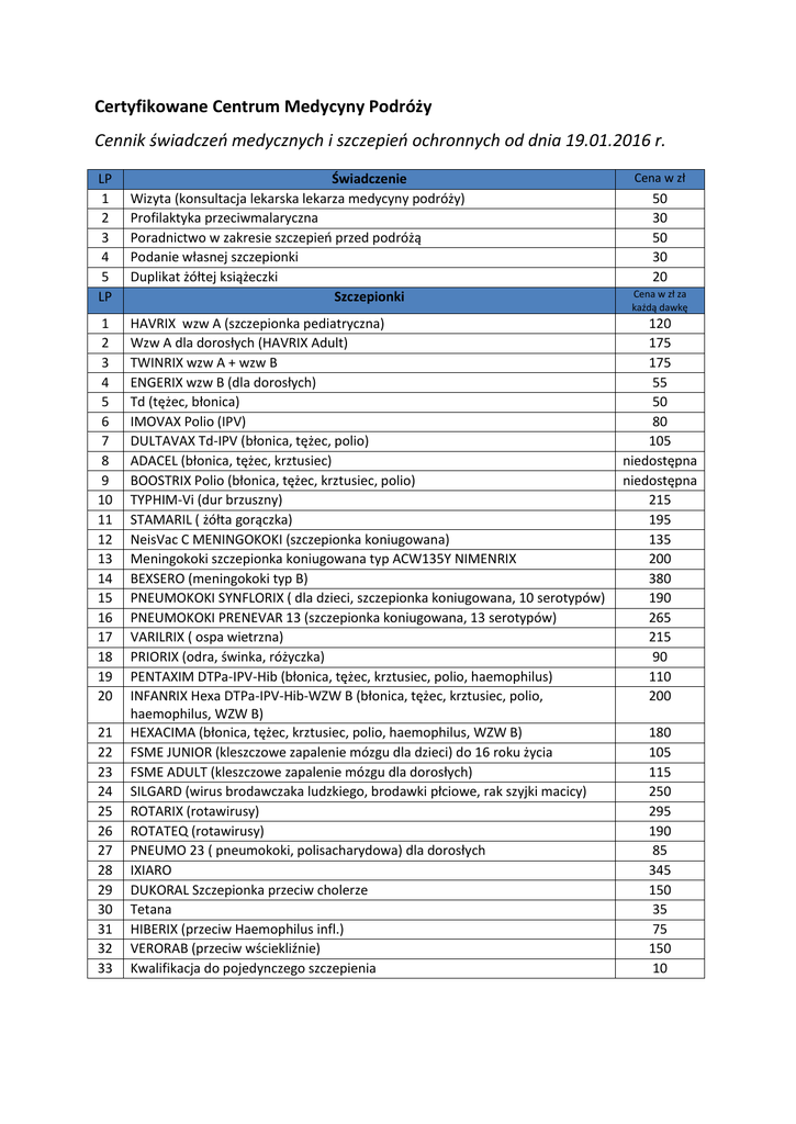 Certyfikowane Centrum Medycyny Podróży Cennik świadczeń medycznych i szczepień ochronnych od dnia 19.01.2016 r. LP 1 2 3 4 5 LP Świadczenie Wizyta (konsultacja lekarska lekarza medycyny podróży) Profilaktyka przeciwmalaryczna Poradnictwo w zakresie szczepień przed podróżą Podanie własnej szczepionki Duplikat żółtej książeczki Szczepionki 1 2 3 4 5 6 7 8 9 10 11 12 13 14 15 16 17 18 19 20 HAVRIX wzw A (szczepionka pediatryczna) Wzw A dla dorosłych (HAVRIX Adult) TWINRIX wzw A + wzw B ENGERIX wzw B (dla dorosłych) Td (tężec, błonica) IMOVAX Polio (IPV) DULTAVAX Td-IPV (błonica, tężec, polio) ADACEL (błonica, tężec, krztusiec) BOOSTRIX Polio (błonica, tężec, krztusiec, polio) TYPHIM-Vi (dur brzuszny) STAMARIL ( żółta gorączka) NeisVac C MENINGOKOKI (szczepionka koniugowana) Meningokoki szczepionka koniugowana typ ACW135Y NIMENRIX BEXSERO (meningokoki typ B) PNEUMOKOKI SYNFLORIX ( dla dzieci, szczepionka koniugowana, 10 serotypów) PNEUMOKOKI PRENEVAR 13 (szczepionka koniugowana, 13 serotypów) VARILRIX ( ospa wietrzna) PRIORIX (odra, świnka, różyczka) PENTAXIM DTPa-IPV-Hib (błonica, tężec, krztusiec, polio, haemophilus) INFANRIX Hexa DTPa-IPV-Hib-WZW B (błonica, tężec, krztusiec, polio, haemophilus, WZW B) HEXACIMA (błonica, tężec, krztusiec, polio, haemophilus, WZW B) FSME JUNIOR (kleszczowe zapalenie mózgu dla dzieci) do 16 roku życia FSME ADULT (kleszczowe zapalenie mózgu dla dorosłych) SILGARD (wirus brodawczaka ludzkiego, brodawki płciowe, rak szyjki macicy) ROTARIX (rotawirusy) ROTATEQ (rotawirusy) PNEUMO 23 ( pneumokoki, polisacharydowa) dla dorosłych IXIARO DUKORAL Szczepionka przeciw cholerze Tetana HIBERIX (przeciw Haemophilus infl.) VERORAB (przeciw wściekliźnie) Kwalifikacja do pojedynczego szczepienia 21 22 23 24 25 26 27 28 29 30 31 32 33 Cena w zł 50 30 50 30 20 Cena w zł za każdą dawkę 120 175 175 55 50 80 105 niedostępna niedostępna 215 195 135 200 380 190 265 215 90 110 200 180 105 115 250 295 190 85 345 150 35 75 150 10