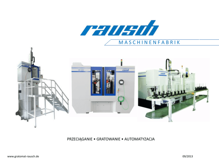 MASCHINENFABRIK PRZECIĄGANIE • GRATOWANIE • AUTOMATYZACJA www.gratomat-rausch.de 09/2013 Zakres produkcji: przeciąganie Przeciągarki poziome z ręczną wymianą narzędzi i detali Siła przezciągania max.: 30 / 40 / 63 kN Prędkość przeciągania: 1 – 5 m/min. Prędkość powrotu: 10 m/min. Skok przeciągania max.: 1000 / 1000 / 1300 mm Długość przeciągacza max.: 1200 / 1200 / 1500 mm Średnica detalu max.: 300 / 400 / 400 mm (ew. powiększona) Ciężar detalu max.: 210 / 280 / 350 kg Szerokość rowka wpustowego max.: 20 / 25 / 36 mm Górna krawędź stołu maszyny: 1560 / 1620 / 1980 mm Całkowita wysokość ok.: 2600 / 2600 / 3080 mm RS 30 www.gratomat-rausch.de 09/2013 Zakres produkcji: przeciąganie Przeciągarki poziome z automatyczną wymianą narzędzi Przeciąganie wewnętrzne rowków wpustowych i profili Siła przeciągania max.: 40 / 63 kN Prędkość przeciągania: 1 – 9 m/min. Prędkość powrotu: 10 m/min. Skok przeciągania max.: 1000 / 1300 mm Długość przeciągacza max.: 1200 / 1500 mm Górna krawędź stołu maszyny: 1690 / 1980 mm Całkowita wysokość ok.: 2780 / 3080 mm Średnica detalu max.: 400 / 400 mm Ciężar detalu max.: 280 / 350 kg Szerokość rowka wpustowego max.: 25 / 36 mm RSIZ 63 S www.gratomat-rausch.de 09/2013 Zakres produkcji: przeciąganie W pełni automatyczne przeciągarki z ruchomym stołem Przeciąganie wewnętrzne rowków wpustowych i profili Siła przeciągania max.: 63 kN Prędkość przeciągania: 1 – 9 m/min. Prędkość powrotu: 10 m/min. Skok przeciągania: 2000 mm Długość przeciągacza max.: 2300 mm Górna krawędź stołu maszyny: 1050 mm Całkowita wysokość ok.: 4600 mm Średnica detalu max.: 70 mm Ciężar detalu max.: 2,5 kg Załadunek robotem, taśmowy transporter palet Stanowisko przezbrajania i konserwacji RSIH 63 S www.gratomat-rausch.de Magazyn narzędzi 09/2013 Zakres produkcji: przeciąganie Nowa generacja maszyn RSIZ 20 S Przeciąganie wewnętrzne profili Siła przeciągania max.: 20 kN Prędkość przeciągania: 2 – 6 m/min. Prędkość powrotu: 6 m/min. Skok przeciągania: 700 mm Długość przeciągacza max.: 900 mm Górna krawędź stołu maszyny: 1650 mm Całkowita wysokość ok.: 3180 mm Średnica detalu max.: 80 mm RSIZ 20 S www.gratomat-rausch.de 09/2013 Zakres produkcji: przeciąganie Kompletny proces obróbki „z jednej ręki” Przyrządy mocujące www.gratomat-rausch.de Przeciągacze i serwis ostrzarski 09/2013 Zakres produkcji: gratowanie Maszyny do gratowania i fazowania z jednym wrzecionem, ręczne ustawianie i załadunek Jedno lub obustronne gratowanie i fazowanie uzębień zewnętrznych Maszyna wyposażona w dwa ręcznie ustawiane narzędzia do obróbki Możliwości obróbki: frezowanie lub szlifowanie faz i/lub szczotkowanie Ręczny załadunek detali Obróbka na sucho Średnica detalu: 50 - 500 mm Czas obróbki ok.: 15 – 105 s Moduł: 2 – 10 Uzębienie: proste lub skośne Wysokość detalu max.: 200 mm Ciężar detalu max.: 300 kg Odsysacz wiórów i zanieczyszczeń Gratomat® 500 ECO www.gratomat-rausch.de 09/2013 Zakres produkcji: gratowanie Zautomatyzowane maszyny do gratowania i fazowania z jednym wrzecionem Obustronne gratowanie i fazowanie uzębień wewnętrznych i zewnętrznych Maszyna wyposażona w max. 4 ręcznie lub automatyczne ustawiane narzędzia do obróbki Możliwości obróbki: gratowanie zgrubne, frezowanie lub szlifowanie faz i/lub szczotkowanie Obróbka na sucho Gratomat® 630 www.gratomat-rausch.de Średnica detalu: 50 - 630 mm Czas obróbki ok.: 15 – 125 s Moduł: 2 – 10 (24) Uzębienie: proste lub skośne Wysokość detalu max.: 450 mm Ciężar detalu max.: 300 kg Odsysacz wiórów i zanieczyszczeń 09/2013 Zakres produkcji: gratowanie Maszyny do gratowania dużych detali Obustronne gratowanie i fazowanie uzębień wewnętrznych i zewnętrznych Możliwości obróbki: gratowanie zgrubne, frezowanie lub szlifowanie faz i/lub szczotkowanie Maszyna wyposażona w max. 4 ręcznie lub automatyczne ustawiane narzędzia do obróbki Obróbka na sucho Średnica detalu: 300 - 4000 mm Czas obróbki ok.: 60 – 1200 s Moduł: 2 – 24 Uzębienie: proste lub skośne Wysokość detalu max.: 1.000 mm Ciężar detalu max.: 5.000 kg Ręczny załadunek detali Gratomat® 2000 S www.gratomat-rausch.de Ręczy lub opcjonalnie automatyczny załadunek detali Odsysacz wiórów i zanieczyszczeń 09/2013 Zakres produkcji: gratowanie W pełni automatyczne maszyny z wieloma wrzecionami do gratowania i fazowania małych detali 3-stanowiskowa maszyna ze stołem obrotowym z dwuosiowym portalem załadowczym i taśmowym transporterem palet Obustronne gratowanie i fazowanie uzębień wewnętrznych kół i wałków Maszyna wyposażona w max. 4 ręcznie lub automatyczne (Serwo-osie) ustawiane narzędzia do obróbki Możliwości obróbki: frezowanie lub szlifowanie faz i/lub szczotkowanie Obróbka na sucho Średnica detalu: 40 - 160 mm Czas obróbki ok.: 20 – 40 s Moduł: 2 – 10 Uzębienie: proste lub skośne Wysokość detalu max.: 100 mm Ciężar detalu max.: 5 kg Odsysacz wiórów i zanieczyszczeń Gratomat® MS 160/3-760 www.gratomat-rausch.de 09/2013 Zakres produkcji: gratowanie W pełni automatyczne maszyny z wieloma wrzecionami do gratowania i fazowania detali średniej wielkości 5-stanowiskowa maszyna ze stołem obrotowym z trzyosiowym portalem załadowczym i taśmowym transporterem palet Obustronne gratowanie i fazowanie uzębień zewnętrznych Maszyna wyposażona w max. 8 ręcznie lub automatyczne (Serwo-osie) ustawiane narzędzia do obróbki Możliwości obróbki: frezowanie lub szlifowanie faz i/lub szczotkowanie Obróbka na sucho Średnica detalu: 10 - 300 mm Czas obróbki ok.: 25 – 40 s Moduł: 2 – 10 Uzębienie: proste lub skośne Wysokość detalu max.: 400 mm Ciężar detalu max.: 16 kg Odsysacz wiórów i zanieczyszczeń Gratomat® MS 300/5-1000 www.gratomat-rausch.de 09/2013 Zakres produkcji: gratowanie Mechaniczne procesy gratowania i fazowania Gratowanie zgrubn