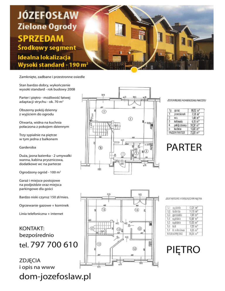 Zamknięte, zadbane i przestronne osiedle Stan bardzo dobry, wykończenie wysoki standard - rok budowy 2008 Parter i piętro - możliwość łatwej adaptacji strychu - ok. 70 m2 Obszerny pokój dzienny z wyjściem do ogrodu Otwarta, widna na kuchnia połaczona z pokojem dziennym Trzy sypialnie na piętrze w tym jedna z balkonem Garderoba PARTER Duża, jasna łazienka - 2 umywalki wanna, kabina prysznicowa, dodatkowe wc na parterze Ogrodzony ogród - 100 m2 Garaż i miejsce postojowe na podjeździe oraz miejsca parkingowe dla gości Bardzo niski czynsz 150 zł/mies. Ogrzewanie gazowe + kominek Linia telefoniczna + internet KONTAKT: bezpośrednio tel. 797 700 610 ZDJĘCIA i opis na www dom-jozefoslaw.pl PIĘTRO