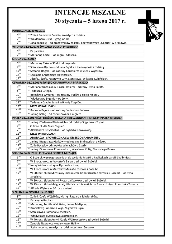 INTENCJE MSZALNE 30 stycznia – 5 lutego 2017 r. PONIEDZIAŁEK 30.01.2017 630 † Zofię i Franciszka Serafin, zmarłych z rodziny. 700 † Waldemara Listka – greg. nr 30. 700 † Jana Kądzielę – od pracowników zakładu pogrzebowego „Gabriel” w Krakowie. WTOREK 31.01.2017: ŚW. JANA BOSKO, PREZBITERA 630 Za parafian. 700 † Mariannę Korfel – od męża Tadeusza. ŚRODA 01.02.2017 630 † Mariannę Tyko w 30 dni od pogrzebu. 700 † Stanisława Bączka – od Jana Bączka z Niezwojowic z rodziną. 00 17 † Stefanię Rogala – od rodziny Kazimierza i Heleny Wątorów. 1700 † Leokadię i Antoniego Sławińskich. 1700 † Józefa, Józefa, Katarzynę Luty, Stanisława, Wiktorię Kubińskich. CZWARTEK 02.02.2017: ŚWIĘTO OFIAROWANIA PAŃSKIEGO 800 † Mariana Woźniaka w 1 rocz. śmierci – od żony i syna Rafała. 00 8 † Tadeusza Lutego. 1000 † Bolesława Wykurza – od rodziny Pudów z Sielca Kolonii. 1000 † Władysława Stępnia – od żony. 00 12 † Tadeusza Czaplę, Jana i Wiktorię Czaplów. 1500 MSZE W KAPLICACH 1600 † Konrada Bajora – od rodziny Sajdaków i Żurków. 1600 † Janinę Gałkę – od córki Leokadii z mężem. PIĄTEK 03.02.2017: ŚW. BŁAŻEJA, BISKUPA I MĘCZENNIKA; PIERWSZY PIĄTEK MIESIĄCA 630 † Janinę i Tadeusza Klasińskich – od rodziny Stępniów z Topoli. 700 O Boże bł. dla Marii Stępień. 700 † Aleksandra Krzysztofika – od sąsiadki Nowakowej. 1500 MSZE W KAPLICACH 1600 ADORACJA I SPOWIEDŹ NAJŚWIĘTSZEGO SAKRAMENTU 00 17 † Janinę i Bogusława Gałków – od rodziny Binkowskich z Kózek. 1700 † Zofię Bączek – od swatów Wiejachów z Szarbi. 1700 † Janinę i Stanisława Koneweckich, Wiesława, Zofię, Maurycego Kulów. SOBOTA 04.02.2017: PIERWSZA SOBOTA MIESIĄCA 630 O Boże bł. w przygotowaniach do wydania książki o kapliczkach parafii Skalbmierz. 00 7 W 1 rocz. urodzin Krzysztofa Baran o zdrowie i Boże bł. 700 † Irenę Widłak – od syna Ryszarda z żoną. 1600 W 1 rocz. urodzin Marceliny Musiał o zdrowie i Boże bł. 00 17 W 50 rocz. ślubu Mirosławy i Kazimierza Konofalskich o zdrowie i Boże bł. – od syna z rodziną. 1700 W 20 rocz. ślubu Anny i Ryszarda Kwoków o zdrowie i Boże bł. 1700 W 15 rocz. ślubu Małgorzaty i Rafała Leśniewskich i w 4 rocz. śmierci Franciszka Tokarza. 1700 † Alfreda Wątora w 30 rocz. śmierci. V NIEDZIELA ZWYKŁA 05.02.2017 800 † Zofię i Józefa Wójcików, Marię i Ryszarda Salwieraków. 1000 † Katarzynę Buchacz. 00 10 † Mariannę, Teofila Walników, Janinę Malżycką. 1000 † Bronisławę i Andrzeja Wąż, Zbigniewa Bąka. 1200 † Stanisława i Romana Sucheckich. 1200 † Władysławę i Stanisława Jastrzębskich. 1600 W 40 rocz. ślubu Anny i Józefa Wójtowiczów o zdrowie i Boże bł. 1600 † Zenobię Naprawca – od synowej Haliny. 1600 † Stefana Łacha, zmarłych z rodziny Łachów i Serwów.