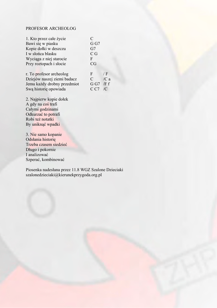 PROFESOR ARCHEOLOG 1. Kto przez całe życie Bawi się w piasku Kopie dołki w deszczu I w słońca blasku Wyciąga z niej starocie Przy roztopach i słocie C G G7 G7 CG F CG r. To profesor archeolog Dziejów naszej ziemi badacz Jemu każdy drobny przedmiot Swą historię opowiada F C G G7 C C7 /F /C a /F f /C 2. Najpierw kopie dołek A gdy na coś trafi Całymi godzinami Odkurzać to potrafi Robi też notatki By uniknąć wpadki 3. Nie samo kopanie Odsłania historię Trzeba czasem siedzieć Długo i pokornie I analizować Szperać, kombinować Piosenka nadesłana przez 11.8 WGZ Szalone Dzieciaki [email protected]