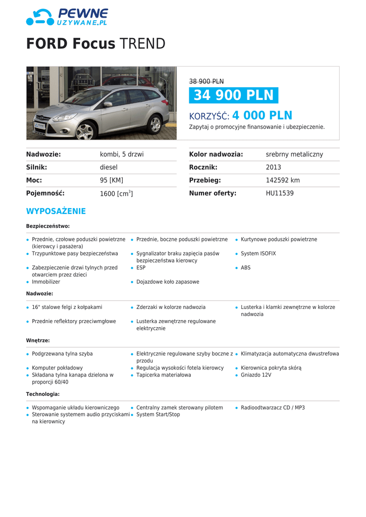 FORD Focus TREND 38 900 PLN 34 900 PLN KORZYŚĆ: 4 000 PLN Zapytaj o promocyjne finansowanie i ubezpieczenie. Nadwozie: kombi, 5 drzwi Kolor nadwozia: srebrny metaliczny Silnik: diesel Rocznik: 2013 Moc: 95 [KM] Przebieg: 142592 km Pojemność: 1600 [cm ] Numer oferty: HU11539 3 WYPOSAŻENIE Bezpieczeństwo: Przednie, czołowe poduszki powietrzne (kierowcy i pasażera) Trzypunktowe pasy bezpieczeństwa Zabezpieczenie drzwi tylnych przed otwarciem przez dzieci Immobilizer Przednie, boczne poduszki powietrzne Kurtynowe poduszki powietrzne Sygnalizator braku zapięcia pasów bezpieczeństwa kierowcy ESP System ISOFIX ABS Dojazdowe koło zapasowe Nadwozie: 16" stalowe felgi z kołpakami Zderzaki w kolorze nadwozia Przednie reflektory przeciwmgłowe Lusterka zewnętrzne regulowane elektrycznie Lusterka i klamki zewnętrzne w kolorze nadwozia Wnętrze: Podgrzewana tylna szyba Komputer pokładowy Składana tylna kanapa dzielona w proporcji 60/40 Elektrycznie regulowane szyby boczne z przodu Regulacja wysokości fotela kierowcy Tapicerka materiałowa Klimatyzacja automatyczna dwustrefowa Centralny zamek sterowany pilotem System Start/Stop Radioodtwarzacz CD / MP3 Kierownica pokryta skórą Gniazdo 12V Technologia: Wspomaganie układu kierowniczego Sterowanie systemem audio przyciskami na kierownicy FORD Focus TREND DODATKOWE INFORMACJE: * Samochód jest własnością GRUPY PGD - największego dealera samochodów w Polsce. * AUTORYZOWANE SERWISY i SALONY SPRZEDAŻY MAREK: Ford, Nissan, Suzuki, Fiat, Hyundai,Infiniti, Mitsubishi, Seat. * Stan techniczny każdego oferowanego samochodu weryfikujemy w naszym autoryzowanym serwisie znajdującym się w Centrum Motoryzacyjnym w Dąbrowie Górniczej. * Dysponujemy profesjonalnym miernikiem grubości lakieru. Badania powłoki lakierniczej dokonujemy w obecności Klienta. * Do każdego samochodu oferujemy możliwość zakupu pakietu gwarancyjnego. * Oferujemy szeroki wachlarz ofert finansowania zakupu pojazdu poprzez kredyt lub leasing - do 100% wartości samochodu. * Dysponujemy szeroką ofertą pakietowych dealerskich ubezpieczeń komunikacyjnych. * Możliwość pozostawienia swojego samochodu w rozliczeniu. Centrum Motoryzacyjne w Dąbrowie Górniczej * Samochody Używane - pewneuzywane.pl - Salon / serwis:Nissan, Suzuki i Mitsubishi Zapraszamy do naszego salonu w godzinach: • Pn - Pt: 9-18 • Sob: 9-14 Pewne Używane Dąbrowa Górnicza ul. Sobieskiego 10, tel.:32 72 10 002 www.blog.pgd.pl Nota prawna Dane zawarte w niniejszej propozycji handlowej mają wyłącznie charakter informacyjny. Podane informacje nie stanowią oferty ani zapewnienia, w szczególności w rozumieniu art. 66 § 1 oraz art. 5561 Kodeksu cywilnego. Wiążące ustalenie ceny, wyposażenia oraz specyfikacji samochodu następuje w pisemnej umowie sprzedaży/zamówienia samochodu. Ze względu na ograniczenia techniczne (np. odwzorowanie kolorów przez monitor lub sposób wydruku), kolory przedstawione w niniejszej propozycji handlowej mogą się różnić od rzeczywistych kolorów nadwozia i tapicerki. Niniejsza propozycja handlowa oraz wszelkie załączniki z nią związane są poufne i nie mogą być przekazywane osobom trzecim. Prezentowane zdjęcia mogą zawierać wyposażenie opcjonalne (akcesoryjne), dodatkowo płatne. Warunki oferty maja charakter orientacyjny i mogą zostać zmienione w momencie uaktualnienia cen lub warunków promocji.