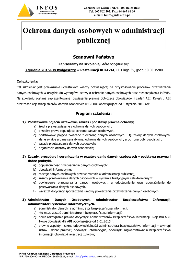 Zdzieszulice Górne 15d, 97-400 Bełchatów Tel. 667 802 302, Fax: 44 667 61 60 e-mail: [email protected] Ochrona danych osobowych w administracji publicznej Szanowni Państwo Zapraszamy na szkolenie, które odbędzie się: 3 grudnia 2015r. w Bydgoszczy w Restauracji KUJAVIA, ul. Długa 35, godz. 10:00-15:00 Cel szkolenia: Cel szkolenia: jest przekazanie uczestnikom wiedzy pozwalającej na przystosowanie procesów przetwarzania danych osobowych w urzędzie do wymogów ustawy o ochronie danych osobowych oraz rozporządzenia MSWiA. Na szkoleniu zostaną zaprezentowane rozwiązania prawne dotyczące obowiązków i zadań ABI, Rejestru ABI oraz zasad rejestracji zbiorów danych osobowych w GIODO obowiązujące od 1 stycznia 2015 roku. Program szkolenia: 1) Podstawowe pojęcia ustawowe, zakres i podstawy prawne ochrony; a) źródła prawa związane z ochroną danych osobowych; b) przepisy prawa regulujące ochronę danych osobowych; c) podstawowe pojęcia związane z ochroną danych osobowych – tj. zbiory danych osobowych, dane zwykłe a dane sensytywne, ochrona danych osobowych, a ochrona dóbr osobistych; d) zasady przetwarzania danych osobowych; e) organizacja ochrony danych osobowych; 2) Zasady, procedury i ograniczenia w przetwarzaniu danych osobowych – podstawa prawna i dobre praktyki. a) dopuszczalność przetwarzania danych osobowych; b) obowiązki informacyjne; c) rodzaje danych osobowych przetwarzanych w administracji publicznej; d) zasady przetwarzania danych osobowych w systemie tradycyjnym i elektronicznym: e) powierzenie przetwarzania danych osobowych, a udostępnienie oraz upoważnienie do przetwarzania danych osobowych, f) warsztat dotyczący sporządzania umowy powierzenia przetwarzania danych osobowych; 3) Administrator Danych Osobowych, Administrator Bezpieczeństwa Informacji, Administrator Systemów Informatycznych. a) administrator danych, a administrator bezpieczeństwa informacji. b) kto może zostać administratorem bezpieczeństwa informacji? c) nowe rozwiązania prawne dotyczące Administratorów Bezpieczeństwa Informacji i Rejestru ABI. Nowe obowiązki dla ABI obowiązujące od 1.01.2015 r. d) prawne aspekty i zakres odpowiedzialności administratora bezpieczeństwa informacji – wymogi ustaw i dobre praktyki; obowiązki informacyjne, obowiązki zagwarantowania bezpieczeństwa informacji, obowiązki rejestracji zbiorów; INFOS Centrum Szkoleń i Doradztwa Prawnego NIP: 769-206-90-16, REGON: 362280921, e-mail: [email protected], www.infos.edu.pl Zdzieszulice Górne 15d, 97-400 Bełchatów Tel. 667 802 302, Fax: 44 667 61 60 e-mail: [email protected] e) przetwarzanie danych osobowych przez ADO: pozyskiwanie, udostępnianie oraz powierzanie danych osobowych obywateli, pozyskiwanie danych bezpośrednio od właściciela danych, warunki pozyskiwania danych od podmiotów trzecich, przechowywanie danych osobowych, umowy z art. 31 u. o o. d. o., okres przechowywania danych obywateli. f) systemy zabezpieczenia danych osobowych będących w posiadaniu Administratora Danych osobowych. g) polityka bezpieczeństwa ODO oraz instrukcje i procedury zarządzania h) system zarządzania dokumentacją w zakresie ODO, dokumentacja wymagana przez ustawę o ochronie danych osobowych m.in. tj. zgoda na przetwarzanie danych osobowych, upoważnienie do dostępu do danych osobowych, rejestr osób upoważnionych do przetwarzania danych osobowych. i) uprawnienia właścicieli danych przetwarzanych przez ADO: uprawnienia korekcyjne, prawo do sprzeciwu, zakaz przetwarzania danych osobowych oraz praktyczne sposoby rozwiązywania konfliktów z obywatelami. 4) Generalny Inspektor Ochrony Danych Osobowych po zmianach ustawy z dniem 1 stycznia 2015 r. a) kompetencje i nowe uprawnienia Generalnego Inspektora Ochrony Danych Osobowych; b) rejestrowanie baz danych u GIODO po zmianach ustawy; c) kontrole GIODO - jak przygotować się i aktywnie w nich uczestniczyć; d) zmiany w zakresie zasad ochrony danych osobowych związane ze zmianą przepisów prawa wspólnotowego wchodzące w życie z dniem 01.01.2016 r. m. in. projekt rozporządzenia wprowadzający zmiany do polskiej legislacji i ABI nowym Inspektorem Ochrony Danych 5) Inne przepisy dotyczące ochrony danych osobowych i informacji w oświacie tj. a) przepisy wykonawcze do ustawy; b) przepisy dotyczące ochrony informacji niejawnych i dostępu do informacji publicznej, a ustawa o ochronie danych osobowych. MATERIAŁY SZKOLENIOWE: Każdy uczestnik szkolenia otrzyma materiały, które pozwolą na łatwiejsze wdrożenie lub modyfikację już istniejących dokumentów w firmie, tj.: 1. Akty prawne regulujące kwestie ochrony danych osobowych 2. Instrukcję ochrony danych osobowych 3. Politykę Bezpieczeństwa 4. Politykę kluczy 5. Przykładowy opis zbiorów danych osobowych 6. Przykładowy opis sposobu przepływu danych pomiędzy zbiorami 7. Upoważnienie do przetwarzania danych osobowych 8. Oświadczenie Pracownika o zapoznaniu się z zasadami ochrony danych osobowych oraz deklarację o jej stosowaniu Prowadząca: Renata Tomczyk - absolwentka studiów magisterskich Wydziału Zrządzania i Komunikacji Społecznej Uniwersytetu Jagiellońskiego na kierunku zarzadzanie zasobami ludzkimi i zarządzanie firmą w Krakowie, studiów dokrotanckich Instytutu Pracy i Polityki Społecznej w Warszawie, Podyplomowych Studiów Akademi Trenera Biznesu Instytutu Rozwoju Biznesu, Uczelni im. L. Koźmińskiego w Warszawie, Podyplomowych Studiów Business Coaching Uczelni im. Heleny Chodkowskiej w Warszawie. Certyfikowany konsultant i trener PARP w następujacych zakresach kompetencyjnych tj. organizacja i zarządzanie, procesy HR, kompetencje miękkie i społeczne, a także konsultantem i trenerem przedsiębiorczości NBP w zakresie INFOS Centrum Szkoleń i Doradztwa Prawnego NIP: 769-206-90-16, REGON: 362280921, e-mail: [email protected], www.infos.edu.pl Zdzieszulice Górne 15d, 97-400 Bełchatów Tel. 667 802 302, Fax: 44 667 61 60 e-mail: [email protected] ekon
