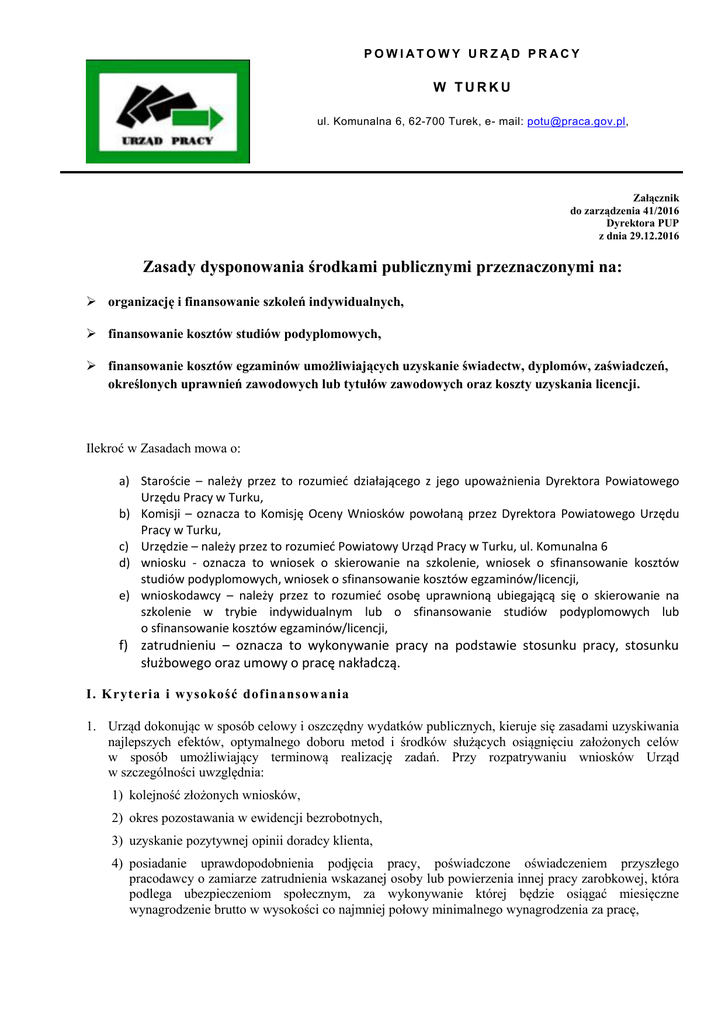POWIAT OWY URZ ĄD PR ACY W TURKU ul. Komunalna 6, 62-700 Turek, e- mail: [email protected], tel. (0-63) 280-23-40, fax (0-63) 280-23-70 email: [email protected] Załącznik do zarządzenia 41/2016 Dyrektora PUP z dnia 29.12.2016 Zasady dysponowania środkami publicznymi przeznaczonymi na: organizację i finansowanie szkoleń indywidualnych, finansowanie kosztów studiów podyplomowych, finansowanie kosztów egzaminów umożliwiających uzyskanie świadectw, dyplomów, zaświadczeń, określonych uprawnień zawodowych lub tytułów zawodowych oraz koszty uzyskania licencji. Ilekroć w Zasadach mowa o: a) Staroście – należy przez to rozumieć działającego z jego upoważnienia Dyrektora Powiatowego Urzędu Pracy w Turku, b) Komisji – oznacza to Komisję Oceny Wniosków powołaną przez Dyrektora Powiatowego Urzędu Pracy w Turku, c) Urzędzie – należy przez to rozumieć Powiatowy Urząd Pracy w Turku, ul. Komunalna 6 d) wniosku - oznacza to wniosek o skierowanie na szkolenie, wniosek o sfinansowanie kosztów studiów podyplomowych, wniosek o sfinansowanie kosztów egzaminów/licencji, e) wnioskodawcy – należy przez to rozumieć osobę uprawnioną ubiegającą się o skierowanie na szkolenie w trybie indywidualnym lub o sfinansowanie studiów podyplomowych lub o sfinansowanie kosztów egzaminów/licencji, f) zatrudnieniu – oznacza to wykonywanie pracy na podstawie stosunku pracy, stosunku służbowego oraz umowy o pracę nakładczą. I. Kryteria i w ysokość dof inansow ania 1. Urząd dokonując w sposób celowy i oszczędny wydatków publicznych, kieruje się zasadami uzyskiwania najlepszych efektów, optymalnego doboru metod i środków służących osiągnięciu założonych celów w sposób umożliwiający terminową realizację zadań. Przy rozpatrywaniu wniosków Urząd w szczególności uwzględnia: 1) kolejność złożonych wniosków, 2) okres pozostawania w ewidencji bezrobotnych, 3) uzyskanie pozytywnej opinii doradcy klienta, 4) posiadanie uprawdopodobnienia podjęcia pracy, poświadczone oświadczeniem przyszłego pracodawcy o zamiarze zatrudnienia wskazanej osoby lub powierzenia innej pracy zarobkowej, która podlega ubezpieczeniom społecznym, za wykonywanie której będzie osiągać miesięczne wynagrodzenie brutto w wysokości co najmniej połowy minimalnego wynagrodzenia za pracę, 5) wywiązanie się przyszłego pracodawcy z zobowiązań umownych z tutejszym urzędem w okresie ostatnich 12 m-cy, 6) uprawdopodobnienie podjęcia działalności gospodarczej po ukończeniu formy wsparcia wg stanu zaawansowania w zakresie podjętych działań, 7) brak odmowy przyjęcia bez uzasadnionej przyczyny propozycji odpowiedniego zatrudnienia lub innej pracy zarobkowej lub innej formy pomocy określonej w ustawie, w okresie ostatnich 12 miesięcy przed dniem złożenia wniosku, 8) efektywność działań w przypadku korzystania z form wsparcia finansowanych z Funduszu Pracy w okresie ostatnich 12 miesięcy, 9) nie korzystanie z innych form wsparcia finansowanych ze środków Funduszu Pracy na dzień rozpatrywania wniosku, 10) adekwatność wyboru formy wsparcia w stosunku do planowanego zatrudnienia lub podjęcia działalności gospodarczej lub ścieżki kariery. 2. Maksymalna, obowiązująca w danym roku wysokość kwot pomocy finansowej w ramach form aktywizacji zawodowej finansowanych z Funduszu Pracy ustalana jest Zarządzeniem Dyrektora Powiatowego Urzędu Pracy w Turku. 3. Do kwoty przeznaczonej na finansowanie wymienionych form wsparcia, o której mowa w pkt 2, wlicza się: 1) uprzednio uzgodnioną należność przysługującą instytucji szkoleniowej/organizatorowi, 2) koszty zakwaterowania i wyżywienia, 3) koszt ubezpieczenia od następstw nieszczęśliwych wypadków w przypadku osób nieposiadających prawa do stypendium w okresie odbywania szkolenia oraz osób posiadających prawo do stypendium, które w trakcie szkolenia podjęły zatrudnienie, inną pracę zarobkową lub działalność gospodarczą, 4) koszty egzaminów umożliwiających uzyskanie świadectw, dyplomów, zaświadczeń, określonych uprawnień zawodowych lub tytułów zawodowych oraz koszty uzyskania licencji niezbędnych do wykonywania danego zawodu. 4. Do kwoty przeznaczonej na finansowanie wymienionych form wsparcia, o której mowa w pkt 2, nie wlicza się: 1) kosztów badań lekarskich i psychologicznych, 2) kosztów ubezpieczenia od następstw nieszczęśliwych wypadków w przypadku podjęcia zatrudnienia, innej pracy zarobkowej lub działalności gospodarczej, uczestnika studiów podyplomowych, 3) kosztów dojazdu (zgodnie z nw. ustawą brak jest możliwości finansowania kosztów dojazdu na studia podyplomowe), koszty te finansowane są w całości ze środków Funduszu Pracy przez Urząd. 5. Na szkolenie indywidualne, studia podyplomowe, egzaminy umożliwiające uzyskanie świadectw, dyplomów, zaświadczeń, określonych uprawnień zawodowych lub tytułów zawodowych oraz uzyskanie licencji kierowane są wyłącznie osoby, które przedstawią uprawdopodobnienie zatrudnienia, innej pracy zarobkowej lub podjęcia działalności gospodarczej oraz wskazany kierunek szkolenia nie jest zaplanowany do realizacji w trybie grupowym. II. Procedura składania wniosków 1. Wnioskodawca zamierzający skorzystać z ww. pomocy składa wniosek do Urzędu. 2. Formularz wniosku dostępny jest w siedzibie Urzędu oraz na stronie internetowej www.pup.turek.pl w zakładce dla bezrobotnych „Pliki do pobrania dla bezrobotnych”. 3. Za datę złożenia wniosku w Urzędzie przyjmuje się datę złożenia poprawnie wypełnionego wniosku z kompletem wymaganych dokumentów. III. Tryb rozpatrywania wniosków 1. Rozpatrywane są tylko wnioski kompletne i prawidłowo sporządzone. 2. Wnioski rozpatrywane są w miarę posiadania środków finansowych przeznaczonych na daną formę pomocy oraz możliwości jej zrealizowania i po spełnieniu wszystkich wymogów formalnych przez wnioskodawcę. 3. Decyzję o sposob