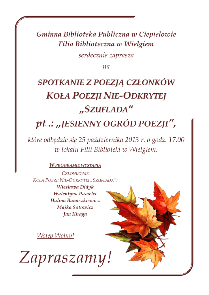 Gminna Biblioteka Publiczna w Ciepielowie Filia Biblioteczna w Wielgiem serdecznie zaprasza na SPOTKANIE Z POEZJĄ CZŁONKÓW KOŁA POEZJI NIE-ODKRYTEJ „SZUFLADA” pt .: „JESIENNY OGRÓD POEZJI”, które odbędzie się 25 października 2013 r. o godz. 17.00 w lokalu Filii Biblioteki w Wielgiem. W PROGRAMIE WYSTĄPIĄ CZŁONKOWIE KOŁA POEZJI NIE-ODKRYTEJ „SZUFLADA”: Wiesława Didyk Walentyna Pawelec Halina Banaszkiewicz Majka Sotowicz Jan Kiraga Wstęp Wolny! Zapraszamy!