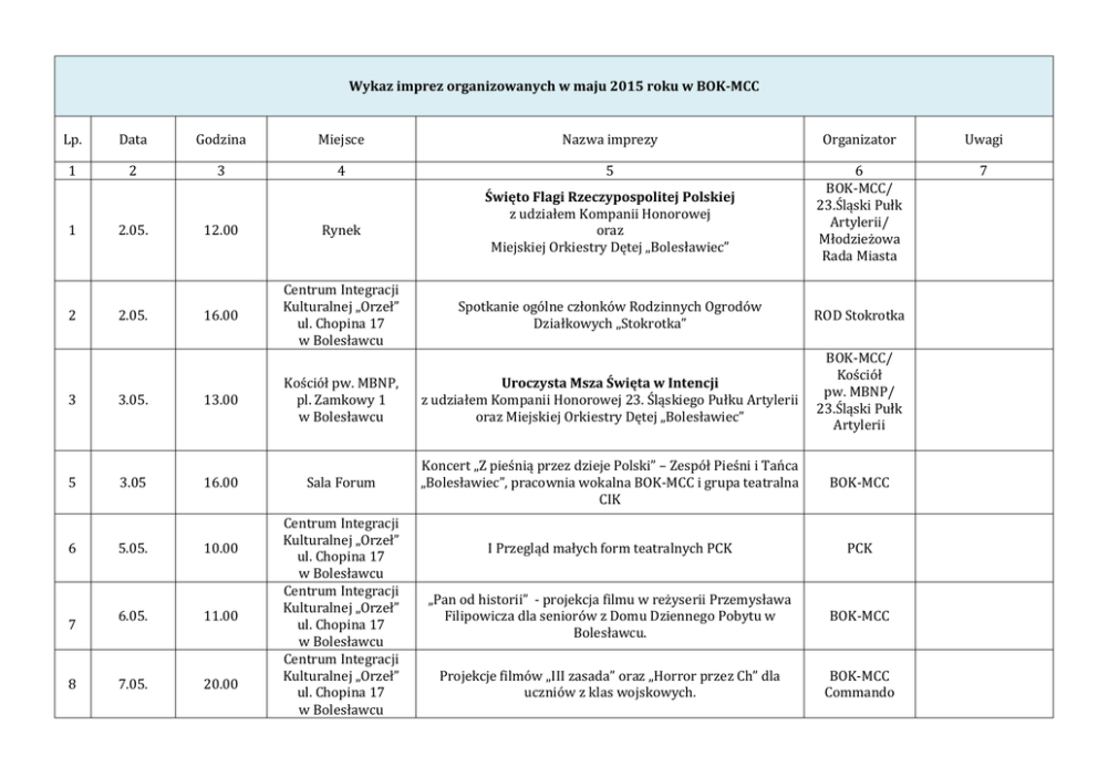 Wykaz imprez organizowanych w maju 2015 roku w BOK-MCC Lp. Data Godzina Miejsce Nazwa imprezy Organizator Uwagi 1 2 3 4 5 6 BOK-MCC/ 23.Śląski Pułk Artylerii/ Młodzieżowa Rada Miasta 7 1 2 2.05. 2.05. 12.00 Rynek 16.00 Centrum Integracji Kulturalnej „Orzeł” ul. Chopina 17 w Bolesławcu Święto Flagi Rzeczypospolitej Polskiej z udziałem Kompanii Honorowej oraz Miejskiej Orkiestry Dętej „Bolesławiec” Spotkanie ogólne członków Rodzinnych Ogrodów Działkowych „Stokrotka” ROD Stokrotka BOK-MCC/ Kościół pw. MBNP/ 23.Śląski Pułk Artylerii 3 3.05. 13.00 Kościół pw. MBNP, pl. Zamkowy 1 w Bolesławcu Uroczysta Msza Święta w Intencji z udziałem Kompanii Honorowej 23. Śląskiego Pułku Artylerii oraz Miejskiej Orkiestry Dętej „Bolesławiec” 5 3.05 16.00 Sala Forum Koncert „Z pieśnią przez dzieje Polski” – Zespół Pieśni i Tańca „Bolesławiec”, pracownia wokalna BOK-MCC i grupa teatralna CIK BOK-MCC I Przegląd małych form teatralnych PCK PCK „Pan od historii” - projekcja filmu w reżyserii Przemysława Filipowicza dla seniorów z Domu Dziennego Pobytu w Bolesławcu. BOK-MCC Projekcje filmów „III zasada” oraz „Horror przez Ch” dla uczniów z klas wojskowych. BOK-MCC Commando 6 7 8 5.05. 10.00 6.05. 11.00 7.05. 20.00 Centrum Integracji Kulturalnej „Orzeł” ul. Chopina 17 w Bolesławcu Centrum Integracji Kulturalnej „Orzeł” ul. Chopina 17 w Bolesławcu Centrum Integracji Kulturalnej „Orzeł” ul. Chopina 17 w Bolesławcu 9 7.05. 17.00 Kino Forum 10 08.05. 05.06. wernisaż 18.00 Galeria „Mała biała” BOK-MCC 11 9.05. 11.00 Sala taneczna BOK-MCC 12 09.05. 09.05.2015r. hol BOK-MCC 70-lecie PCK „Materia – Kształt - Ekspresja” wystawa prac ceramicznych Franka Brinkmanna. Frank Brinkmann (ur. w 1960 w Stendal w Niemczech) rzeźbiarz, ceramik. Ceramiką zajmuje się od 1983 roku. Swój fach szlifował pod okiem takich artystów – ceramików, jak A. Dannegger, H. Skoruppa, F. Stachat i W. Schmiedel. W 1988 roku otrzymał dyplom mistrza ceramiki. Od 1988 r. członek niemieckiego Stowarzyszenia Artystów Plastyków (Der Verband Bildender Künstler). W latach 1992-1999 wykładał ceramikę w Wyższej Szkole Sztuk Wizualnych (Hochschule für Grafik und Buchkunst) w Lipsku. Od 1988 do 2005 roku pracował w charakterze freelance’ra w Centrum Kultury i Sztuki Schaddelmühle. W latach 2003-2004 współpracował z więźniami w areszcie śledczym w Chemnitzer prowadząc zajęcia ze sztuki. I CASTING MISS I MISTER BOLESŁAWIECKIEGO ŚWIĘTA Ceramiki 2015 „Jedno marzenie 1000 żurawi” W ramach Ogólnopolskiego Dnia Marzeń chcielibyśmy skonstruować wspólnie z Wami 1000 żurawi. Akcja będzie polegała na tym , że każdy kto ma jedno ogromne marzenie zapisze je na kartce, z której następnie złoży żurawia (wielkość dowolna). Tak powstały model należy dostarczyć do siedziby Bolesławieckiego Ośrodka Kultury – Międzynarodowego Centrum Ceramiki w Bolesławcu, Pl. Marsz. J. Piłsudskiego 1c, 59-700 Bolesławiec do dnia 10 maja 2015 r. Mamy nadzieję, że uda nam się uzbierać 1000 żurawi z których powstanie instalacja artystyczna w holu naszego ośrodka. Akcję dedykujemy wszystkim tym, którzy nie boją się marzyć! PCK BOK-MCC BOK-MCC BOK-MCC Tych, którzy nie wiedzą jak złożyć żurawia zapraszamy do BOK-MCC(I piętro/hol) już w sobotę 9 maja 2015 r. o godz. 11.00. Wówczas dowiecie się, jak taki model stworzyć, a dla nas, będzie to niepowtarzalna okazja aby wspólnie z Wami „skonstruować” Wasze marzenia! Zapisy w Punkcie Informacji Turystycznej i Kulturalnej, Pl. Piłsudskiego 1c, 59-700 Bolesławiec, tel. 75 645 32 90. Dla zorganizowanych grup przygotowaliśmy cykl warsztatów z tworzenia origami- modelu żurawia, wystarczy umówić się telefonicznie na spotkanie (665894580) 13 14.05. 20.00 14 15.05. 9.30 15 15.05. 11.15 16 15.05. 18.30 17 21.05. 20.00 18 22.05. 10.00 19 22.05. 19.00 Centrum Integracji Kulturalnej „Orzeł” ul. Chopina 17 w Bolesławcu Centrum Integracji Kulturalnej „Orzeł” ul. Chopina 17 w Bolesławcu Centrum Integracji Kulturalnej „Orzeł” ul. Chopina 17 w Bolesławcu Centrum Integracji Kulturalnej „Orzeł” ul. Chopina 17 w Bolesławcu Centrum Integracji Kulturalnej „Orzeł” ul. Chopina 17 w Bolesławcu Centrum Integracji Kulturalnej „Orzeł” ul. Chopina 17 w Bolesławcu Centrum Integracji Kulturalnej „Orzeł” ul. Chopina 17 w Bolesławcu Projekcje filmów „III zasada” oraz „Horror przez Ch” dla uczniów z klas wojskowych. Spektakl Zęboból reż. Igor Fijałkowski - spektakl w wykonaniu aktorów PWST im. L. Solskiego w Krakowie Filia we Wrocławiu dla przedszkolaków – uczestników projektu teatralnego realizowanego w CIK. Spektakl Zęboból reż. Igor Fijałkowski - spektakl w wykonaniu aktorów PWST im. L. Solskiego w Krakowie Filia we Wrocławiu dla przedszkolaków – uczestników projektu teatralnego realizowanego w CIK. BOK-MCC Commando BOK-MCC Biletowana BOK-MCC Biletowana Oko Orła – otwarta prezentacja prac członków stowarzyszenia. BOK-MCC Projekcje filmów „III zasada” oraz „Horror przez Ch” dla uczniów z klas wojskowych. BOK-MCC Commando Przegląd Małych Form Scenicznych „Orzełek” BOK-MCC Kino Niepodległościowe – Śmierć rotmistrza Pileckiego” BOK-MCC, BS „Prawy” 20 23.05. 21 26.05. 19.00 22 27.05 9.00 23 28.05. 20.00 24 29.05. 18.00 Centrum Integracji Kulturalnej „Orzeł” ul. Chopina 17 w Bolesławcu Centrum Integracji Kulturalnej „Orzeł” ul. Chopina 17 w Bolesławcu Kino Forum Centrum Integracji Kulturalnej „Orzeł” ul. Chopina 17 w Bolesławcu Centrum Integracji Kulturalnej „Orzeł” ul. Chopina 17 w Bolesławcu Spektakl w wykonaniu uczniów, rodziców i nauczycieli MZS Nr 3 MZS Nr 3 Koncert z okazji Dnia Matki BOK-MCC Uroczysta Sesja Rady Miasta UM Projekcje filmów „III zasada” oraz „Horror przez Ch” dla uczniów z klas wojskowych. BOK-MCC Commando Koncert A