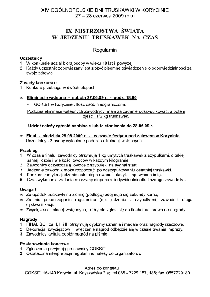XIV OGÓLNOPOLSKIE DNI TRUSKAWKI W KORYCINIE 27 – 28 czerwca 2009 roku IX MISTRZOSTWA ŚWIATA W JEDZENIU TRUSKAWEK NA CZAS Regulamin Uczestnicy 1. W konkursie udział biorą osoby w wieku 18 lat i powyŜej. 2. KaŜdy uczestnik zobowiązany jest złoŜyć pisemne oświadczenie o odpowiedzialności za swoje zdrowie Zasady konkursu : 1. Konkurs przebiega w dwóch etapach • Eliminacje wstępne - sobota 27.06.09 r. - godz. 18.00 - GOKSiT w Korycinie . Ilość osób nieograniczona. Podczas eliminacji wstępnych Zawodnicy mają za zadanie odszypułkować, a potem zjeść 1/2 kg truskawek. Udział naleŜy zgłosić osobiście lub telefonicznie do 28.06.09 r. • Finał - niedziela 28.06.2009 r. - w czasie festynu nad zalewem w Korycinie Uczestnicy - 3 osoby wyłonione podczas eliminacji wstępnych. Przebieg 1. W czasie finału zawodnicy otrzymują 1 kg umytych truskawek z szypułkami, o takiej samej liczbie i wielkości owoców w kaŜdym kilogramie. 2. Zawodnicy oczyszczają owoce z szypułek na sygnał start. 3. Jedzenie zawodnik moŜe rozpocząć po odszypułkowaniu ostatniej truskawki. 4. Konkurs zamyka zjedzenie ostatniego owocu i okrzyk – np. własne imię. 5. Czas wykonania zadania mierzymy stoperem indywidualnie dla kaŜdego zawodnika. Uwaga ! • Za upadek truskawki na ziemię (podłogę) odejmuje się sekundy karne, • Za nie przestrzeganie regulaminu (np: jedzenie z szypułkami) zawodnik ulega dyskwalifikacji. • Zwycięzca eliminacji wstępnych, który nie zgłosi się do finału traci prawo do nagrody. Nagrody 1. FINALIŚCI za I, II i III otrzymują dyplomy uznania i medale oraz nagrody rzeczowe. 2. Dekoracja zwycięzców i wręczenie nagród odbędzie się w czasie trwania imprezy. 3. Zawodnicy kwitują odbiór nagród na piśmie. Postanowienia końcowe 1. Zgłoszenia przyjmują pracownicy GOKSiT. 2. Ostateczna interpretacja regulaminu naleŜy do organizatorów. Adres do kontaktu GOKSiT; 16-140 Korycin; ul. Knyszyńska 2 a; tel.085 - 7229 187, 188; fax. 0857229180 XIV OGÓLNOPOLSKIE DNI TRUSKAWKI W KORYCINIE 27 – 28 czerwca 2009 roku IX MISTRZOSTWA ŚWIATA W JEDZENIU TRUSKAWEK NA CZAS Odpowiedzialni za przygotowanie i przebieg regulamin, medale, dyplomy, nagrody, komisja sędziowska, dokumentacja (druki ) 1. .................................................................. 2. .................................................................. 3. .................................................................. Przygotowanie i materiały : I. ELIMINACJE WSTĘPNE - odpowiedzialny : ............................................................. • • • • • • Komisja sędziowska - ..................................................................................................... Lista startowa uczestników eliminacji wstępnych Oświadczenia zawodników Stoliki odpowiednio do potrzeb 1/2 kg umytych truskawek z szypułkami dla kaŜdego zawodnika 3 pojemniki dla kaŜdej osoby - na truskawki z szypułkami - na truskawki odszypułkowane - pojemnik na szypułki protokół z przebiegu eliminacji • II. FINAŁ odpowiedzialny za przygotowanie i przebieg ........................................................................ • Komisja sędziowska - sędzia główny - - ........................................................................................ sędziowie pomocniczy - ........................................................................................ - ....................................................................................... • • • • • • • • • • stopery Lista startowa uczestników eliminacji wstępnych Podpisane oświadczenia zawodników 3 stoliki po jednym dla kaŜdego zawodnika obrusy jednorazowe na kaŜdy stolik serwetki, ręczniki jednorazowe, pojemnik z wodą - na kaŜdy stolik 1 kg umytych truskawek z szypułkami dla trzech zawodników, o takiej samej wielkości i liczbie owoców w kaŜdym kilogramie. 3 pojemniki dla kaŜdej osoby - na truskawki z szypułkami - na truskawki odszypułkowane - pojemnik na szypułki protokół z przebiegu FINAŁU Lista odbioru nagród