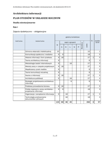 Architektura informacji. Plan studiów niestacjonarnych, rok akademicki 2013/14 Architektura informacji PLAN STUDIÓW W UKŁADZIE ROCZNYM Studia niestacjonarne Rok I Zajęcia dydaktyczne – obligatoryjne godziny kontaktowe kod kursu nazwa kursu E/- A Ochrona własności intelektualnej K L S 15 P punkty ECTS razem W E-learning zajęć w grupach 15 1 5 Komunikacja społeczna i medialna 9 9 18 Historia informacji i form przekazu 9 18 27 Teoria architektury informacji 9 Metodologia badań internetowych 9 Metody pracy w zespole projektowym 9 Współczesny rynek mediów 1 5 9 2 27 5 27 5 9 9 2 Teoria komunikacji wizualnej, 9 9 2 Nauka o informacji 9 Architektura publikacji 9 18 18 18 27 Strategie projektowania architektury informacji 1 5 18 27 4 9 9 5 Podstawy prowadzenia biznesu. 9 18 27 5 Źródła inspiracji w pracy architekta i projektanta informacji 9 9 18 3 Organizacja i zarządzanie informacją 9 Technologia przetwarzania dokumentów cyfrowych 123 1z5 90 18 27 18 18 36 45 294 1 5 3 3 57 Architektura informacji. Plan studiów niestacjonarnych, rok akademicki 2013/14 Kursy do wyboru godziny kontaktowe kod kursu nazwa kursu A Lektorat języka obcego K L S P punkty ECTS razem W E-learning zajęć w grupach E /- 30 3 30 3 Pozostałe zajęcia kod zajęć rodzaj zajęć godz tyg. punkty ECTS Szkolenie BHP 4 0 Szkolenie biblioteczne 2 0 Projektowanie własnej ścieżki edukacji i kariery zawodowej 2 0 Rok II Zajęcia dydaktyczne – obligatoryjne godziny kontaktowe kod kursu nazwa kursu A Humanistyczne aspekty internetu 9 Badanie użytkowników informacji 9 K L S P razem W E-learning zajęć w grupach E/- punkty ECTS 9 Warsztat projektanta grafiki 18 27 18 18 27 1 5 3 Webwriting 9 Pozycjonowanie serwisów internetowych 9 18 27 Etyczne i prawne problemy rozpowszechniania informacji 9 9 18 Wybrane zagadnienia społeczeństwa informacyjnego 9 18 27 Projektowanie wizualne 9 18 27 4 63 54 180 29 2z5 18 2 63 1 zal. 5 4 2 1 4 Architektura informacji. Plan studiów niestacjonarnych, rok akademicki 2013/14 Kursy do wyboru godziny kontaktowe kod kursu nazwa kursu A Wychowanie fizyczne K L S P 15 Lektorat języka obcego razem W E-learning zajęć w grupach E/- punkty ECTS 15 60 60 Seminarium dyplomowe 15 1 1 7 15 2 Wykład w języku obcym 1* lub 9 9 2* Wykład w języku polskim 1 9 9 1* Wykład w języku polskim 2 9 9 1* 27 15 60 15 117 1 14 27 zal. 4 18 2 27 zal. 4 Oferta IINiB/IGiW**– student wybiera przedmioty za 8 pkt. ECTS Projektowanie grafiki dla Internetu 9 18 Zagadnienia typografii i projektowania znaku 18 Organizacja treści w przestrzeniach informacji 18 9 Systemy nawigacji i etykietowania 18 18 4 Fotoedycja 18 18 4 18 27 zal. 4 9 9 zal. 2 9 2 9 9 2 126 162 34 Wizualizacja danych, informacji i wiedzy 9 Współczesny język mediów Ekologia informacji 9 Strategie pozyskiwania informacji 36 Pozostałe zajęcia kod zajęć rodzaj zajęć godz Praktyka zawodowa 40 3z5 tyg. punkty ECTS 3 Architektura informacji. Plan studiów niestacjonarnych, rok akademicki 2013/14 Rok III Zajęcia dydaktyczne – obligatoryjne godziny kontaktowe kod kursu nazwa kursu A K L S P razem W E-learning zajęć w grupach E/- punkty ECTS Grafika informacyjna 6 18 24 1 4 Architektura przestrzeni informacyjnych 6 18 24 1 4 Systemy wyszukiwania informacji 9 Projektowanie stron WWW 9 9 Architektura nowych mediów Użyteczność i ewaluacja systemów informacji 9 9 3 18 27 4 18 18 zal. 3 18 27 5 9 9 2 18 3 Repozytoria cyfrowe Public relations 9 9 48 18 99 165 zal. 2 28 Kursy do wyboru godziny kontaktowe kod kursu nazwa kursu A K L Seminarium dyplomowe S P 15 razem W E-learning zajęć w grupach E/- punkty ECTS 15 8 Wykład w języku obcym 2* lub 9 9 2* Wykład w języku polskim 3 9 9 1* Wykład w języku polskim 4 9 9 1* 42 12 27 15 Oferta IINiB/IGiW**– student wybiera przedmioty za 8 pkt. ECTS Grafika użytkowa 9 Teoria symbolu i koloru 9 18 27 zal. 4 9 2 18 18 2 9 18 27 zal. 4 27 54 81 Systemy zarządzania treścią. Identyfikacja wizualna przestrzeni informacji 4z5 12 Architektura informacji. Plan studiów niestacjonarnych, rok akademicki 2013/14 Pozostałe zajęcia kod zajęć rodzaj zajęć godz Praktyka zawodowa tyg. 70 punkty ECTS 6 Egzamin dyplomowy Tematyka Punkty ECTS Egzamin obejmuje treści kształcenia z całego okresu studiów oraz problematykę ujętą w pracy dyplomowej 8 Uwagi * Na 4 i 5 semestrze student wybiera spośród oferty wykładów ogólnouczelnianych, może wybrać jeden wykład w j. angielskim 15 godz (2 ECTS) lub dwa wykłady w j. polskim - 15 godzin każdy po 1 ECTS. ** Oferta IINiB/IGiW – w semestrach: 3, 4, 5 student wybiera dwa dowolne przedmioty za łączną sumę 8 punktów ECTS. zal. – zaliczenie z oceną (konieczność złożenia projektu, 5z5