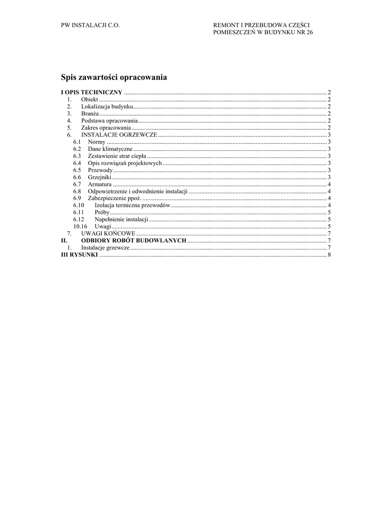 PW INSTALACJI C.O. REMONT I PRZEBUDOWA CZĘŚCI POMIESZCZEŃ W BUDYNKU NR 26 Spis zawartości opracowania I OPIS TECHNICZNY ................................................................................................................................... 2 1. Obiekt ................................................................................................................................................... 2 2. Lokalizacja budynku ............................................................................................................................. 2 3. Branża ................................................................................................................................................... 2 4. Podstawa opracowania.......................................................................................................................... 2 5. Zakres opracowania .............................................................................................................................. 2 6. INSTALACJE OGRZEWCZE ............................................................................................................. 3 6.1 Normy .............................................................................................................................................. 3 6.2 Dane klimatyczne ............................................................................................................................. 3 6.3 Zestawienie strat ciepła .................................................................................................................... 3 6.4 Opis rozwiązań projektowych .......................................................................................................... 3 6.5 Przewody .......................................................................................................................................... 3 6.6 Grzejniki ........................................................................................................................................... 3 6.7 Armatura .......................................................................................................................................... 4 6.8 Odpowietrzenie i odwodnienie instalacji ......................................................................................... 4 6.9 Zabezpieczenie ppoż. ....................................................................................................................... 4 6.10 Izolacja termiczna przewodów..................................................................................................... 4 6.11 Próby ............................................................................................................................................ 5 6.12 Napełnienie instalacji ................................................................................................................... 5 10.16 Uwagi ........................................................................................................................................... 5 7. UWAGI KOŃCOWE ........................................................................................................................... 7 II. ODBIORY ROBÓT BUDOWLANYCH .......................................................................................... 7 1. Instalacje grzewcze ............................................................................................................................... 7 III RYSUNKI ................................................................................................................................................... 8 PW INSTALACJI C.O. REMONT I PRZEBUDOWA CZĘŚCI POMIESZCZEŃ W BUDYNKU NR 26 I OPIS TECHNICZNY 1. Obiekt Remont i przebudowa części pomieszczeń w budynku nr 26 2. Lokalizacja budynku Kompleks Wojskowy 1163, ul. Gdańska 147 Bydgoszcz 3. Branża sanitarna 4. Podstawa opracowania - zlecenie prac projektowych, - projekt architektoniczno-budowlany, - obowiązujące normy i przepisy. 5. Zakres opracowania Opracowanie obejmuje swoim zakresem projekt budowlany wewnętrznych instalacji: • Ogrzewczych centralnego ogrzewania grzejnikowego. 2 PW INSTALACJI C.O. REMONT I PRZEBUDOWA CZĘŚCI POMIESZCZEŃ W BUDYNKU NR 26 6. INSTALACJE OGRZEWCZE 6.1 Normy Norma na obliczanie wsp. przenikania ciepła: Norma na obliczanie projekt. obciążenia cieplnego: PN-EN ISO 6946 PN-EN 12831:2006 6.2 Dane klimatyczne Strefa klimatyczna: Projektowa temperatura zewnętrzna θe: II -18 °C 6.3 Zestawienie strat ciepła Qp= 38,60 kW 6.4 Opis rozwiązań projektowych Instalacje grzewcze zasilane będą w ciepło z istniejącego węzła cieplnego, przyłączonego do miejskiej sieci ciepłowniczej. Istniejącą instalację z uwagi na zużycie należy zdemontować. Projektuje się rozprowadzenie instalacji pod stropem pomieszczeń parteru. Temperatury czynnika grzewczego w instalacji: - centralnego ogrzewania 80/60stC zmienne, 6.5 Przewody Instalację należy wykonać z rur stalowych wykonanych w systemie zaciskowym, np. KAN-therm Steel: - szeroki zakres temperatur pracy od -35°C do 135°C, - odporność na wysokie ciśnienie, do 16 bar. Wybrany system musi być dopuszczony do stosowania w instalacjach grzewczych o temperaturze max do +80stC i ciśnieniu max minimum 3bary. Układanie rurociągów prowadzić w koordynacji z wykonawcą instalacji elektrycznych, stosując zasadę prowadzenia rur z wodą poniżej przewodów elektrycznych. Przestrzegać wytycznych montażowych dostawcy systemu instalacyjnego. 6.6 Grzejniki W pomieszczeniach piwnicy zaprojektowano grzejniki stalowe płytowe z podejściem z boku, np. CosmoNova firmy Vogel&Noot. W pomieszczeniach o dużej wilgotności zaprojektowano grzejniki drabinkowe, np. Berlin firmy Vogel&Noot. Należy przestrzegać minimalnych odstępów pomiędzy grzejnikami a przegrodami budowlanymi: min 7cm nad podłogą, 5cm od lica wykończonej ściany i 7cm od spodu
