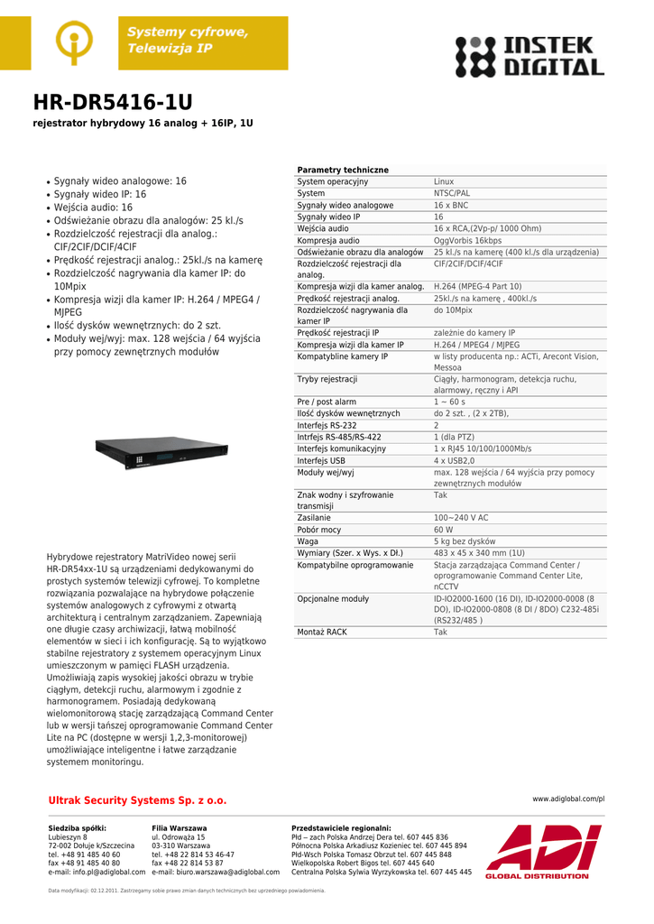HR-DR5416-1U rejestrator hybrydowy 16 analog + 16IP, 1U ● ● ● ● ● ● ● ● ● ● Sygnały wideo analogowe: 16 Sygnały wideo IP: 16 Wejścia audio: 16 Odświeżanie obrazu dla analogów: 25 kl./s Rozdzielczość rejestracji dla analog.: CIF/2CIF/DCIF/4CIF Prędkość rejestracji analog.: 25kl./s na kamerę Rozdzielczość nagrywania dla kamer IP: do 10Mpix Kompresja wizji dla kamer IP: H.264 / MPEG4 / MJPEG Ilość dysków wewnętrznych: do 2 szt. Moduły wej/wyj: max. 128 wejścia / 64 wyjścia przy pomocy zewnętrznych modułów Parametry techniczne System operacyjny System Sygnały wideo analogowe Sygnały wideo IP Wejścia audio Kompresja audio Odświeżanie obrazu dla analogów Rozdzielczość rejestracji dla analog. Kompresja wizji dla kamer analog. Prędkość rejestracji analog. Rozdzielczość nagrywania dla kamer IP Prędkość rejestracji IP Kompresja wizji dla kamer IP Kompatybline kamery IP Tryby rejestracji Pre / post alarm Ilość dysków wewnętrznych Interfejs RS-232 Intrfejs RS-485/RS-422 Interfejs komunikacyjny Interfejs USB Moduły wej/wyj Hybrydowe rejestratory MatriVideo nowej serii HR-DR54xx-1U są urządzeniami dedykowanymi do prostych systemów telewizji cyfrowej. To kompletne rozwiązania pozwalające na hybrydowe połączenie systemów analogowych z cyfrowymi z otwartą architekturą i centralnym zarządzaniem. Zapewniają one długie czasy archiwizacji, łatwą mobilność elementów w sieci i ich konfigurację. Są to wyjątkowo stabilne rejestratory z systemem operacyjnym Linux umieszczonym w pamięci FLASH urządzenia. Umożliwiają zapis wysokiej jakości obrazu w trybie ciągłym, detekcji ruchu, alarmowym i zgodnie z harmonogramem. Posiadają dedykowaną wielomonitorową stację zarządzającą Command Center lub w wersji tańszej oprogramowanie Command Center Lite na PC (dostępne w wersji 1,2,3-monitorowej) umożliwiające inteligentne i łatwe zarządzanie systemem monitoringu. Znak wodny i szyfrowanie transmisji Zasilanie Pobór mocy Waga Wymiary (Szer. x Wys. x Dł.) Kompatybilne oprogramowanie Opcjonalne moduły Montaż RACK Linux NTSC/PAL 16 x BNC 16 16 x RCA,(2Vp-p/ 1000 Ohm) OggVorbis 16kbps 25 kl./s na kamerę (400 kl./s dla urządzenia) CIF/2CIF/DCIF/4CIF H.264 (MPEG-4 Part 10) 25kl./s na kamerę , 400kl./s do 10Mpix zależnie do kamery IP H.264 / MPEG4 / MJPEG w listy producenta np.: ACTi, Arecont Vision, Messoa Ciągły, harmonogram, detekcja ruchu, alarmowy, ręczny i API 1 ~ 60 s do 2 szt. , (2 x 2TB), 2 1 (dla PTZ) 1 x RJ45 10/100/1000Mb/s 4 x USB2,0 max. 128 wejścia / 64 wyjścia przy pomocy zewnętrznych modułów Tak 100~240 V AC 60 W 5 kg bez dysków 483 x 45 x 340 mm (1U) Stacja zarządzająca Command Center / oprogramowanie Command Center Lite, nCCTV ID-IO2000-1600 (16 DI), ID-IO2000-0008 (8 DO), ID-IO2000-0808 (8 DI / 8DO) C232-485i (RS232/485 ) Tak www.adiglobal.com/pl Ultrak Security Systems Sp. z o.o. Siedziba spółki: Lubieszyn 8 72-002 Dołuje k/Szczecina tel. +48 91 485 40 60 fax +48 91 485 40 80 e-mail: [email protected] Filia Warszawa ul. Odrowąża 15 03-310 Warszawa tel. +48 22 814 53 46-47 fax +48 22 814 53 87 e-mail: [email protected] Przedstawiciele regionalni: Płd – zach Polska Andrzej Dera tel. 607 445 836 Północna Polska Arkadiusz Kozieniec tel. 607 445 894 Płd-Wsch Polska Tomasz Obrzut tel. 607 445 848 Wielkopolska Robert Bigos tel. 607 445 640 Centralna Polska Sylwia Wyrzykowska tel. 607 445 445 Data modyfikacji: 02.12.2011. Zastrzegamy sobie prawo zmian danych technicznych bez uprzedniego powiadomienia.