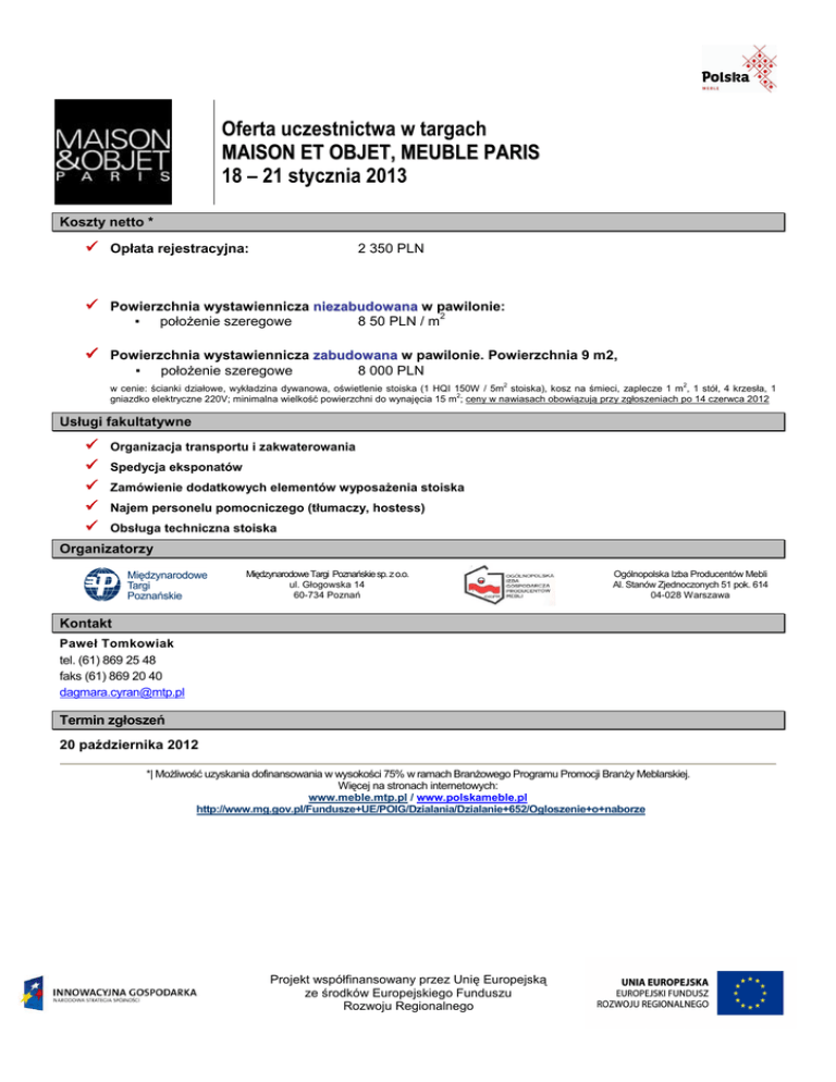 Oferta uczestnictwa w targach MAISON ET OBJET, MEUBLE PARIS 18 – 21 stycznia 2013 Koszty netto * Opłata rejestracyjna: 2 350 PLN Powierzchnia wystawiennicza niezabudowana w pawilonie: połoŜenie szeregowe ▪ 8 50 PLN / m 2 Powierzchnia wystawiennicza zabudowana w pawilonie. Powierzchnia 9 m2, połoŜenie szeregowe ▪ 8 000 PLN 2 2 w cenie: ścianki działowe, wykładzina dywanowa, oświetlenie stoiska (1 HQI 150W / 5m stoiska), kosz na śmieci, zaplecze 1 m , 1 stół, 4 krzesła, 1 2 gniazdko elektryczne 220V; minimalna wielkość powierzchni do wynajęcia 15 m ; ceny w nawiasach obowiązują przy zgłoszeniach po 14 czerwca 2012 Usługi fakultatywne Organizacja transportu i zakwaterowania Spedycja eksponatów Zamówienie dodatkowych elementów wyposaŜenia stoiska Najem personelu pomocniczego (tłumaczy, hostess) Obsługa techniczna stoiska Organizatorzy Międzynarodowe Targi Poznańskie sp. z o.o. ul. Głogowska 14 60-734 Poznań Ogólnopolska Izba Producentów Mebli Al. Stanów Zjednoczonych 51 pok. 614 04-028 Warszawa Kontakt Paweł Tomkowiak tel. (61) 869 25 48 faks (61) 869 20 40 [email protected] Termin zgłoszeń 20 października 2012 *| MoŜliwość uzyskania dofinansowania w wysokości 75% w ramach BranŜowego Programu Promocji BranŜy Meblarskiej. Więcej na stronach internetowych: www.meble.mtp.pl / www.polskameble.pl http://www.mg.gov.pl/Fundusze+UE/POIG/Dzialania/Dzialanie+652/Ogloszenie+o+naborze Projekt współfinansowany przez Unię Europejską ze środków Europejskiego Funduszu Rozwoju Regionalnego