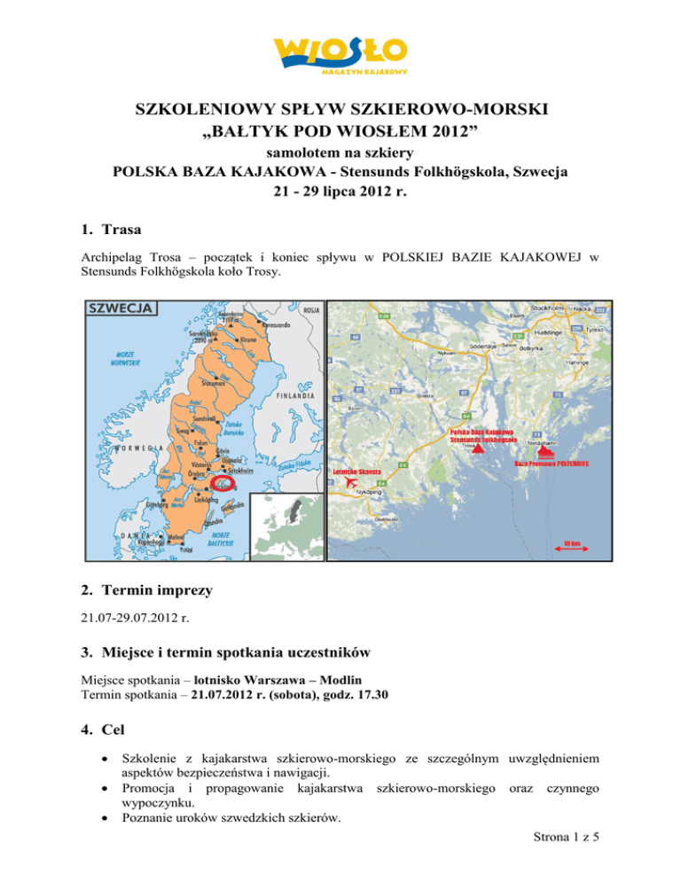 SZKOLENIOWY SPŁYW SZKIEROWO-MORSKI „BAŁTYK POD WIOSŁEM 2012” samolotem na szkiery POLSKA BAZA KAJAKOWA - Stensunds Folkhögskola, Szwecja 21 - 29 lipca 2012 r. 1. Trasa Archipelag Trosa – początek i koniec spływu w POLSKIEJ BAZIE KAJAKOWEJ w Stensunds Folkhögskola koło Trosy. 2. Termin imprezy 21.07-29.07.2012 r. 3. Miejsce i termin spotkania uczestników Miejsce spotkania – lotnisko Warszawa – Modlin Termin spotkania – 21.07.2012 r. (sobota), godz. 17.30 4. Cel Szkolenie z kajakarstwa szkierowo-morskiego ze szczególnym uwzględnieniem aspektów bezpieczeństwa i nawigacji. Promocja i propagowanie kajakarstwa szkierowo-morskiego oraz czynnego wypoczynku. Poznanie uroków szwedzkich szkierów. Strona 1 z 5 Integracja środowiska polskich kajakarzy morskich w celu organizacji wspólnych wypraw. Testy sprzętu. 5. Organizator spływu Po stronie szwedzkiej: Grzegorz Rózik (kom. +46 739 532 419). Po stronie polskiej: Monika Łaskawska (kom. +48 504 624 393), Adam Grzegorzewski (kom. +48 664 74 66 64), Adam Biedrzycki – sprzęt (kom. +48 502 811 017). Redakcja Magazynu Kajakowego WIOSŁO ul. Samsonowicza 2, 25-564 Kielce www.wioslo.pl, www.skanpol.com/kajak e-mail: [email protected] 6. Warunki uczestnictwa Umiejętność pływania kajakiem po wodach nizinnych (nie jest wymagane wcześniejsze pływanie kajakiem po morzu). Umiejętność pływania wpław. Doświadczenie turystyczno-biwakowe. Posiadanie obowiązkowego wyposażenia. Wykonanie kontrolowanej przewrotki („kabiny”) z opuszczeniem kokpitu kajaka w pierwszym dniu szkolenia. Pozytywna weryfikacja, uiszczenie wpisowego oraz wykupienie biletu lotniczego. 7. Koszty uczestnictwa i wykupienie biletów lotniczych 1200 zł – wpisowe od osoby (płatne przelewem). Dla stałych uczestników rabat w wysokości 100 zł. Kwota wpisowego obejmuje: wypożyczenie morskiego kajaka jednoosobowego z wiosłem, fartuchem i kamizelką asekuracyjną (7 dni), transport uczestników z lotniska SztokholmSkavsta do Polskiej Bazy Kajakowej w Stensunds Folkhögskola (ok. 60 km) i z powrotem, trzy noclegi w jurcie z możliwością korzystania z prysznicy oraz elektrycznej sauny, obiad oraz sauna palona drzewem na zakończenie spływu, szkolenie z kajakarstwa szkierowomorskiego ze szczególnym uwzględnieniem aspektów bezpieczeństwa i nawigacji, opiekę doświadczonego instruktora, przygotowanie dla każdego uczestnika map w skali 1:50 000, formalności itp. Ceny wypożyczenia kajaków w Szwecji znacząco odbiegają od cen w Polsce. Dla porównania cena samego wypożyczenia morskiego kajaka jednoosobowego (bez transportu) w okolicach Trosy za jeden dzień wynosi 300 SEK, czyli 138 zł (np. w firmie Hälgö Kajakkafé, http://www.paddling.se). Kurs: 1 SEK – ok. 0,46 PLN Wpisowe należy wpłacać na podany rachunek bankowy po potwierdzeniu u organizatora wstępnej weryfikacji uczestnictwa. Wówczas należy również wykupić bilet lotniczy z Strona 2 z 5 Warszawy we własnym zakresie. Można również wykupić bilet z innego portu lotniczego, lecz transport uczestników będzie zsynchronizowany z samolotem przylatującym z Warszawy. Ze względu na ograniczoną liczbę miejsc dla uczestników (15 osób) organizator prowadzi dwie listy – podstawową i rezerwową. Wszystkie osoby z listy podstawowej proszone są o wykupienie biletów lotniczych i wpłatę wpisowego do dnia 31 maja 2012 r. Po tym terminie zostanie odblokowana lista rezerwowa. Dane do przelewu (tylko wpisowe): Magazyn Kajakowy WIOSŁO ul. Samsonowicza 2, Kielce nr rach.: 50 10205558 1111144404300088 tytuł przelewu: SZKIERY, imię, nazwisko Bilety lotnicze – wylot z lotniska Warszawa-Modlin (planowany termin otwarcia lotniska – czerwiec 2012 r.) Linie lotnicze Wizz Air. Rezerwacja i wykupienie biletów przez Internet. Adres strony: http://www.wizzair.com Na dzień 09.03.2012 r. cena biletu lotniczego to 398 zł (wylot z Warszawy). Cena ta może ulec zmianie (w górę lub w dół). Należy również pamiętać o wykupieniu dodatkowego bagażu rejestrowanego w obie strony! Poniżej dokładne informacje o przelotach z Warszawy. W razie trudności z rezerwacją prosimy o kontakt. WARSZAWA – SZTOKHOLM-SKAVSTA - WARSZAWA Numer Lotu Wylot z Data wylotu Przylot do Data przylotu W6 1501 Warszawa So 21 Lip 2012 19:25 Sztokholm - Skavsta So 21 Lip 2012 21:00 W6 1502 Sztokholm - Skavsta Nd 29 Lip 2012 21:30 Warszawa Nd 29 Lip 2012 23:00 Można również dostać się do Skavsty z innych miast Europy oraz innymi liniami lotniczymi (np. Ryanair), jednak wyjazd z lotniska do bazy będzie zsynchronizowany z lotami z Warszawy. 8. Skrócony program spływu 21 lipca, sobota godz. 17.30 – zbiórka uczestników na lotnisku Warszawa-Modlin. godz. 19.25-21.00 – przelot na lotnisko Sztokholm-Skavsta. godz. 21.30 – transport uczestników do Polskiej Bazy Kajakowej w Stensunds Folkhögskola koło Trosy. godz. 22.30 – przyjazd do Stensunds Folkhögskola. Nocleg we wspólnej jurcie (można również rozstawić własne namioty). 22 lipca, niedziela Dzień szkoleń (teoretyczne i praktyczne). 23 lipca - 28 lipca, poniedziałek - sobota Płynięcie po szkierach w formie pętli z noclegami na wyspach (5 biwaków). Podczas wyprawy przewidziano dalsze szkolenia z kajakarstwa szkierowo-morskiego ze szczególnym uwzględnieniem aspektów bezpieczeństwa i nawigacji. W sobotę wieczorem integracyjna sauna opalana drzewem, położona tuż nad morzem. Strona 3 z 5 29 lipca, niedziela Zakończenie spływu, zdanie sprzętu. Wspólny uroczysty obiad. Czas wolny. godz. 19.00 – wyjazd grupy z Polskiej Bazy Kajakowej w Stensunds Folkhögskola na lotnisko Sztokholm-Skavsta i odlot do Polski. 9. Wyposażenie obowiązkowe uczestnika: telefon komórkowy z obudową wodoszczelną i aktywnym roamingiem, gwizdek, przezroczysty kompas płaski ze skalą od 0 do 360 stopni (umożliwiający jednoczesne posługiwanie się mapą), mapnik wodoszczelny formatu min. A4, sprzęt biwakowy (namiot, śpiwór itp.), żywnoś