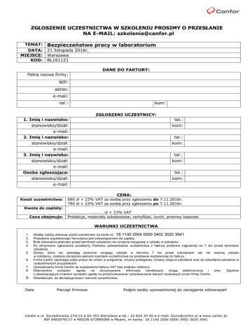 ZGŁOSZENIE UCZESTNICTWA W SZKOLENIU PROSIMY O PRZESŁANIE NA E-MAIL: [email protected] TEMAT: DATA: MIEJSCE: KOD: Bezpieczeństwo pracy w laboratorium 21 listopada 2016r. Warszawa BL161121 DANE DO FAKTURY: Pełna nazwa firmy: NIP: adres: e-mail: tel.: kom: ZGŁOSZENI UCZESTNICY: 1. Imię i nazwisko: stanowisko/dział: tel.: kom: e-mail: 2. Imię i nazwisko: tel.: stanowisko/dział: kom: e-mail: 3. Imię i nazwisko: stanowisko/dział: tel.: kom: e-mail: Osoba zgłaszająca: stanowisko/dział: tel.: kom: e-mail: CENA: Koszt uczestnictwa: 690 zł + 23% VAT za osobę przy zgłoszeniu do 7.11.2016r. 790 zł + 23% VAT za osobę przy zgłoszeniu po 7.11.2016r. Kwota do zapłaty: Cena obejmuje: ………………….......... zł + 23% VAT Prelekcje, materiały szkoleniowe, certyfikat, lunch, przerwy kawowe WARUNKI UCZESTNICTWA 1. 2. 3. 4. 5. 6. 7. 8. 9. Wpłaty należy dokonać przed szkoleniem na konto nr: 18 1140 2004 0000 3402 3020 3541 Przesłanie wypełnionego formularza jest zobowiązaniem do zapłaty. Brak dokonania płatności przed terminem szkolenia nie oznacza rezygnacji z udziału w szkoleniu. Po otrzymaniu zgłoszenia prześlemy Państwu potwierdzenie uczestnictwa z fakturą proforma najpóźniej na 7 dni przed terminem szkolenia. Osoby, które nie odwołają pisemnie swojego udziału w terminie 7 dni przed szkoleniem lub nie wezmą udziału w szkoleniu, zostaną obciążone pełnymi kosztami uczestnictwa na podstawie wystawionej im faktury. Firma Canfor zastrzega sobie prawo do zmian w programie, zmiany prelegenta, zmiany miejsca szkolenia oraz do odwołania szkolenia w uzasadnionych przypadkach. Upoważniamy firmę Canfor do wystawienia faktury VAT bez podpisu odbiorcy. Dobrowolnie wyrażam zgodę na otrzymywanie informacji handlowych drogą elektroniczną i sms. Zgodnie z obowiązującym prawem wyrażam zgodę na przechowywanie i przetwarzanie danych osobowych przez firmę Canfor. Oświadczam, że akceptuję koszt i warunki uczestnictwa. Data Pieczęć firmowa Podpis osoby upoważnionej do zaciągania zobowiązań Canfor ● ul. Szczęśliwicka 27A/15 ● 02-353 Warszawa ● tel.: 22 824 20 05 ● e-mail: [email protected] ● www.canfor.pl NIP 9482079127 ● REGON 672885080 ● Mbank, nr konta: 18 1140 2004 0000 3402 3020 3541