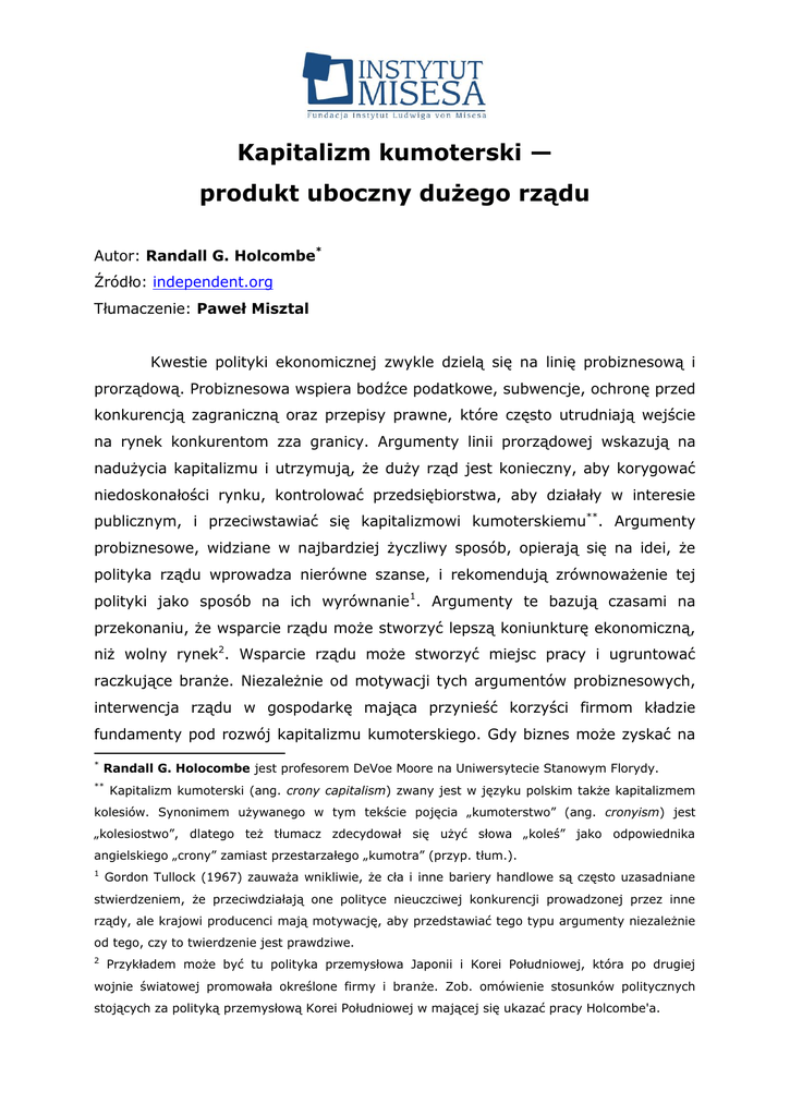 Kapitalizm kumoterski — produkt uboczny dużego rządu Autor: Randall G. Holcombe* Źródło: independent.org Tłumaczenie: Paweł Misztal Kwestie polityki ekonomicznej zwykle dzielą się na linię probiznesową i prorządową. Probiznesowa wspiera bodźce podatkowe, subwencje, ochronę przed konkurencją zagraniczną oraz przepisy prawne, które często utrudniają wejście na rynek konkurentom zza granicy. Argumenty linii prorządowej wskazują na nadużycia kapitalizmu i utrzymują, że duży rząd jest konieczny, aby korygować niedoskonałości rynku, kontrolować przedsiębiorstwa, aby działały w interesie publicznym, i przeciwstawiać się kapitalizmowi kumoterskiemu**. Argumenty probiznesowe, widziane w najbardziej życzliwy sposób, opierają się na idei, że polityka rządu wprowadza nierówne szanse, i rekomendują zrównoważenie tej polityki jako sposób na ich wyrównanie1. Argumenty te bazują czasami na przekonaniu, że wsparcie rządu może stworzyć lepszą koniunkturę ekonomiczną, niż wolny rynek2. Wsparcie rządu może stworzyć miejsc pracy i ugruntować raczkujące branże. Niezależnie od motywacji tych argumentów probiznesowych, interwencja rządu w gospodarkę mająca przynieść korzyści firmom kładzie fundamenty pod rozwój kapitalizmu kumoterskiego. Gdy biznes może zyskać na * Randall G. Holocombe jest profesorem DeVoe Moore na Uniwersytecie Stanowym Florydy. ** Kapitalizm kumoterski (ang. crony capitalism) zwany jest w języku polskim także kapitalizmem kolesiów. Synonimem używanego w tym tekście pojęcia „kumoterstwo” (ang. cronyism) jest „kolesiostwo”, dlatego też tłumacz zdecydował się użyć słowa „koleś” jako odpowiednika angielskiego „crony” zamiast przestarzałego „kumotra” (przyp. tłum.). 1 Gordon Tullock (1967) zauważa wnikliwie, że cła i inne bariery handlowe są często uzasadniane stwierdzeniem, że przeciwdziałają one polityce nieuczciwej konkurencji prowadzonej przez inne rządy, ale krajowi producenci mają motywację, aby przedstawiać tego typu argumenty niezależnie od tego, czy to twierdzenie jest prawdziwe. 2 Przykładem może być tu polityka przemysłowa Japonii i Korei Południowej, która po drugiej wojnie światowej promowała określone firmy i branże. Zob. omówienie stosunków politycznych stojących za polityką przemysłową Korei Południowej w mającej się ukazać pracy Holcombe'a. polityce rządu, potencjał ten kusi przedsiębiorstwa, by szukały korzyści poprzez przysługi rządu, a nie działalność produkcyjną. Im bardziej rząd jest w to zaangażowany, tym bardziej zyskowność przedsięwzięć biznesowych zależy od jego poparcia, a nie od działalności produkcyjnej. Koneksje polityczne stają się więc coraz ważniejsze na drodze do sukcesu w biznesie. Kapitalizm kumoterski jest to taki ustrój gospodarczy, w którym zyskowność przedsiębiorstwa zależy od koneksji politycznych3. Zwolennicy argumentu, że większe zaangażowanie rządu w gospodarkę i dokładniejszy nadzór pomogą opanować kapitalizm kumoterski, nie rozumieją jego prawdziwej przyczyny. Kapitalizm kumoterski jest powodowany przez zaangażowanie rządu w gospodarkę, a większe zaangażowanie rządu tylko pogarsza sytuację. Kapitalizm kumoterski to termin używany o wiele częściej w prasie popularnej niż w piśmiennictwie akademickim. Jednakże, rozumiejąc kapitalizm kumoterski jako system gospodarczy, w którym zyskowność przedsiębiorstw zależy od ich koneksji politycznych, można dostrzec, że znaczna liczba opracowań akademickich wyjaśnia jego przyczyny i konsekwencje. Moimi celami w tym artykule są: po pierwsze, dowiedzenie, że opracowania akademickie analizowały składniki kapitalizmu kumoterskiego od dziesięcioleci i że składniki te są dobrze zrozumiane; po drugie, wykazanie, że wszystkie te składniki wskazują na duży rząd jako przyczynę kapitalizmu kumoterskiego; oraz po trzecie, rozważenie możliwych sposobów kontroli kapitalizmu kumoterskiego. Polityka publiczna a kumoterstwo Literatura akademicka na temat kapitalizmu kumoterskiego zawiera modele, które opisują faktyczne procesy decyzyjne członków rządu i ich „kolesiów” w sektorze prywatnym, zamiast po prostu zakładać, że decyzje polityczne rządu promują interes publiczny. Analitycy ekonomiczni często sugerują, że rząd ingeruje w gospodarkę, aby naprawić problemy rynku lub zwiększyć wyniki gospodarcze, pośrednio implementowania takiej zakładając, polityki, że jaka rząd byłaby ma i chęć, pomocna i możliwość według modeli ekonomistów. Tacy analitycy twierdzą, że jeśli rząd obierze określony kierunek 3 Ta definicja nie oznacza, że kumoterstwo zawsze czyni firmy zyskownymi, ani że bez koneksji politycznych nie będą one przynosić zysków, lecz tylko tyle, że zyski przedsiębiorstw będą większe (lub straty mniejsze) z koneksjami politycznymi niż bez nich. działania, wyniknie z tego konkretna poprawa. Takie rekomendacje nie biorą pod uwagę ograniczonej dostępności informacji, struktury motywacyjnej, której muszą stawiać czoła rządowi decydenci, i kolektywnych procedur decyzyjnych, które w istocie tworzą politykę rządu (Holcombe 2012). W rzeczywistości, rząd może nie chcieć lub nie być w stanie wdrożyć rekomendowanych działań. Decyzje rządu są podejmowane przez jednostki, ale pojedyncza jednostka nie może decydować jednostronnie. Przedstawianie „rządu” jako pojedynczego decydenta jest więc nierealistyczne. Polityka publiczna jest wynikiem kolektywnego procesu decyzyjnego. Zalecenie, żeby rząd zrobił „to”, aby osiągnąć „tamto”, wynika z traktowania rządu jako wszechwiedzącego łaskawego dyktatora i ignoruje prawdopodobieństwo, że członkowie rządu nie mają informacji lub bodźców, aby zastosować rekomendowaną politykę. Rząd nie jest wszechwiedzący. Informacje, których potrzebowałby, aby wprowadzić zalecaną 