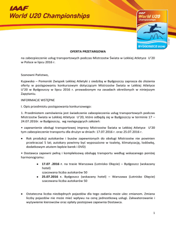 OFERTA PRZETARGOWA na zabezpieczenie usług transportowych podczas Mistrzostw Świata w Lekkiej Atletyce U’20 w Polsce w lipcu 2016 r. Szanowni Państwo, Kujawsko – Pomorski Związek Lekkiej Atletyki z siedzibą w Bydgoszczy zaprasza do złożenia oferty w postępowaniu konkursowym dotyczącym Mistrzostw Świata w Lekkiej Atletyce U’20 w Bydgoszczy w lipcu 2016 r. prowadzonym na zasadach określonych w niniejszym Zapytaniu. INFORMACJE WSTĘPNE I. Opis przedmiotu postępowania konkursowego: 1. Przedmiotem zamówienia jest świadczenie zabezpieczenia usług transportowych podczas Mistrzostw Świata w Lekkiej Atletyce U’20, które odbędą się w Bydgoszczy w terminie 17 – 24.07.2016r. w Bydgoszczy, wg następujących założeń: • zapewnienie obsługi transportowej imprezy Mistrzostw Świata w Lekkiej Atletyce U’20 tym zabezpieczenie transportu dla drużyn w dniach: 17.07.2016 r. oraz 25.07.2016 r. Rok produkcji autokarów i busów zapewnionych do obsługi Mistrzostw nie powinien przekraczać 5 lat; autokary powinny być wyposażone w toaletę, klimatyzację, lodówkę, dodatkowym atutem będzie barek i DVD) • Dostawca zapewni pełną i kompleksową obsługę transportu według wskazanego poniżej harmonogramu: 17.07 .2016 r. na trasie Warszawa (Lotnisko Okęcie) – Bydgoszcz (wskazany hotel) szacowana liczba autokarów 50 25.07.2016 r. Bydgoszcz (wskazany hotel) – Warszawa (Lotnisko Okęcie) szacowana liczba autokarów 50 Ostateczna liczba niezbędnych pojazdów dla tego zadania może ulec zmianom. Zmiana liczby pojazdów nie może mieć wpływu na cenę jednostkową usługi. Zakwaterowanie i wyżywienie kierowców oraz opłaty postojowe zapewnia Dostawca. 1 zapewnienie przeszkolonego personelu, z minimum trzyletnim doświadczeniem w kierowaniu autokarami, z prawem jazdy kategorii D. Wymagana znajomość języka angielskiego w stopniu podstawowym, znajomość języka ojczystego obsługiwanej reprezentacji podczas turnieju będzie dodatkowym atutem. Dostawca zobowiązany jest zapewnić odpowiedni jednolity strój kierowców: marynarka, koszula, spodnie. udostępnienie floty autobusowej, dedykowanej do obsługi drużyn uczestniczących w celu wykonania brandingu powierzchni zewnętrznej autobusów oraz pozostałych elementów wewnątrz autobusów (zagłówki, siedziska, etc.). Wszystkie wskazane elementy, będą zainstalowane wyłącznie na czas trwania Mistrzostw, po którym zostaną zdemontowane bez uszkodzenia żadnych elementów autobusu. Za montaż i demontaż odpowiedzialny jest Zamawiający. Zapewnienie odpowiedniej współpracy ze wskazanymi, lokalnymi koordynatorami KPZLA. W tym celu – dostawca wyznaczy lokalnych oficerów dyżurnych (dyspozytorów) pozostającą w gotowości operacyjnej przez cały okres usługi. Osoby ta będą odpowiadały za usługi świadczone przez dostawcę. posiadanie co najmniej 5 – letniego udokumentowanego doświadczenia w obsłudze transportowej imprez. Ze względu na charakter imprezy – Mistrzostwa Świata oraz rangę świadczenia usług transportowych dla poszczególnych grup mogą się różnić od podanych w załączniku nr 1 (program mistrzostw), przy czym zmiany mogą też mieć charakter ilościowy. Uczestnik przetargu tym samym akceptuje warunki i gwarantuje, że w przypadku większej liczby godzin zapewnia pełna obsługę zgodnie ze złożoną ofertą bez dodatkowych kosztów dla Zamawiającego. II Wykonawca musi spełniać następujące warunki: Oferent zobowiązuje się, że w : przypadku awarii (bądź jakiejkolwiek innej okoliczności uniemożliwiającej ze względu na stan techniczny autokaru na miejsce imprezy) do zapewnienia autokaru zastępczego, tego samego standardu w ciągu max. 40 minut. Do ofert należy dołączyć ogólne informacje o firmie wraz z kopiami wszelkich wymaganych zezwoleń na prowadzenie tego typu działalności oraz minimum trzy referencje z wykonanych projektów. O udzielenie zamówienia mogą się ubiegać wykonawcy, którzy spełniają następujące warunki: 2 1. posiadają uprawnienia do wykonywania określonej działalności lub czynności, jeżeli przepisy prawa nakładają obowiązek posiadania takich uprawnień, 2. posiadają niezbędną wiedzę i doświadczenie w obsłudze imprez sportowych 3. dysponują potencjałem technicznym i zasobami zdolnymi do wykonania zamówienia, 4. znajdują się w sytuacji ekonomicznej i finansowej zapewniającej wykonanie zamówienia. III Wykaz oświadczeń, dokumentów i informacji jakie mają dostarczyć Wykonawcy Ocena spełniania w/w warunków dokonana zostanie w oparciu o informacje zawarte w dokumentach i oświadczeniach złożonych przez Wykonawcę. Z treści załączonych dokumentów musi wynikać jednoznacznie, iż w/w warunki Wykonawca spełnił. Wykonawca zobowiązany jest złożyć oświadczenie o spełnianiu warunków udziału w postępowaniu i niepodleganiu wykluczeniu z postępowania, o treści zgodnej ze wzorem stanowiącym Załącznik nr 1 do niniejszego zapytania ofertowego, a także niżej wymienione dokumenty: 1) wypełniony i podpisany formularz ofertowy (wg wzoru, który stanowi załącznik nr 1) wraz ze stosownym pełnomocnictwem w przypadku, gdy umocowanie osoby podpisującej nie wynika bezpośrednio ze złożonego w ofercie odpisu, o którym mowa w pkt 2 poniżej, 2) aktualny odpis z właściwego rejestru lub z centralnej ewidencji i informacji o działalności gospodarczej, jeżeli odrębne przepisy wymagają wpisu do rejestru lub ewidencji wystawiony nie wcześniej niż 3 miesiące przed upływem terminu składania ofert wraz z oświadczeniem, że dane zawarte w odpisie są aktualne i nie uległy zmianie, 3) aktualne zaświadczenie właściwego naczelnika urzędu skarbowego potwierdzające, że Oferent nie zalega z opłacaniem podatków lub zaświadczenie, że uzyskał przewidziane prawem zwolnienie, odroczenie lub rozłożenie na raty zaległych płatności lub wstrzymanie w całości wykonania decyzji właściwego organu 
