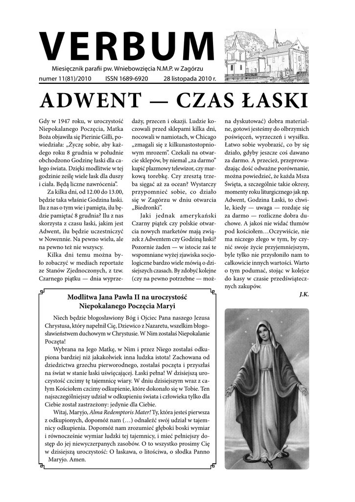VERBUM Miesięcznik parafii pw. Wniebowzięcia N.M.P. w Zagórzu numer 11(81)/2010 ISSN 1689-6920 28 listopada 2010 r. ADWENT — CZAS ŁASKI Gdy w 1947 roku, w uroczystość Niepokalanego Poczęcia, Matka Boża objawiła się Pierinie Gilli, powiedziała: „Życzę sobie, aby każdego roku 8 grudnia w południe obchodzono Godzinę łaski dla całego świata. Dzięki modlitwie w tej godzinie ześlę wiele łask dla duszy i ciała. Będą liczne nawrócenia”. Za kilka dni, od 12.00 do 13.00, będzie taka właśnie Godzina łaski. Ilu z nas o tym wie i pamięta, ilu będzie pamiętać 8 grudnia? Ilu z nas skorzysta z czasu łaski, jakim jest Adwent, ilu będzie uczestniczyć w Nowennie. Na pewno wielu, ale na pewno też nie wszyscy. Kilka dni temu można było zobaczyć w mediach reportaże ze Stanów Zjednoczonych, z tzw. Czarnego piątku — dnia wyprze- daży, przecen i okazji. Ludzie koczowali przed sklepami kilka dni, nocowali w namiotach, w Chicago „zmagali się z kilkunastostopniowym mrozem”. Czekali na otwarcie sklepów, by niemal „za darmo” kupić plazmowy telewizor, czy markową torebkę. Czy zresztą trzeba sięgać aż za ocean? Wystarczy przypomnieć sobie, co działo się w Zagórzu w dniu otwarcia „Biedronki”. Jaki jednak amerykański Czarny piątek czy polskie otwarcia nowych marketów mają związek z Adwentem czy Godziną łaski? Pozornie żaden — w istocie zaś te wspomniane wyżej zjawiska socjologiczne bardzo wiele mówią o dzisiejszych czasach. By zdobyć kolejne (czy na pewno potrzebne — moż- Modlitwa Jana Pawła II na uroczystość Niepokalanego Poczęcia Maryi Niech będzie błogosławiony Bóg i Ojciec Pana naszego Jezusa Chrystusa, który napełnił Cię, Dziewico z Nazaretu, wszelkim błogosławieństwem duchowym w Chrystusie. W Nim zostałaś Niepokalanie Poczęta! Wybrana na Jego Matkę, w Nim i przez Niego zostałaś odkupiona bardziej niż jakakolwiek inna ludzka istota! Zachowana od dziedzictwa grzechu pierworodnego, zostałaś poczęta i przyszłaś na świat w stanie łaski uświęcającej. Łaski pełna! W dzisiejszą uroczystość czcimy tę tajemnicę wiary. W dniu dzisiejszym wraz z całym Kościołem czcimy odkupienie, które dokonało się w Tobie. Ten najszczególniejszy udział w odkupieniu świata i człowieka tylko dla Ciebie został zastrzeżony: jedynie dla Ciebie. Witaj, Maryjo, Alma Redemptoris Mater! Ty, która jesteś pierwsza z odkupionych, dopomóż nam (…) odnaleźć swój udział w tajemnicy odkupienia. Dopomóż nam zrozumieć głęboki boski wymiar i równocześnie wymiar ludzki tej tajemnicy, i mieć pełniejszy dostęp do jej niewyczerpanych zasobów. O to wszystko prosimy Cię w dzisiejszą uroczystość: O łaskawa, o litościwa, o słodka Panno Maryjo. Amen. na dyskutować) dobra materialne, gotowi jesteśmy do olbrzymich poświęceń, wyrzeczeń i wysiłku. Łatwo sobie wyobrazić, co by się działo, gdyby jeszcze coś dawano za darmo. A przecież, przeprowadzając dość odważne porównanie, można powiedzieć, że każda Msza Święta, a szczególnie takie okresy, momenty roku liturgicznego jak np. Adwent, Godzina Łaski, to chwile, kiedy — uwaga — rozdaje się za darmo — rozliczne dobra duchowe. A jakoś nie widać tłumów pod kościołem…Oczywiście, nie ma niczego złego w tym, by czynić swoje życie przyjemniejszym, byle tylko nie przysłoniło nam to całkowicie innych wartości. Warto o tym podumać, stojąc w kolejce do kasy w czasie przedświątecznych zakupów. J.K. Listopadowe refleksje fot. Z. Wrona Każdy z nas zdaje sobie doskonale sprawę z szybko mijającego czasu. Każdy wie, a może sam odczuł to, czego poetka Maryla Wolska doświadczyła, że ta ścieżka, którą szło się kiedyś całą rodziną na groby bliskich, może się nie zmieniła, lecz zmienia się jedno — odchodzą ludzie, świadkowie, którzy często, niestety, żywą historię zamykają trumiennym wiekiem zimnych ust. Zapisują oni na kartach wspomnień swe dzieje — mniej lub bardziej chlubne — i choć co rok jest ich mniej, pozostawiają nam coś jeszcze ważniejszego — miłość wdrukowaną w naszych sercach atramentem patriotyzmu. Ile tego patriotyzmu w nas jeszcze jest, odpowiedzmy sobie sami. fot. Z. Wrona Co roku między groby nieciekawe, bo obce Dróżką tą samą, w Zaduszki Szłam z Tatkiem i Mamą Maleńka z wiankami Za nami obie staruszki Widzę ich wszystkich jak dzisiaj… Co roku w Zaduszki idę tą samą drogą Lecz nie ma już ze mną nikogo na szlaku stromej dróżki. Nim kiedyś sama tu spocznę, zapalam światła coroczne Sama. (…) Maria Wolska, Zaduszki Była właścicielką Rymanowa, piękną i wpływową kobietą, pracy jednak się nie bała. Robiła wszystko, by biedną galicyjską ludność wyrwać z nędzy, która trawiła na przełomie XIX i XX wieku niejedną nie tylko chłopską ale i małomieszczańską rodzinę. Założyła szkółki snycerskie i szkołę haftu, pokazywała, jak chłopcy mogli sobie dorobić, rzeźbiąc przy pasieniu krów. A kiedy pojawiły się pierwsze głosy o niezwykłych wodach, doprowadziła do rozkwitu uzdrowiska. Sama walczyła z cholerą i opiekowała się chorymi. A pochodziła z wpływowej rodziny Działyńskich. Anna była najmłodszą córką Tytusa Działyńskiego — wielkiego pa2 trioty. On także otaczał opieką młodych zdolnych ludzi, wspomagał weteranów ruchów niepodległościowych z 1831 i 1848 roku, podtrzymywał finansowo polskie firmy, ale równie ważnym w okresie zaborów była dla niego troska o język i kulturę polską. Biblioteka kórnicka i wydawnictwo znane było szeroko właśnie dzięki Tytusowi. Wiedział on także, że patriotyzmu nie można zamknąć tylko we własnym domu, że trzeba go przekazać dalej i w następne pokolenia, co zresztą uczynił, jak po latach wspominała jedna z córek: „doszliśmy do przekonania, iż człowiek nie jest stworzony, ażeby sobie dogadzał i dla siebie żył, że musi wier