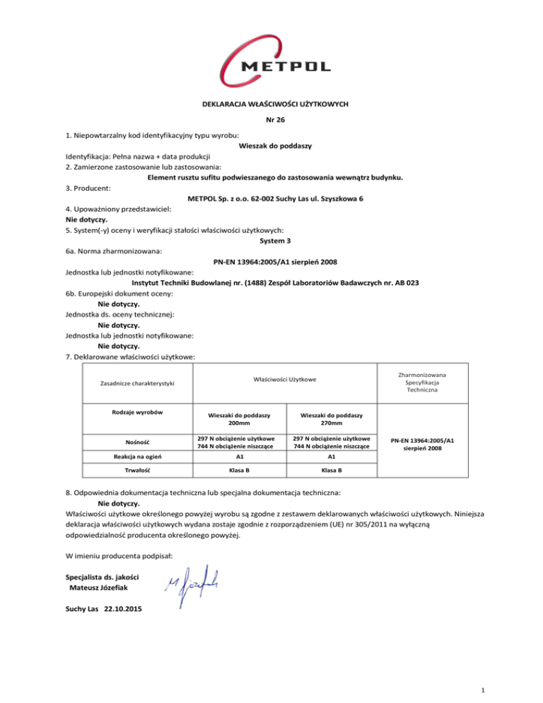 DEKLARACJA WŁAŚCIWOŚCI UŻYTKOWYCH Nr 26 1. Niepowtarzalny kod identyfikacyjny typu wyrobu: Wieszak do poddaszy Identyfikacja: Pełna nazwa + data produkcji 2. Zamierzone zastosowanie lub zastosowania: Element rusztu sufitu podwieszanego do zastosowania wewnątrz budynku. 3. Producent: METPOL Sp. z o.o. 62-002 Suchy Las ul. Szyszkowa 6 4. Upoważniony przedstawiciel: Nie dotyczy. 5. System(-y) oceny i weryfikacji stałości właściwości użytkowych: System 3 6a. Norma zharmonizowana: PN-EN 13964:2005/A1 sierpień 2008 Jednostka lub jednostki notyfikowane: Instytut Techniki Budowlanej nr. (1488) Zespół Laboratoriów Badawczych nr. AB 023 6b. Europejski dokument oceny: Nie dotyczy. Jednostka ds. oceny technicznej: Nie dotyczy. Jednostka lub jednostki notyfikowane: Nie dotyczy. 7. Deklarowane właściwości użytkowe: Rodzaje wyrobów Nośność Zharmonizowana Specyfikacja Techniczna Właściwości Użytkowe Zasadnicze charakterystyki Wieszaki do poddaszy 200mm 297 N obciążenie użytkowe 744 N obciążenie niszczące Wieszaki do poddaszy 270mm 297 N obciążenie użytkowe 744 N obciążenie niszczące Reakcja na ogień A1 A1 Trwałość Klasa B Klasa B PN-EN 13964:2005/A1 sierpień 2008 8. Odpowiednia dokumentacja techniczna lub specjalna dokumentacja techniczna: Nie dotyczy. Właściwości użytkowe określonego powyżej wyrobu są zgodne z zestawem deklarowanych właściwości użytkowych. Niniejsza deklaracja właściwości użytkowych wydana zostaje zgodnie z rozporządzeniem (UE) nr 305/2011 na wyłączną odpowiedzialność producenta określonego powyżej. W imieniu producenta podpisał: Specjalista ds. jakości Mateusz Józefiak Suchy Las 22.10.2015 1