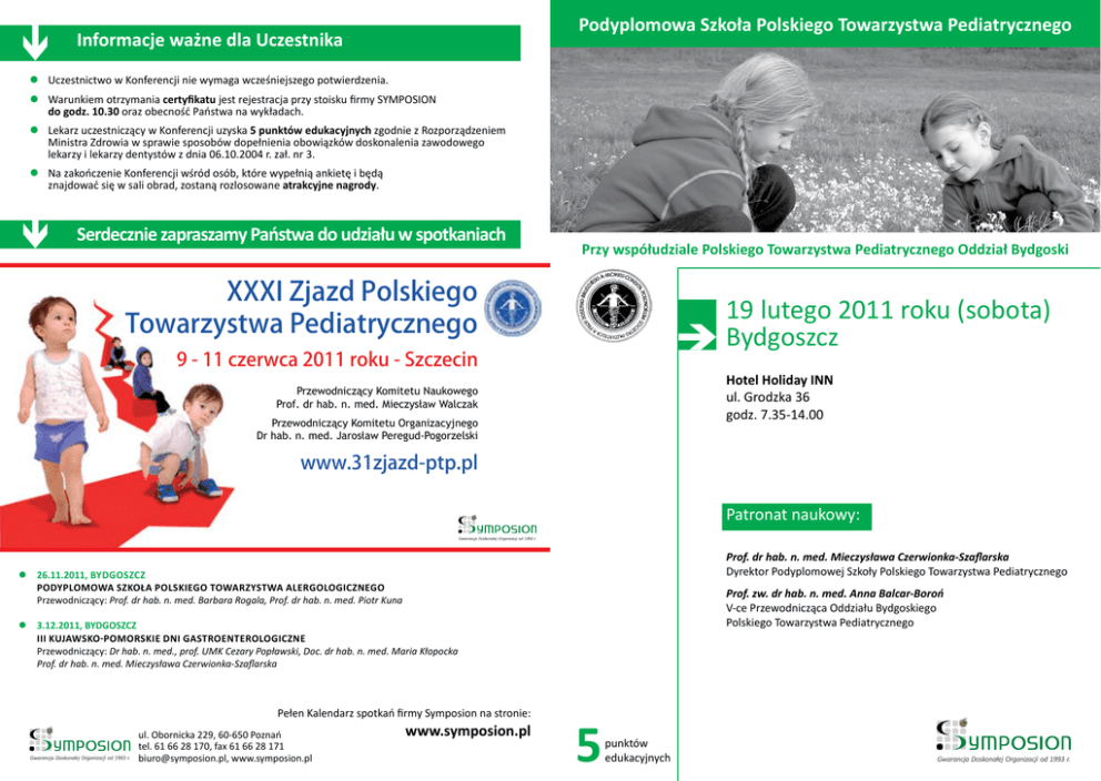 Podyplomowa Szkoła Polskiego Towarzystwa Pediatrycznego Informacje ważne dla Uczestnika Uczestnictwo w Konferencji nie wymaga wcześniejszego potwierdzenia. Warunkiem otrzymania certyfikatu jest rejestracja przy stoisku firmy SYMPOSION do godz. 10.30 oraz obecność Państwa na wykładach. Lekarz uczestniczący w Konferencji uzyska 5 punktów edukacyjnych zgodnie z Rozporządzeniem Ministra Zdrowia w sprawie sposobów dopełnienia obowiązków doskonalenia zawodowego lekarzy i lekarzy dentystów z dnia 06.10.2004 r. zał. nr 3. Na zakończenie Konferencji wśród osób, które wypełnią ankietę i będą znajdować się w sali obrad, zostaną rozlosowane atrakcyjne nagrody. Serdecznie zapraszamy Państwa do udziału w spotkaniach Przy współudziale Polskiego Towarzystwa Pediatrycznego Oddział Bydgoski XXXI Zjazd Polskiego Towarzystwa Pediatrycznego 19 lutego 2011 roku (sobota) Bydgoszcz 9 - 11 czerwca 2011 roku - Szczecin Hotel Holiday INN ul. Grodzka 36 godz. 7.35-14.00 Przewodniczący Komitetu Naukowego Prof. dr hab. n. med. Mieczysław Walczak Przewodniczący Komitetu Organizacyjnego Dr hab. n. med. Jarosław Peregud-Pogorzelski www.31zjazd-ptp.pl Patronat naukowy: Prof. dr hab. n. med. Mieczysława Czerwionka-Szaflarska Dyrektor Podyplomowej Szkoły Polskiego Towarzystwa Pediatrycznego 26.11.2011, Bydgoszcz Podyplomowa Szkoła Polskiego Towarzystwa Alergologicznego Przewodniczący: Prof. dr hab. n. med. Barbara Rogala, Prof. dr hab. n. med. Piotr Kuna Prof. zw. dr hab. n. med. Anna Balcar-Boroń V-ce Przewodnicząca Oddziału Bydgoskiego Polskiego Towarzystwa Pediatrycznego 3.12.2011, BYDGOSZCZ III Kujawsko-Pomorskie Dni Gastroenterologiczne Przewodniczący: Dr hab. n. med., prof. UMK Cezary Popławski, Doc. dr hab. n. med. Maria Kłopocka Prof. dr hab. n. med. Mieczysława Czerwionka-Szaflarska Pełen Kalendarz spotkań firmy Symposion na stronie: ul. Obornicka 229, 60-650 Poznań tel. 61 66 28 170, fax 61 66 28 171 [email protected], www.symposion.pl www.symposion.pl 5 punktów edukacyjnych GŁÓWNY PARTNER konferencji PARTNERZY AFLOFARM AXELLUS GOLDMED merck NESTLE QPHARMA SEQUOIA VITAMED VITIS PHARMA PATRONAT MEDIALNY PROGRAM 7.35-8.20Rejestracja uczestników 8.20-8.30Otwarcie konferencji 8.30-8.45Wykład inaugurujący Przyszłość Polskiego Towarzystwa Pediatrycznego w świetle zmian w organizacji i finansowaniu opieki medycznej nad populacją wieku rozwojowego. Prof. dr hab. n. med. Alicja Chybicka 8.45-10.15 Sesja IGrant Naukowy firmy Teva Przewodnicząca: Prof. dr hab. n. med. Mieczysława Czerwionka-Szaflarska Zakażenie atypowe górnych dróg oddechowych. Prof. dr hab. n. med. Mieczysława Czerwionka-Szaflarska Antybiotyki a układ odpornościowy. Prof. dr hab. n. med. Maria Korzon Prezentacja leków firmy Teva. Przedstawiciel firmy Teva. Antybiotyki u dzieci chorych onkologicznie. Prof. dr hab. n. med. Alicja Chybicka Panel pytań sms’owych – Dyskusja z udziałem wykładowców sesji I. 10.15-11.45 Sesja II Przewodnicząca: Prof. dr hab. n. med. Mieczysława Czerwionka-Szaflarska Rekomendacje Zespołu Ekspertów w sprawie suplementacji kwasu dokozaheksaenowego i innych kwasów ω – 3 u kobiet ciężarnych, karmiących piersią oraz niemowląt i dzieci do lat 3. Prof. dr hab. n. med. Mieczysława Czerwionka-Szaflarska Zespól hemolityczno – mocznicowy. Prof. dr hab. n. med. Danuta Zwolińska Prezentacja leków firmy Axellus. Przedstawiciel firmy Axellus. Dziecko z chorobą nowotworową – co jest po drugiej stronie lustra? Prof. dr hab. n. med. Mariusz Wysocki Prezentacja leków firmy Merck. Przedstawiciel firmy Merck. Oparzenia chemiczne przewodu pokarmowego u dzieci. Doc. dr hab. n. med. Anna Szaflarska-Popławska Panel pytań sms’owych – Dyskusja z udziałem wykładowców sesji II. 11.45-12.00 Przerwa na kawę 12.00-12.45 Sesja IIIGrant naukowy firmy Pfizer Panel dyskusyjny „Młodzieńcze idiopatyczne zapalenie stawów” Przewodnicząca: Prof. dr hab. n. med. Lidia Rutkowska-Sak Młodzieńcze idiopatyczne zapalenie stawów – co powinien wiedzieć pediatra? Prof. dr hab. n. med. Lidia Rutkowska-Sak Prezentacja przypadku. Dr n. med. Iwona Słowińska Dyskusja 12.45-14.00Sesja IV Przewodniczący: Prof. dr hab. n. med. Wojciech Cichy Autyzm u dzieci. Prof. dr hab. n. med. Maria Korzon Co lekarz powinien wiedzieć o Lactobacillus reuteri? Prof. dr hab. n. med. Mieczysława Czerwionka-Szaflarska Prezentacja leków firmy Ewopharma. Przedstawiciel firmy Ewopharma. Screening – badania przesiewowe – podstawowy etap działalności prewencyjnej lekarza POZ. Prof. dr hab. n. med. Marian Krawczyński Współistnienie chorób w polu wątrobowo – trzustkowo – jelitowym: prawda czy fałsz? Prof. dr hab. n. med. Wojciech Cichy Panel pytań sms’owych – Dyskusja z udziałem wykładowców sesji IV. 14.00Zamknięcie sympozjum Serdecznie zapraszamy Państwa do aktywnego udziału w dyskusji na zakończenie każdej sesji i przesyłanie pytań poprzez sms. Wykładowcy z przyjemnością odpowiedzą na Państwa pytania.