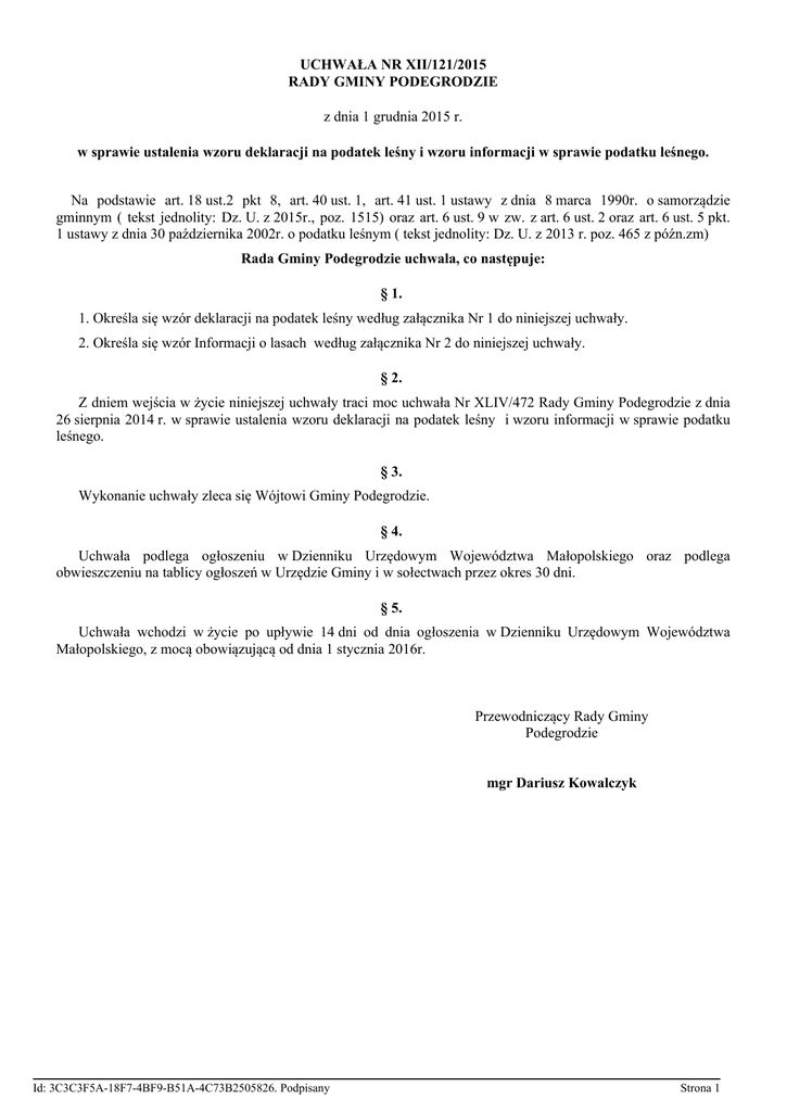 UCHWAŁA NR XII/121/2015 RADY GMINY PODEGRODZIE z dnia 1 grudnia 2015 r. w sprawie ustalenia wzoru deklaracji na podatek leśny i wzoru informacji w sprawie podatku leśnego. Na podstawie art. 18 ust.2 pkt 8, art. 40 ust. 1, art. 41 ust. 1 ustawy z dnia 8 marca 1990r. o samorządzie gminnym ( tekst jednolity: Dz. U. z 2015r., poz. 1515) oraz art. 6 ust. 9 w zw. z art. 6 ust. 2 oraz art. 6 ust. 5 pkt. 1 ustawy z dnia 30 października 2002r. o podatku leśnym ( tekst jednolity: Dz. U. z 2013 r. poz. 465 z późn.zm) Rada Gminy Podegrodzie uchwala, co następuje: § 1. 1. Określa się wzór deklaracji na podatek leśny według załącznika Nr 1 do niniejszej uchwały. 2. Określa się wzór Informacji o lasach według załącznika Nr 2 do niniejszej uchwały. § 2. Z dniem wejścia w życie niniejszej uchwały traci moc uchwała Nr XLIV/472 Rady Gminy Podegrodzie z dnia 26 sierpnia 2014 r. w sprawie ustalenia wzoru deklaracji na podatek leśny i wzoru informacji w sprawie podatku leśnego. § 3. Wykonanie uchwały zleca się Wójtowi Gminy Podegrodzie. § 4. Uchwała podlega ogłoszeniu w Dzienniku Urzędowym Województwa Małopolskiego oraz podlega obwieszczeniu na tablicy ogłoszeń w Urzędzie Gminy i w sołectwach przez okres 30 dni. § 5. Uchwała wchodzi w życie po upływie 14 dni od dnia ogłoszenia w Dzienniku Urzędowym Województwa Małopolskiego, z mocą obowiązującą od dnia 1 stycznia 2016r. Przewodniczący Rady Gminy Podegrodzie mgr Dariusz Kowalczyk Id: 3C3C3F5A-18F7-4BF9-B51A-4C73B2505826. Podpisany Strona 1 Zał. Nr 1 do Uchwały Nr XII/121/2015 Rady Gminy Podegrodzie z dnia 01.12. 2015r. ..................................................................... (pieczęć nagłówkowa podatnika) NIP ............................................................. REGON ...................................................... Nazwa i nr rejestru ..................................... Urząd Gminy Podegrodzie DEKLARACJA NA PODATEK LEŚNY NA ROK .......................... Obliczenie podatku leśnego na rok .................. Przedmiot opodatkowania Pow. w ha fizycznych wynikająca z ewidencji gruntów i budynków Stawka podatku Kwota podatku po zaokrągleniu do pełnej złotówki Określone w ustawie o podatku leśnym lasy, z wyjątkiem lasów zajętych na prowadzenie innej działalności gospodarczej niż działalność leśna Zwolnienia od podatku leśnego na podstawie art. 7 ust. 1 ustawy o podatku leśnym Przedmiot zwolnienia Pow. w ha fizycznych wynikająca z ewidencji gruntów i budynków Stawka podatku Kwota zwolnienia od podatku Lasy z drzewostanem w wieku do 40 lat Lasy wpisane indywidualnie do rejestru zabytków Użytki ekologiczne Zwolnienia od podatku leśnego na podstawie art. 7 ust. 2 ustawy o podatku leśnym Treść Pow. w ha fizycznych wynikająca z ewidencji gruntów i budynków Stawka podatku Kwota podatku ....................................... ......................................... ..................................... (nazwisko i imię osoby odpowiedzialnej za prawidłowe obliczenie podatku) ( kierownik jednostki) ( podpis księgowego) Id: 3C3C3F5A-18F7-4BF9-B51A-4C73B2505826. Podpisany Strona 1 Wypełnia Urząd 1. W wyniku kontroli wstępnej przypada : Do przypisu zł Do odpisu zł 2. Wprowadzono poprawki: - przypisy objęto decyzją Nr ............................................ z dnia............................................ - odpisy – zawiadomiono pismem Nr ..................................z dnia .......................................... Podegrodzie, dnia............................. ................................................... /podpis sprawdzającego/ Pouczenie: Zgodnie z art. 6 ust. 5 ustawy z dnia 30 listopada 2002r. o podatku leśnym (tekst jednolity: Dz. U. 2013r. poz. 465)- osoby prawne, jednostki organizacyjne w tym spółki nieposiadające osobowości prawnej, jednostki organizacyjne Lasów Państwowych a także jednostki organizacyjne Agencji Nieruchomości Rolnych, są obowiązane: 1. Składać w terminie do dnia 15 stycznia, organowi podatkowemu właściwemu ze względu na miejsce położenia lasów , deklaracje na podatek leśny na dany rok podatkowy, sporządzone na formularzu według ustalonego wzoru, a jeżeli obowiązek podatkowy powstał po tym dniu- w terminie 14 dni od dnia zaistnienia okoliczności uzasadniających powstanie tego obowiązku, a w razie zaistnienia zmian, o których mowa w art. 5 ust. 4 ustawy o podatku leśnym, skorygować odpowiednio deklaracje w terminie 14 dni od dnia zaistnienia tych zmian. 2. Wpłacać obliczony w deklaracji podatek leśny bez wezwania- na indywidualny rachunek bankowy, w ratach proporcjonalnych do czasu trwania obowiązku podatkowego, w terminie do dnia 15 każdego miesiąca. 3. W przypadku gdy kwota podatku nie przekracza 100 zł, podatek jest płatny jednorazowo w terminie płatności pierwszej raty ( art. 6 ust. 7a ustawy z dnia 30 listopada 2002r. o podatku leśnym - tekst jednolity: Dz. U. 2013r. poz. 465 w brzmieniu od 1 stycznia 2016r.). 4. Obowiązek składania deklaracji dotyczy osób prawnych i jednostek, będących: 1) właścicielami lasów; 2) posiadaczami samoistnymi lasów; 3) użytkownikami wieczystymi lasów; 4) posiadaczami lasów, stanowiących własność Skarbu Państwa lub jednostki samorządu terytorialnego. Obowiązek podatkowy w zakresie podatku leśnego od lasów pozostających w zarządzie Państwowego Gospodarstwa Leśnego Lasy Państwowe, zwanego dalej "Lasami Państwowymi", oraz wchodzących w skład Zasobu Własności Rolnej Skarbu Państwa, nieobjętych obowiązkiem podatkowym na podstawie ust. 1 pkt 4, ciąży odpowiednio na jednostkach organizacyjnych Agencji Nieruchomości Rolnych i Lasów Państwowych. Id: 3C3C3F5A-18F7-4BF9-B51A-4C73B2505826. Podpisany Strona 2 Jeżeli las stanowi współwłasność lub znajduje się w posiadaniu osób fizycznych oraz osób prawnych, jednostek organizacyjnych, w tym spółek, nieposiadających osobowości prawnej