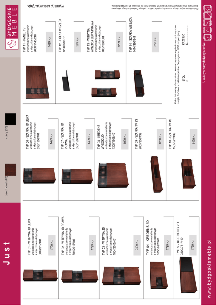 www.bydgoskiemeble.pl 1799 PLN 2200/761/440 TYP 5 - KREDENS 2D 1799 PLN w standardzie oświetlenie z włącznikiem dotykowym 1650/892/401 TYP 04 - KREDENS 3D 2499 PLN 1004/2015/401 w standardzie oświetlenie z włącznikiem dotykowym TYP 03 - WITRYNA 2D 1799 PLN 604/2015/401 w standardzie oświetlenie z włącznikiem dotykowym TYP 02 - WITRYNA 1D PRAWA 1799 PLN 604/2015/401 w standardzie oświetlenie z włącznikiem dotykowym TYP 01 - WITRYNA 1D LEWA Just orzech koniak (H8) 1499 PLN TYP 10 - SZAFKA TV 4S 1585/527/439 1250 PLN TYP 09 - SZAFKA TV 2S 2005/356/439 1999 PLN 1305/1506/401 w standardzie oświetlenie z włącznikiem dotykowym TYP 08 - KREDENS WYSOKI 2D 1499 PLN 653/1506/401 w standardzie oświetlenie z włącznikiem dotykowym TYP 07 - SZAFKA 1D PRAWA 1499 PLN 653/1506/401 w standardzie oświetlenie z włącznikiem dotykowym TYP 06 - SZAFKA 1D LEWA czarny (CZ) KRZESŁO K............................ U autoryzowanych dystrybutorów: STÓŁ S............................ Pełna i aktualną ofertę stołów i krzeseł dopasowanych do naszych wyrobów znajdą Państwo w oddzielnej ulotce. Do programu JUST proponujemy: 850 PLN TYP 14 - SZAFKA WISZĄCA 1474/390/341 1299 PLN 400/1300/301 w standardzie oświetlenie z włącznikiem dotykowym TYP 13 - WITRYNA WISZĄCA LEWA/PRAWA 299 PLN TYP 12 - PÓŁKA WISZĄCA 1200/320/216 1499 PLN 2000/1145/218 TYP 11 - PANEL TV w standardzie oświetlenie z włącznikiem dotykowym wymiary: szer./wys./głęb. Oferta niniejsza nie jest ofertą w rozumieniu przepisów kodeksu cywilnego. Producent zastrzega sobie prawo dokonywania zmian konstrukcyjnych w oferowanych modelach mebli nie zmieniając ich ogólnego charakteru.