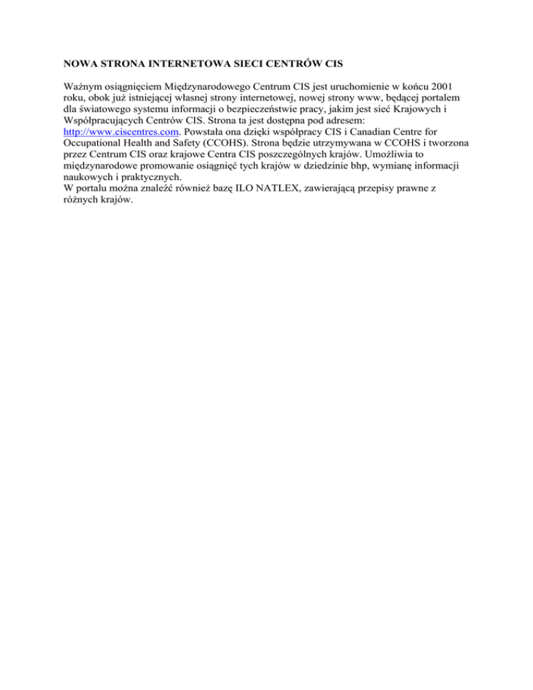 NOWA STRONA INTERNETOWA SIECI CENTRÓW CIS Ważnym osiągnięciem Międzynarodowego Centrum CIS jest uruchomienie w końcu 2001 roku, obok już istniejącej własnej strony internetowej, nowej strony www, będącej portalem dla światowego systemu informacji o bezpieczeństwie pracy, jakim jest sieć Krajowych i Współpracujących Centrów CIS. Strona ta jest dostępna pod adresem: http://www.ciscentres.com. Powstała ona dzięki współpracy CIS i Canadian Centre for Occupational Health and Safety (CCOHS). Strona będzie utrzymywana w CCOHS i tworzona przez Centrum CIS oraz krajowe Centra CIS poszczególnych krajów. Umożliwia to międzynarodowe promowanie osiągnięć tych krajów w dziedzinie bhp, wymianę informacji naukowych i praktycznych. W portalu można znaleźć również bazę ILO NATLEX, zawierającą przepisy prawne z różnych krajów.