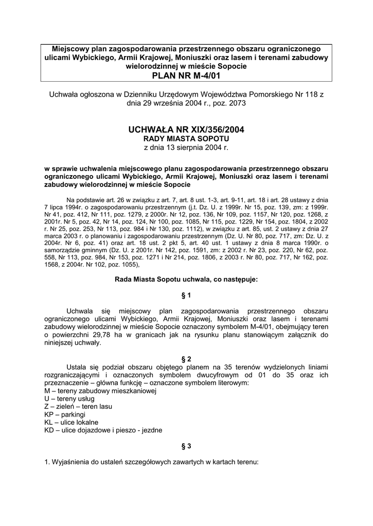 Miejscowy plan zagospodarowania przestrzennego obszaru ograniczonego ulicami Wybickiego, Armii Krajowej, Moniuszki oraz lasem i terenami zabudowy wielorodzinnej w mieście Sopocie PLAN NR M-4/01 Uchwała ogłoszona w Dzienniku Urzędowym Województwa Pomorskiego Nr 118 z dnia 29 września 2004 r., poz. 2073 UCHWAŁA NR XIX/356/2004 RADY MIASTA SOPOTU z dnia 13 sierpnia 2004 r. w sprawie uchwalenia miejscowego planu zagospodarowania przestrzennego obszaru ograniczonego ulicami Wybickiego, Armii Krajowej, Moniuszki oraz lasem i terenami zabudowy wielorodzinnej w mieście Sopocie Na podstawie art. 26 w związku z art. 7, art. 8 ust. 1-3, art. 9-11, art. 18 i art. 28 ustawy z dnia 7 lipca 1994r. o zagospodarowaniu przestrzennym (j.t. Dz. U. z 1999r. Nr 15, poz. 139, zm: z 1999r. Nr 41, poz. 412, Nr 111, poz. 1279, z 2000r. Nr 12, poz. 136, Nr 109, poz. 1157, Nr 120, poz. 1268, z 2001r. Nr 5, poz. 42, Nr 14, poz. 124, Nr 100, poz. 1085, Nr 115, poz. 1229, Nr 154, poz. 1804, z 2002 r. Nr 25, poz. 253, Nr 113, poz. 984 i Nr 130, poz. 1112), w związku z art. 85, ust. 2 ustawy z dnia 27 marca 2003 r. o planowaniu i zagospodarowaniu przestrzennym (Dz. U. Nr 80, poz. 717, zm: Dz. U. z 2004r. Nr 6, poz. 41) oraz art. 18 ust. 2 pkt 5, art. 40 ust. 1 ustawy z dnia 8 marca 1990r. o samorządzie gminnym (Dz. U. z 2001r. Nr 142, poz. 1591, zm: z 2002 r. Nr 23, poz. 220, Nr 62, poz. 558, Nr 113, poz. 984, Nr 153, poz. 1271 i Nr 214, poz. 1806, z 2003 r. Nr 80, poz. 717, Nr 162, poz. 1568, z 2004r. Nr 102, poz. 1055), Rada Miasta Sopotu uchwala, co następuje: §1 Uchwala się miejscowy plan zagospodarowania przestrzennego obszaru ograniczonego ulicami Wybickiego, Armii Krajowej, Moniuszki oraz lasem i terenami zabudowy wielorodzinnej w mieście Sopocie oznaczony symbolem M-4/01, obejmujący teren o powierzchni 29,78 ha w granicach jak na rysunku planu stanowiącym załącznik do niniejszej uchwały. §2 Ustala się podział obszaru objętego planem na 35 terenów wydzielonych liniami rozgraniczającymi i oznaczonych symbolem dwucyfrowym od 01 do 35 oraz ich przeznaczenie – główna funkcję – oznaczone symbolem literowym: M – tereny zabudowy mieszkaniowej U – tereny usług Z – zieleń – teren lasu KP – parkingi KL – ulice lokalne KD – ulice dojazdowe i pieszo - jezdne §3 1. Wyjaśnienia do ustaleń szczegółowych zawartych w kartach terenu: - - - - intensywność zabudowy określa ustalona dopuszczalna wysokość zabudowy oraz dopuszczalny procent terenu przeznaczony pod zabudowę, wysokość zabudowy = wysokość budynku mierzona od naturalnej warstwicy terenu uśrednionej w granicach rzutu budynku do kalenicy względnie innego najwyższego punktu budynku lub wg ustaleń szczegółowych (nie dotyczy kominów i akcentów architektonicznych), teren przeznaczony pod zabudowę = powierzchnia zabudowy wyznaczona przez rzut pionowy zewnętrznych krawędzi budynku na powierzchnię terenu; do powierzchni zabudowy nie wlicza się: ● powierzchni obiektów budowlanych ani ich części nie wystających ponad powierzchnię terenu, ● powierzchni elementów drugorzędnych, np. schodów zewnętrznych, ramp zewnętrznych, daszków, markiz, występów dachowych, oświetlenia zewnętrznego, określone na rysunku planu linie zabudowy nie dotyczą wykuszy, balkonów, schodów, ganków wejściowych, werand, ustalenie zakazów wtórnych podziałów działek – nie dotyczy możliwości podziałów korygujących i porządkujących, stawka procentowa – jednorazowa opłata wnoszona na rzecz gminy, określona w stosunku procentowym do wzrostu wartości nieruchomości w związku z uchwaleniem planu na zasadach określonych w art. 36 ust. 3 wymienionej ustawy o zagospodarowaniu przestrzennym, stan istniejący – stan na rok 2001. 2. Ustalenia szczegółowe planu zawierają poniższe karty terenu od nr 01 do nr 35. 3. Karty terenu: patrz pliki kart terenu wg oznaczeń na rysunku planu. §4 Integralną częścią uchwały jest rysunek miejscowego planu zagospodarowania przestrzennego obszaru ograniczonego ulicami Wybickiego, Armii Krajowej, Moniuszki oraz lasem i terenami zabudowy wielorodzinnej w mieście Sopocie w skali 1:2000. Układ oznaczeń na rysunku planu – na rysunku planu określono: ● granicę planu, ● linie rozgraniczające tereny o różnych funkcjach lub różnych zasadach zagospodarowania, ● nieprzekraczalne linie zabudowy dla budynków projektowanych, ● granicę Trójmiejskiego Parku Krajobrazowego, ● pomniki przyrody, ● granicę strefy „A” pełnej ochrony historycznej struktury przestrzennej, ● obiekty i zespoły zabytkowe wpisane do rejestru zabytków wg stanu na maj 2001 r., ● budynki wskazane do ochrony, ● dąb objęty ochroną ekspozycji i zabytkowy kasztan, ● wymagane przejścia piesze. §5 Zobowiązuje się Prezydenta Miasta do: 1) przedstawienia Wojewodzie Pomorskiemu niniejszej uchwały wraz z dokumentacją planistyczną w celu oceny zgodności z prawem, 2) skierowania, w terminie nie dłuższym niż 30 dni, niniejszej uchwały do ogłoszenia w Dzienniku Urzędowym Województwa Pomorskiego, 3) umieszczenia niniejszej uchwały na tablicy ogłoszeń Urzędu Miasta. §6 Uchwała wchodzi w życie po upływie 14 dni od dnia jej ogłoszenia w Dzienniku Urzędowym Województwa Pomorskiego, z wyjątkiem §5, który wchodzi w życie z dniem podjęcia uchwały. Przewodniczący Rady Miasta Sopotu W. Augustyniak