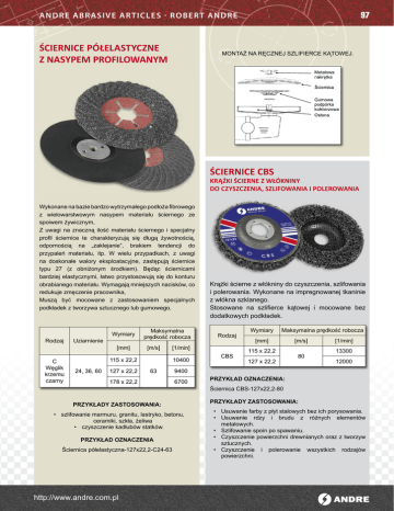 97 A N DRE AB R A SI V E A R T I CL E S · R O B E R T A N DR E ŚCIERNICE PÓŁELASTYCZNE Z NASYPEM PROFILOWANYM Montaż na ręcznej szlifierce kątowej. ŚCIERNICE CBS KRĄŻKI ŚCIERNE Z WŁÓKNINY DO CZYSZCZENIA, SZLIFOWANIA I POLEROWANIA Wykonane na bazie bardzo wytrzymałego podłoża fibrowego z wielowarstwowym nasypem materiału ściernego ze spoiwem żywicznym, Z uwagi na znaczną ilość materiału ściernego i specjalny profil ściernice te charakteryzują się długą żywotnością, odpornością na „zaklejanie”, brakiem tendencji do przypaleń materiału, itp. W wielu przypadkach, z uwagi na doskonałe walory eksploatacyjne, zastępują ściernice typu 27 (z obniżonym środkiem). Będąc ściernicami bardziej elastycznymi, łatwo przystosowują się do konturu obrabianego materiału. Wymagają mniejszych nacisków, co redukuje zmęczenie pracownika, Muszą być mocowane z zastosowaniem specjalnych podkładek z tworzywa sztucznego lub gumowego, Rodzaj C Węglik krzemu czarny Uziarnienie Wymiary [mm] Maksymalna prędkość robocza [m/s] 127 x 22,2 10400 63 178 x 22,2 6700 • szlifowanie marmuru, granitu, lastryko, betonu, ceramiki, szkła, żeliwa • czyszczenie kadłubów statków. PRZYKŁAD OZNACZENIA Ściernica półelastyczna-127x22,2-C24-63 CBS Wymiary Maksymalna prędkość robocza [mm] 115 x 22,2 127 x 22,2 [m/s] 80 [1/min] 13300 12000 9400 PRZYKŁADY ZASTOSOWANIA: http://www.andre.com.pl Rodzaj [1/min] 115 x 22,2 24, 36, 60 Krążki ścierne z włókniny do czyszczenia, szlifowania i polerowania. Wykonane na impregnowanej tkaninie z włókna szklanego. Stosowane na szlifierce kątowej i mocowane bez dodatkowych podkładek. PRZYKŁAD OZNACZENIA: Ściernica CBS-127x22,2-80 PRZYKŁADY ZASTOSOWANIA: • Usuwanie farby z płyt stalowych bez ich porysowania. • Usuwanie rdzy i brudu z różnych elementów metalowych. • Szlifowanie spoin po spawaniu. • Czyszczenie powierzchni drewnianych oraz z tworzyw sztucznych. • Czyszczenie i polerowanie wszystkich rodzajów powierzchni.