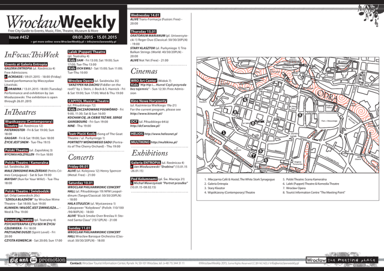 WrocławWeekly Wednesday 14.01 ALIVE Trans-Formacja (Fusion: Free) 20:00 Free City Guide to Events, Music, Film, Theatre, Museum & More Thursday 15.01 Issue #452 ORATORIUM MARIANUM (pl. Uniwersytecki 1) Reger Duo (Classical: 50/30/20PLN) - 19:00 STARY KLASZTOR (ul. Purkyniego 1) Trio Balkan Strings (World: 40/30/20PLN) 20:00 ALIVE Not Yet (Free) - 21:00 09.01.2015 - 15.01.2015 > get more online: www.WroclawWeekly.pl > [email protected] InFocus:ThisWeek Events at Galeria Entropia Galeria Entropia (ul. Rzeźnicza 4) Free Admissions > ACROASIS / 09.01.2015 - 18:00 (Friday) Sound performance by Mieczysław Litwiński. > DRABINA / 13.01.2015 -18:00 (Tuesday) Performance and exhibition by Jan Mioduszewski. The exhibition is open through 26.01.2015 InTheatres Współczesny (Contemporary) Theatre (ul. Rzeźnicza 12) Paternoster - Fri & Sat 19:00; Sun 18:00 Gałgan - Fri & Sat 19:00; Sun 18:00 Życie jest snem - Tue-Thu 19:15 Polski Theatre (ul. Zapolskiej 3) Wycinka Holzfällen - Fri-Sun 18:00 Polski Theatre / Kameralna (ul. Świdnicka 28) Małe Zbrodnie Małżeńskie (Petits Crimes Conjugaux) - Sat & Sun 19:00 Mayday (Run for Your Wife!) - Tue-Thu 18:00 Polski Theatre / Świebodzki (pl. Orląt Lwowskich 20c) “Szkoła Błaznów" by Wrocław Mime Theatre - Sat 18:00; Sun 19:00 Kliniken / Miłość jest zimniejsza... Wed & Thu 19:00 Komedia Theatre (pl. Teatralny 4) Psychoterapia czyli sex w życiu człowieka - Fri 18:00 Przyjazne Dusze (Spirit Level) - Fri 20:00 Czysta komercja - Sat 20:00; Sun 17:00 Lalek (Puppet) Theatre (pl. Teatralny 4) Kids SAM - Fri 13:00; Sat 19:00; Sun 17:00; Tue-Thu 13:00 Kids Och Emil! - Sat 15:00; Sun 11:00; Tue-Thu 10:00 Wrocław Opera (ul. Świdnicka 35) “Skrzypek na dachu (Fiddler on the roof)" by J. Stein, J. Bock & S. Harnick - Fri & Sat 19:00; Sun 17:00; Wed & Thu 19:00 Cinemas WRO Art Center (Widok 7) Kids “Hip Hip i... Hurra! Czyli przyroda bez tajemnic" - Sun 12:30 /Free Admission CAPITOL Musical Theatre Kino Nowe Horyzonty (ul. Piłsudskiego 72) Kids Zaczarowane Podwórko - Fri 9:00, 11:30; Sat & Sun 16:00 Kocham cię. Ja ciebie też nie. Serge Gainsbourg - Fri-Sun 19:00 Nine - Thu 19:00 (ul. Kazimierza Wielkiego 19a-21) For the current program, please see http://www.kinonh.pl/ Teatr Pieśń Kozła (Song of The Goat Theatre / ul. Purkyniego 1) Portrety Wiśniowego sadu (Portraits of The Cherry Orchard) - Thu 19:00 HELIOS http://www.heliosnet.pl Concerts Friday 09.01 ALIVE (ul. Kolejowa 12) Henry Spencer (Metal: Free) - 21:00 Saturday 10.01 WROCŁAW PHILHARMONIC CONCERT HALL (ul. Piłsudskiego 19) NFM Leopoldinum (Tango/Classical: 50/30/20PLN) - 18:00 HALA STULECIA (ul. Wystawowa 1) Zakopower “Kolędowo" (Polish: 110/100 /90/80PLN) - 18:00 ALIVE “Black Smoke Over Breslau II: Stoned Santa Claus" (15/12PLN) - 21:00 4 pl. Jana Pawła II 2 DCF (ul. Piłsudskiego 64/a) 3 8 http://dcf.wroclaw.pl/ 1 MULTIKINO http://multikino.pl/ Exhibitions 7 Galeria ENTROPIA (ul. Rzeźnicza 4) > Jan Mioduszewski “Drabina" (13.01.15 5 6 -26.01.15) Pod Kolumnami (pl. Św. Macieja 21) > Michał Wawrzyniak “Portret przodka" (10.01.15-08.02.15) Sunday 11.01 WROCŁAW PHILHARMONIC CONCERT HALL Wrocław Baroque Orchestra (Classical: 50/30/20PLN) - 18:00 Contact: Wrocław Tourist Information Center, Rynek 14, 50-101 Wrocław, tel. (+48 71) 344 31 11 1. 2. 3. 4. Mleczarnia Café & Hostel, The White Stork Synagogue Galeria Entropia Stary Klasztor Współczesny (Contemporary) Theatre 5. 6. 7. 8. Polski Theatre: Scena Kameralna Lalek (Puppet) Theatre & Komedia Theatre Wrocław Opera Tourist Information Centre "The Meeting Point" 9 ©WrocławWeekly 2015, Some Rights Reserved CC [BY-NC-ND] // [email protected]