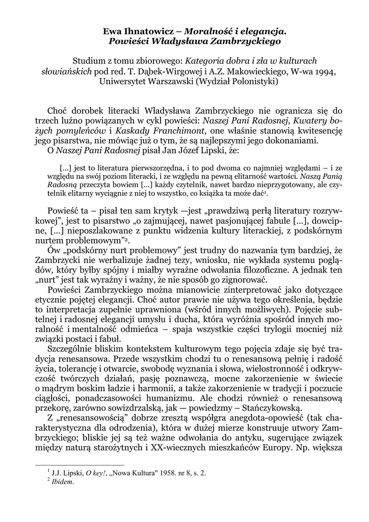 Ewa Ihnatowicz – Moralność i elegancja. Powieści Władysława Zambrzyckiego Studium z tomu zbiorowego: Kategoria dobra i zła w kulturach słowiańskich pod red. T. Dąbek-Wirgowej i A.Z. Makowieckiego, W-wa 1994, Uniwersytet Warszawski (Wydział Polonistyki) Choć dorobek literacki Władysława Zambrzyckiego nie ogranicza się do trzech luźno powiązanych w cykl powieści: Naszej Pani Radosnej, Kwatery bożych pomyleńców i Kaskady Franchimont, one właśnie stanowią kwitesencję jego pisarstwa, nie mówiąc już o tym, że są najlepszymi jego dokonaniami. O Naszej Pani Radosnej pisał Jan Józef Lipski, że: [...] jest to literatura pierwszorzędna, i to pod dwoma co najmniej względami – i ze względu na swój poziom literacki, i ze względu na pewną elitarność wartości. Naszą Panią Radosną przeczyta bowiem [...] każdy czytelnik, nawet bardzo nieprzygotowany, ale czytelnik elitarny wyciągnie z niej to wszystko, co książka ta może dać1. Powieść ta – pisał ten sam krytyk —jest „prawdziwą perłą literatury rozrywkowej”, jest to pisarstwo „o zajmującej, nawet pasjonującej fabule [...], dowcipne, [...] nieposzlakowane z punktu widzenia kultury literackiej, z podskórnym nurtem problemowym”2. Ów „podskórny nurt problemowy” jest trudny do nazwania tym bardziej, że Zambrzycki nie werbalizuje żadnej tezy, wniosku, nie wykłada systemu poglądów, który byłby spójny i miałby wyraźne odwołania filozoficzne. A jednak ten „nurt” jest tak wyraźny i ważny, że nie sposób go zignorować. Powieści Zambrzyckiego można mianowicie zinterpretować jako dotyczące etycznie pojętej elegancji. Choć autor prawie nie używa tego określenia, będzie to interpretacja zupełnie uprawniona (wśród innych możliwych). Pojęcie subtelnej i radosnej elegancji umysłu i ducha, która wyróżnia spośród innych moralność i mentalność odmieńca – spaja wszystkie części trylogii mocniej niż związki postaci i fabuł. Szczególnie bliskim kontekstem kulturowym tego pojęcia zdaje się być tradycja renesansowa. Przede wszystkim chodzi tu o renesansową pełnię i radość życia, tolerancję i otwarcie, swobodę wyznania i słowa, wielostronność i odkrywczość twórczych działań, pasję poznawczą, mocne zakorzenienie w świecie o mądrym boskim ładzie i harmonii, a także zakorzenienie w tradycji i poczucie ciągłości, ponadczasowości humanizmu. Ale chodzi również o renesansową przekorę, zarówno sowizdrzalską, jak — powiedzmy – Stańczykowską. Z „renesansowością” dobrze zresztą współgra anegdota-opowieść (tak charakterystyczna dla odrodzenia), która w dużej mierze konstruuje utwory Zambrzyckiego; bliskie jej są też ważne odwołania do antyku, sugerujące związek między naturą starożytnych i XX-wiecznych mieszkańców Europy. Np. większa 1 2 J.J. Lipski, O key!, „Nowa Kultura" 1958. nr 8, s. 2. Ibidem. część akcji Naszej Pani Radosnej dzieje się w starożytnej Pompei, w której mimo innego obyczaju ludzie tak samo myślą i czują jak przybysze z XX wieku, a w Kaskadzie Franchimont podobny sens ma wtrącona nowela pana Ksawerego o biskupie. Wreszcie środkowa powieść, Kwatera bożych pomyleńców, zawiera aluzję do Dekameronu: strukturalne podobieństwa do utworu Boccaccia idą w parze z podobieństwem pytań etycznych, na które jednak Zambrzycki zdaje się odpowiadać inaczej niż autor Dekameronu3. Także odmieniec Zambrzyckiego nie wygląda na dekadenta, anarchistę ani na szydercę, lecz właśnie na renesansowo mądrego kpiarza, który bywa chętnie godnym i pogodnym mieszczaninem, jeśli gdzieś zagrzeje miejsce. Odmieńcy są bohaterami wszystkich trzech powieści. Odmieńcy – to znaczy ludzie odmiennie myślący i czujący. Punktem odniesienia jest z jednej strony oficjalność, z drugiej – szarość, przeciętność, sztampa, wtórność. Odmieńcy, tak jak osoby wtajemniczone, rozpoznają się natychmiast nawet na odległość, i to bez względu na kraj i epokę historyczną. To ważne, bo pytaniu o normę moralną towarzyszy (w każdej powieści z osobna i w całej trylogii) pytanie o ciągłość kultury, która jest na niej oparta. Ponadczasowa jest właśnie sytuacja opozycji w stosunku do oficjalności i przeciętności. Indywidualiści nie mogą się zmieścić w ramach kodeksu prawnego i obyczajowego, nacechowanego i oficjalnością, i przeciętnością. Powiada jeden z nich: Mam słabość, Błażejku, do ludzi, którzy żyją inaczej niż im to nakazują gubernatorzy. Nasz wagabunda nie może się zmieścić w narzuconym wzorku. Woli zachrypnąć sprzedając kartoniki ze skrawkami kogucich piór niż zastosować się do urzędowego rozkładu życia. Taki się już widać urodził, nie potrafi być inny. [...] Każda stolica ma własny poczet odmieńców, dziwaków, wagabundów, oryginałów i wolnych duchów. [...] Siebie samego też [do nich] zaliczam, bo nigdy dotąd budzik nie podrywał mnie z łóżka4. Budzik uosabia nie tylko nakaz życia na utartym i ciasnym szlaku, ale także represje za odstępstwo. Prawnik (ojciec Błażeja z Kaskady Franchimont) jest podwójnie przedstawicielem represjonującego kodeksu: jako prawnik właśnie i jako ojciec żądający od syna bezwzględnego podporządkowania się obmyślone3 Literacką analogię między okupowaną Warszawą a Florencją ogarniętą zarazą zauważył wcześniej S. Lichański (Na śmierć Diogenesa, (w:) tenże, Cienie i profile, Warszawa 1967, s. 260). Sądzę, że ta analogia nie jest powierzchowną aluzją, lecz decyduje o etycznym sensie Kwatery bożych pomyleńców, Konwencję Dekameronu Zambrzycki realizuje wyraźnie i konsekwentnie, jakby chciał potwierdzić jej uniwersalną przydatność do literackiego tematu miasta objętego zaraząkatastrofą, a z drugiej strony odnaleźć pocieszającą powtarzalność katastrofy, którą da się opisać w tylekroć wypróbowany sposób. Ale w spotkaniu z katastro