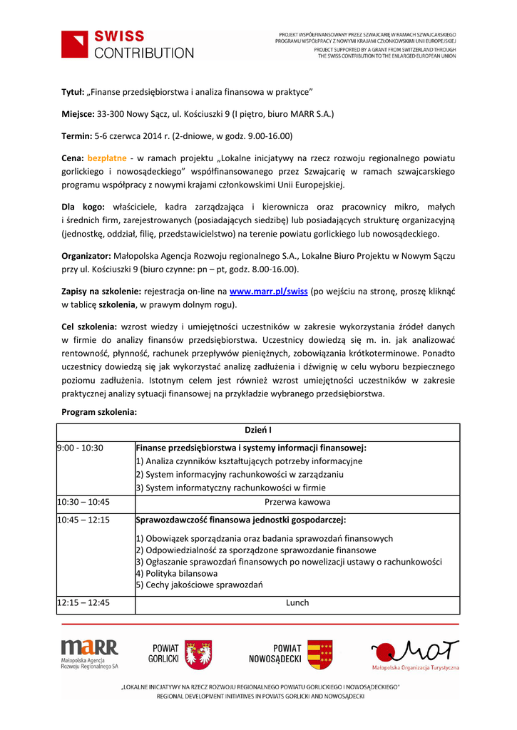 Tytuł: „Finanse przedsiębiorstwa i analiza finansowa w praktyce” Miejsce: 33-300 Nowy Sącz, ul. Kościuszki 9 (I piętro, biuro MARR S.A.) Termin: 5-6 czerwca 2014 r. (2-dniowe, w godz. 9.00-16.00) Cena: bezpłatne - w ramach projektu „Lokalne inicjatywy na rzecz rozwoju regionalnego powiatu gorlickiego i nowosądeckiego” współfinansowanego przez Szwajcarię w ramach szwajcarskiego programu współpracy z nowymi krajami członkowskimi Unii Europejskiej. Dla kogo: właściciele, kadra zarządzająca i kierownicza oraz pracownicy mikro, małych i średnich firm, zarejestrowanych (posiadających siedzibę) lub posiadających strukturę organizacyjną (jednostkę, oddział, filię, przedstawicielstwo) na terenie powiatu gorlickiego lub nowosądeckiego. Organizator: Małopolska Agencja Rozwoju regionalnego S.A., Lokalne Biuro Projektu w Nowym Sączu przy ul. Kościuszki 9 (biuro czynne: pn – pt, godz. 8.00-16.00). Zapisy na szkolenie: rejestracja on-line na www.marr.pl/swiss (po wejściu na stronę, proszę kliknąć w tablicę szkolenia, w prawym dolnym rogu). Cel szkolenia: wzrost wiedzy i umiejętności uczestników w zakresie wykorzystania źródeł danych w firmie do analizy finansów przedsiębiorstwa. Uczestnicy dowiedzą się m. in. jak analizować rentowność, płynność, rachunek przepływów pieniężnych, zobowiązania krótkoterminowe. Ponadto uczestnicy dowiedzą się jak wykorzystać analizę zadłużenia i dźwignię w celu wyboru bezpiecznego poziomu zadłużenia. Istotnym celem jest również wzrost umiejętności uczestników w zakresie praktycznej analizy sytuacji finansowej na przykładzie wybranego przedsiębiorstwa. Program szkolenia: Dzień I 9:00 - 10:30 10:30 – 10:45 Finanse przedsiębiorstwa i systemy informacji finansowej: 1) Analiza czynników kształtujących potrzeby informacyjne 2) System informacyjny rachunkowości w zarządzaniu 3) System informatyczny rachunkowości w firmie Przerwa kawowa 10:45 – 12:15 Sprawozdawczość finansowa jednostki gospodarczej: 1) Obowiązek sporządzania oraz badania sprawozdań finansowych 2) Odpowiedzialność za sporządzone sprawozdanie finansowe 3) Ogłaszanie sprawozdań finansowych po nowelizacji ustawy o rachunkowości 4) Polityka bilansowa 5) Cechy jakościowe sprawozdań 12:15 – 12:45 Lunch 12:45 – 14:15 Sprawozdanie finansowe firmy – źródłem danych do analizy: 1) Bilans – sprawozdanie z sytuacji finansowej 2) Rachunek zysków i strat – sprawozdanie z całkowitych dochodów 3) Rachunek przepływów pieniężnych - sprawozdanie z przepływów pieniężnych 4) Zestawienie zmian w kapitale własnym – sprawozdanie ze zmian w kapitale własnym Narzędzia pracy: wykład, przykłady, ćwiczenia 14:15 – 14:30 14:30 – 16:00 Przerwa kawowa Analiza kondycji finansowej przedsiębiorstwa: 1) Wskaźnik płynności 2) Wskaźnik rentowności 3)Wskaźnik obrotowości Narzędzia pracy: wykład, przykłady, ćwiczenia Dzień II 9:00 – 10:30 Źródła finansowania przedsiębiorstwa: 1) Kredyt bankowy 2) Dotacje Narzędzia pracy: wykład, przykłady 10:30 – 10:45 10:45 – 12:15 Przerwa kawowa Zasady ustalania wyniku finansowego 1) Definiowanie pojęć 2) Klasyfikacja i zasady pomiaru przychodów i kosztów 3) Zasady prezentacji w sprawozdaniu finansowym 4) Zasady ewidencji Narzędzia pracy: wykład, przykłady, ćwiczenia. 12:15 – 12:45 12:45 – 14:15 Lunch Polityka rachunkowości, błędy lat poprzednich i zdarzenia po dniu bilansowym 1. Istota polityki rachunkowości, 2. Zmiany polityki rachunkowości jednostki – jej przyczyny i skutki, 3. Błędy lat poprzednich, 4. Zdarzenia po dniu bilansowym. Narzędzia pracy: wykład, przykłady, ćwiczenia 14:15 – 14:30 14:30 – 16:00 Przerwa kawowa Najczęściej popełniane błędy przy sporządzaniu sprawozdania finansowego Analiza sytuacji finansowej w wybranych przedsiębiorstwach Narzędzia pracy: wykład, przykłady, ćwiczenia W ramach szkolenia MARR S.A. zapewnia materiały szkoleniowe, zaświadczenia o ukończeniu szkolenia, zaświadczenia o uzyskanej pomocy de minimis oraz catering. TRENERKA: Ewelina Słomka Absolwentka Akademii Krakowskiej na kierunku administracja, ukończyła również podyplomowe studia "Rachunkowość i finanse dla zaawansowanych" prowadzone przez Stowarzyszenie Księgowych w Polsce i Krakowską Szkołą Biznesu Uniwersytetu Ekonomicznego w Krakowie oraz studia podyplomowe prowadzone przez Katedrę Prawa na Wydziale Finansów UE w Krakowie w zakresie doradztwa podatkowego. Członek Stowarzyszenia Księgowych w Polsce O/ Terenowy W Nowym Sączu. Doświadczony trener w zakresie podatków i księgowości, ale przede wszystkim praktyk. Posiada 7-letnie doświadczenie pracy w zakresie podatków i rachunkowości, które zdobyła pracując jako samodzielny księgowy w biurach rachunkowych odpowiadając za rozliczenia firm działających w różnych dziedzinach. Na bieżąco poszerza i aktualizuje zdobytą wiedzę poprzez kursy i szkolenia w zakresie podatków i rachunkowości. Wykorzystując swoje doświadczenie zawodowe, w przeprowadzanych szkoleniach przedstawia praktyczne podejście do omawianych aspektów. Liczba miejsc ograniczona, decyduje kolejność zgłoszeń! Pytania? Tel. 18 262 12 76 Zapisz się już dziś www.marr.pl/swiss